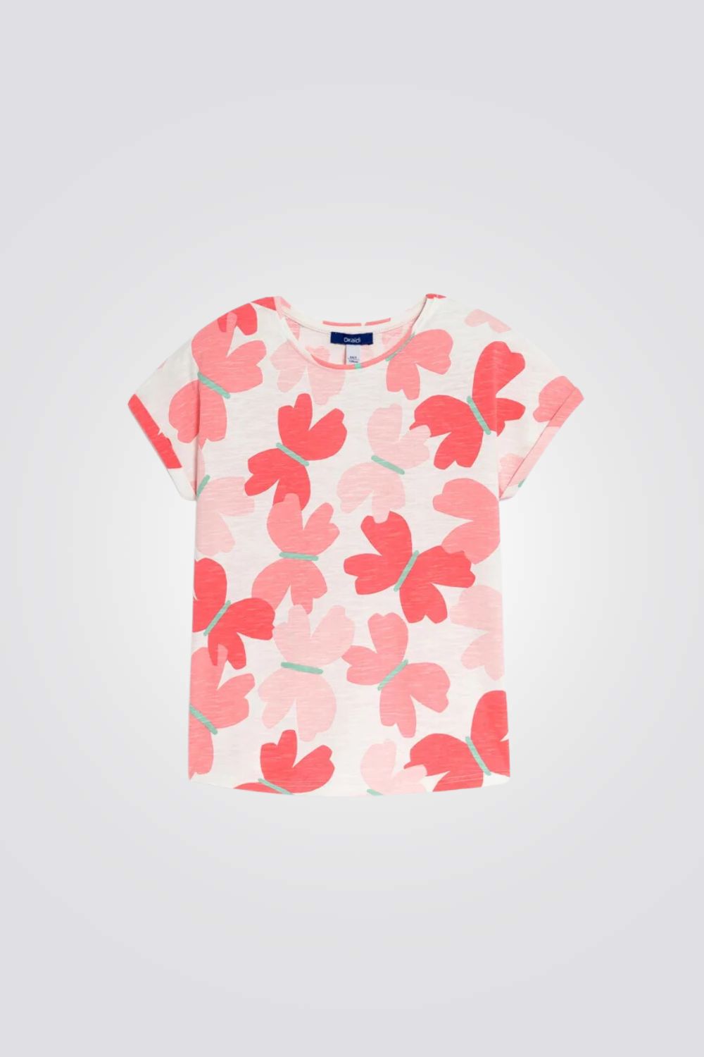 טישירט לילדות מבית המותג OKAIDI, עם הדפס פרפרים ורודים , בד קליל מושלם לימי הקיץ, בגזרה ישרה וצווארון עגול.