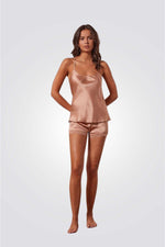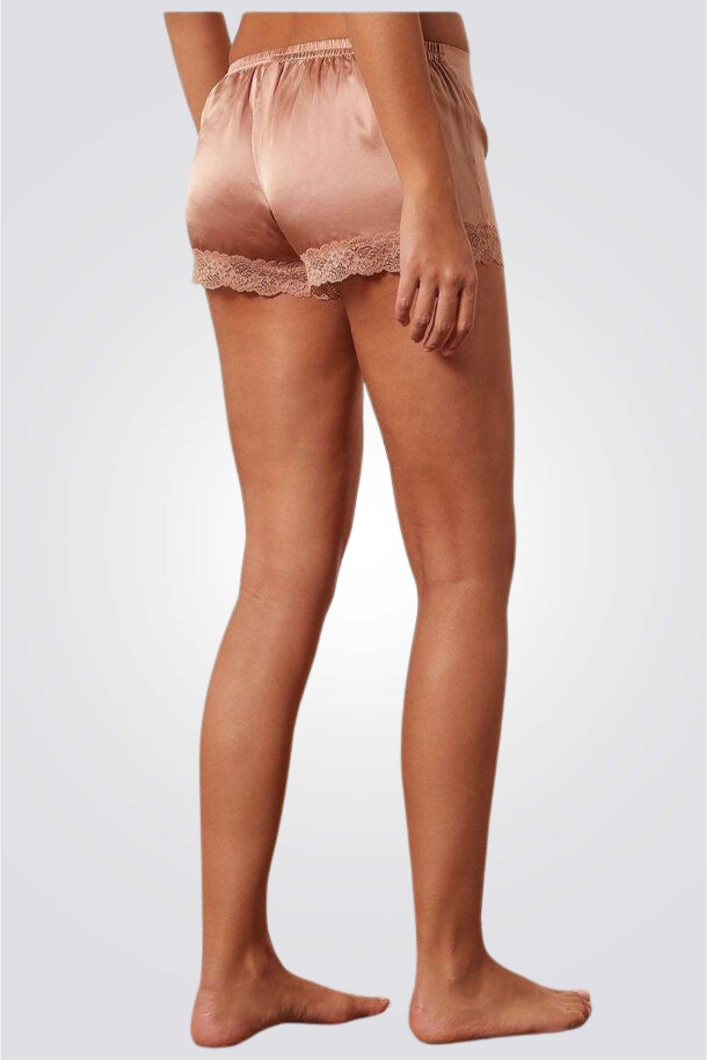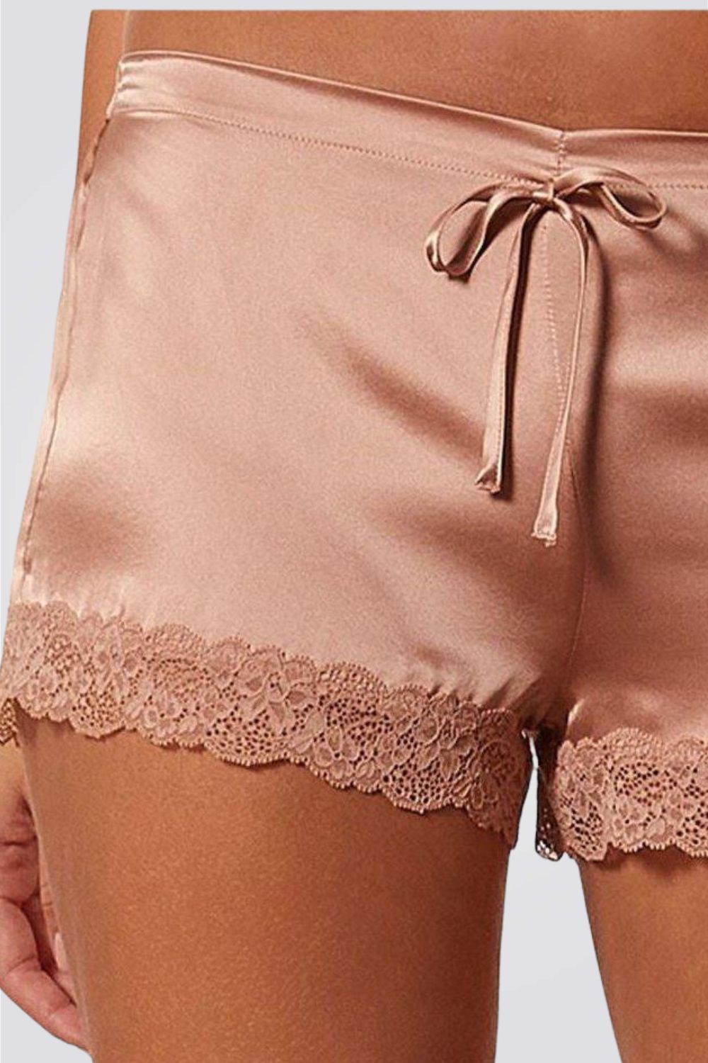 מכנסיים קצרים מבית המותג הצרפתי ETAM עשויים משי טהור, דק ועדין, בעל תכונות תרמיות: שומר על חום הגוף בחורף ומצנן בקיץ. עם מותן אלסטית ושרוך קשירה, בגימור פס תחרה פרחונית.