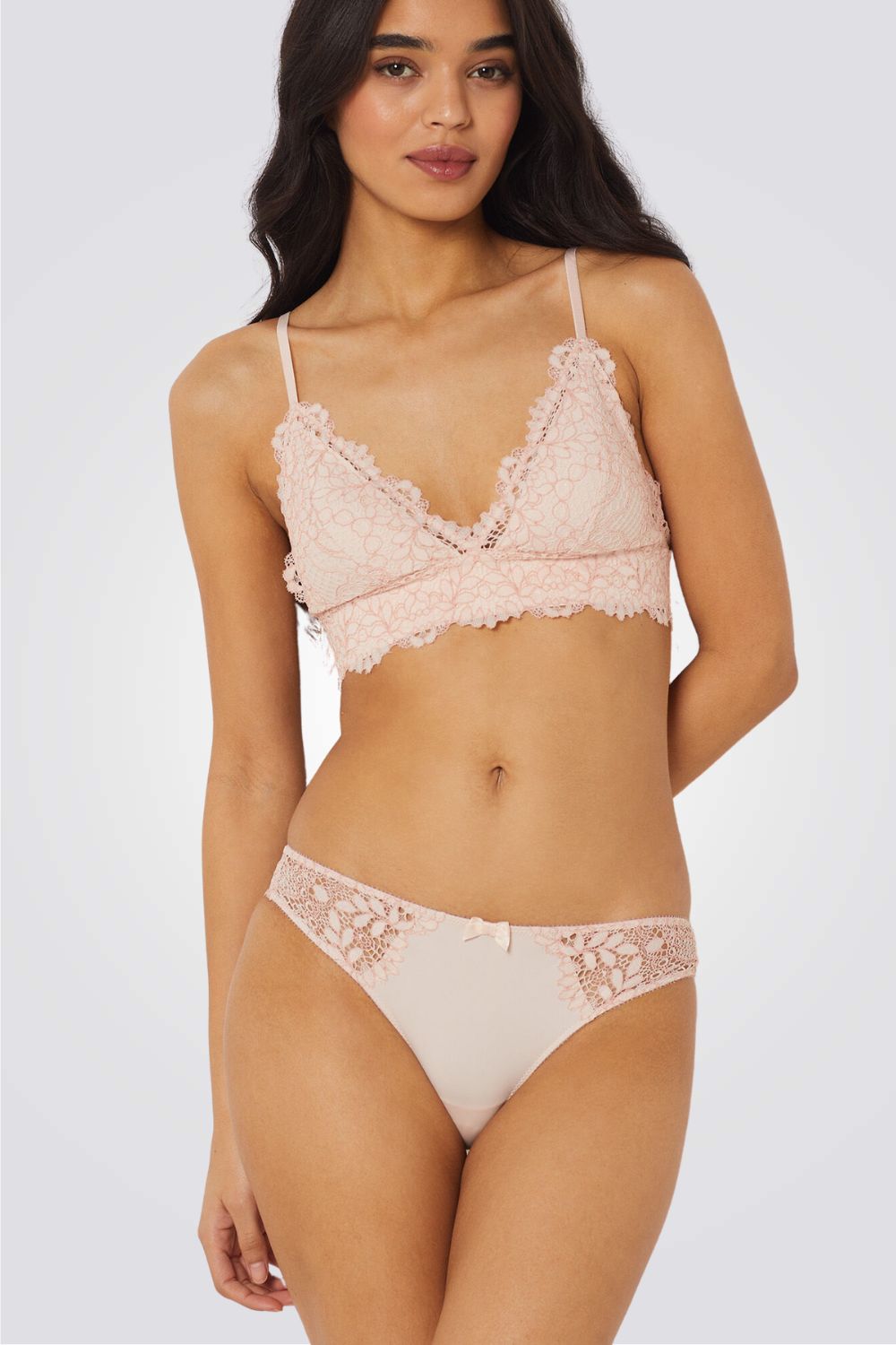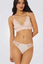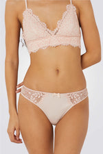 תחתונים בגזרת היפסטר מבית המותג הצרפתי ETAM עשויים תחרה פרחונית עדינה משולבת בבד מיקרופייבר רך בחלק הקדמי ועיטור פפיון במרכז.