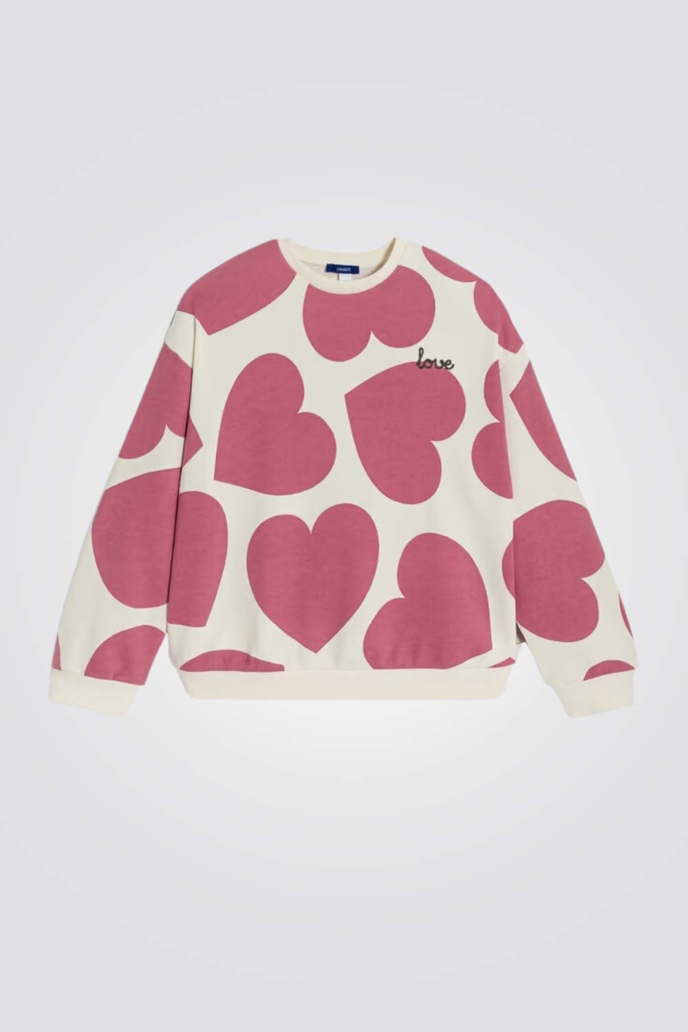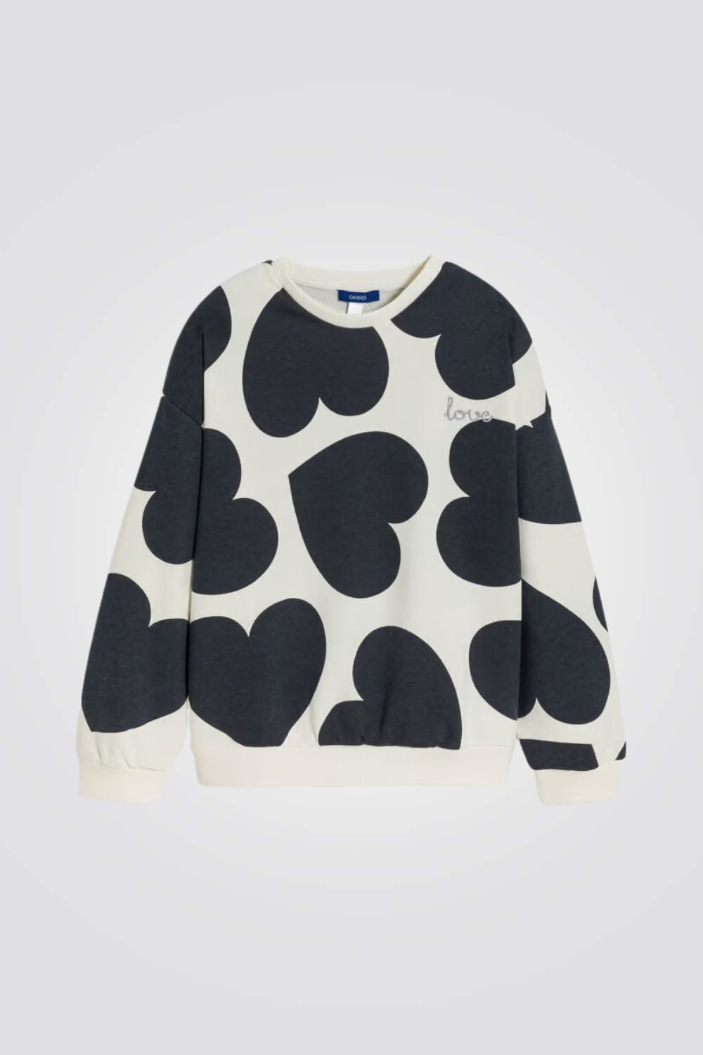 סווטשירט לילדות מבית המותג OKAIDI, מחמם ,נעים ונוח עם הדפס לבבות וצווארון עגול.