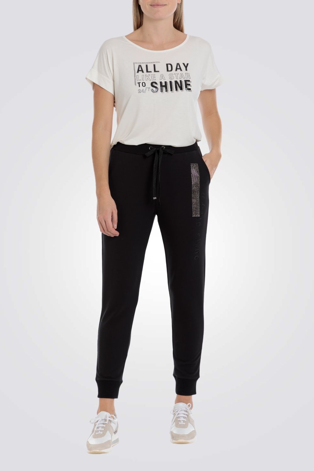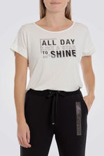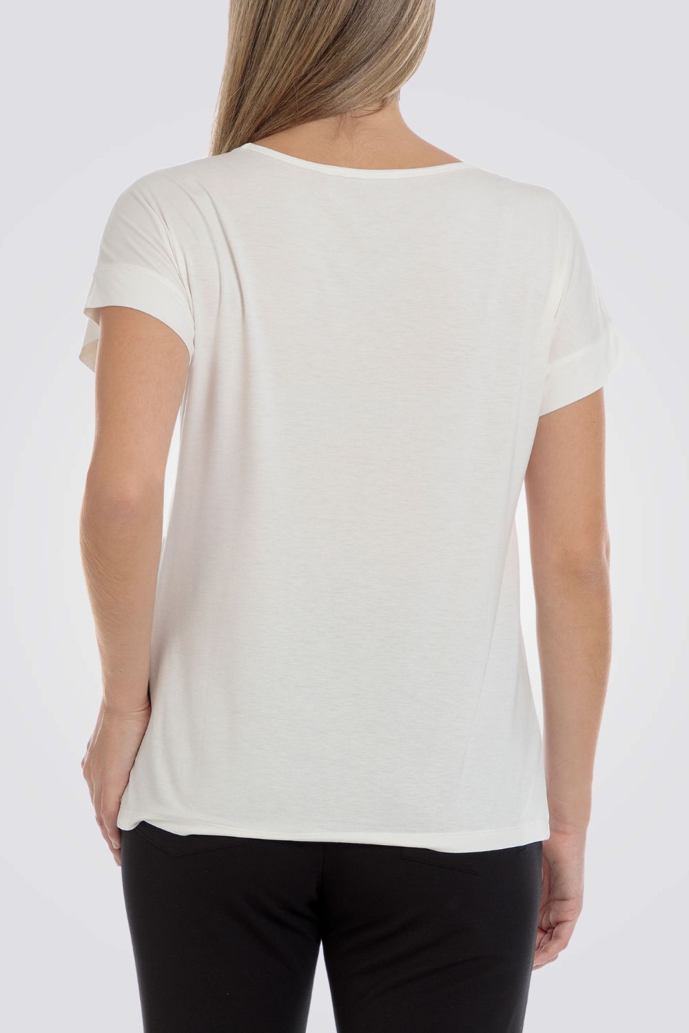 חולצה לבנה מבד נעים עם כיתוב ואבני חן, צווארון עגול, שרוולים קצרים.