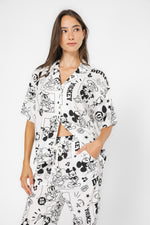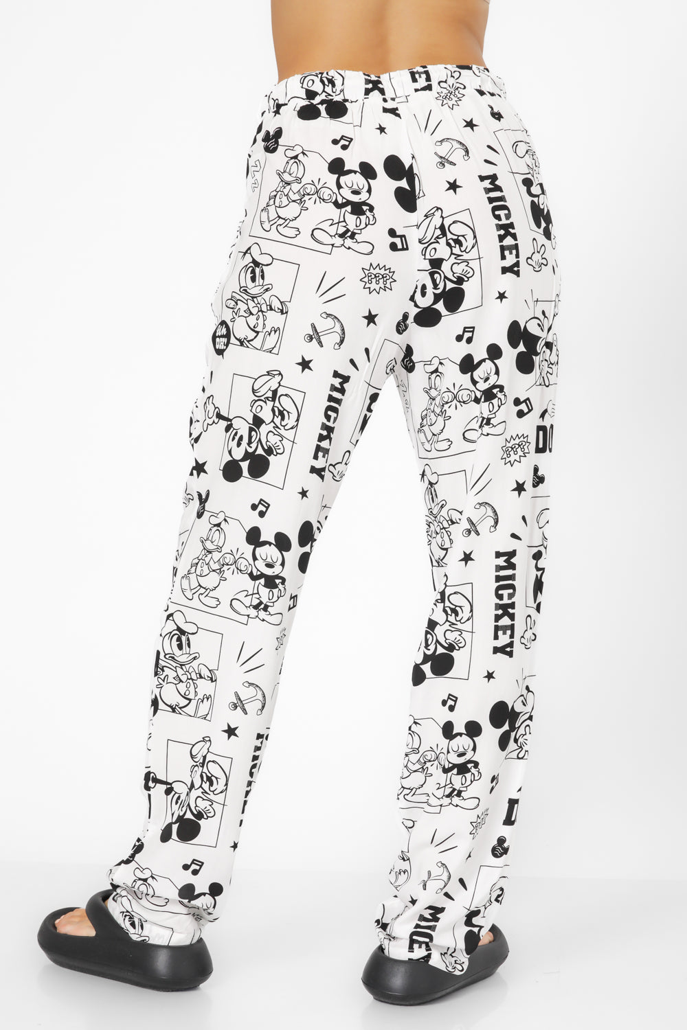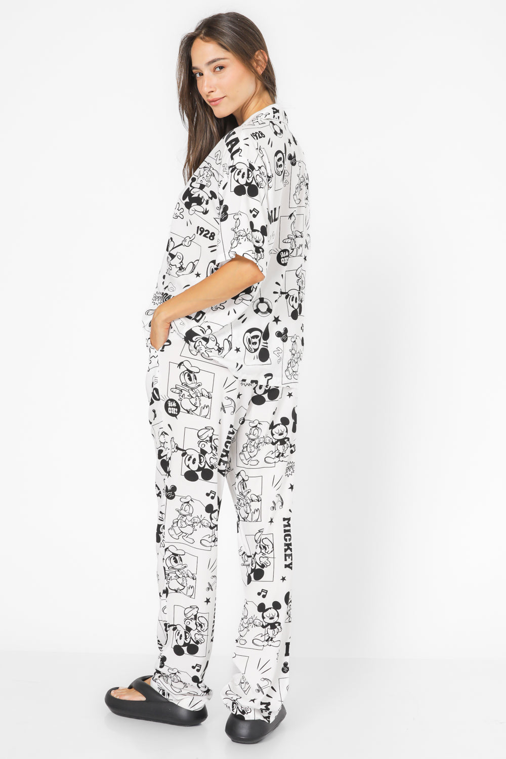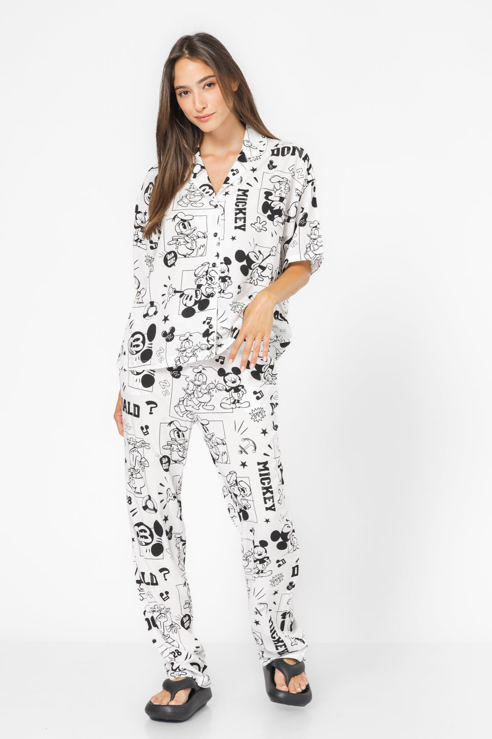 סט מבד אריג דק ונעים במיוחד בהדפס מיקי מאוס וחברים. חולצה מכופתרת עם צווארון משולשים ושרוולים קצרים ומכנסיים ארוכים בגזרה ישרה עם גומי במותניים וכיסים.