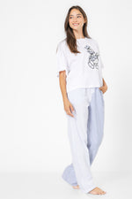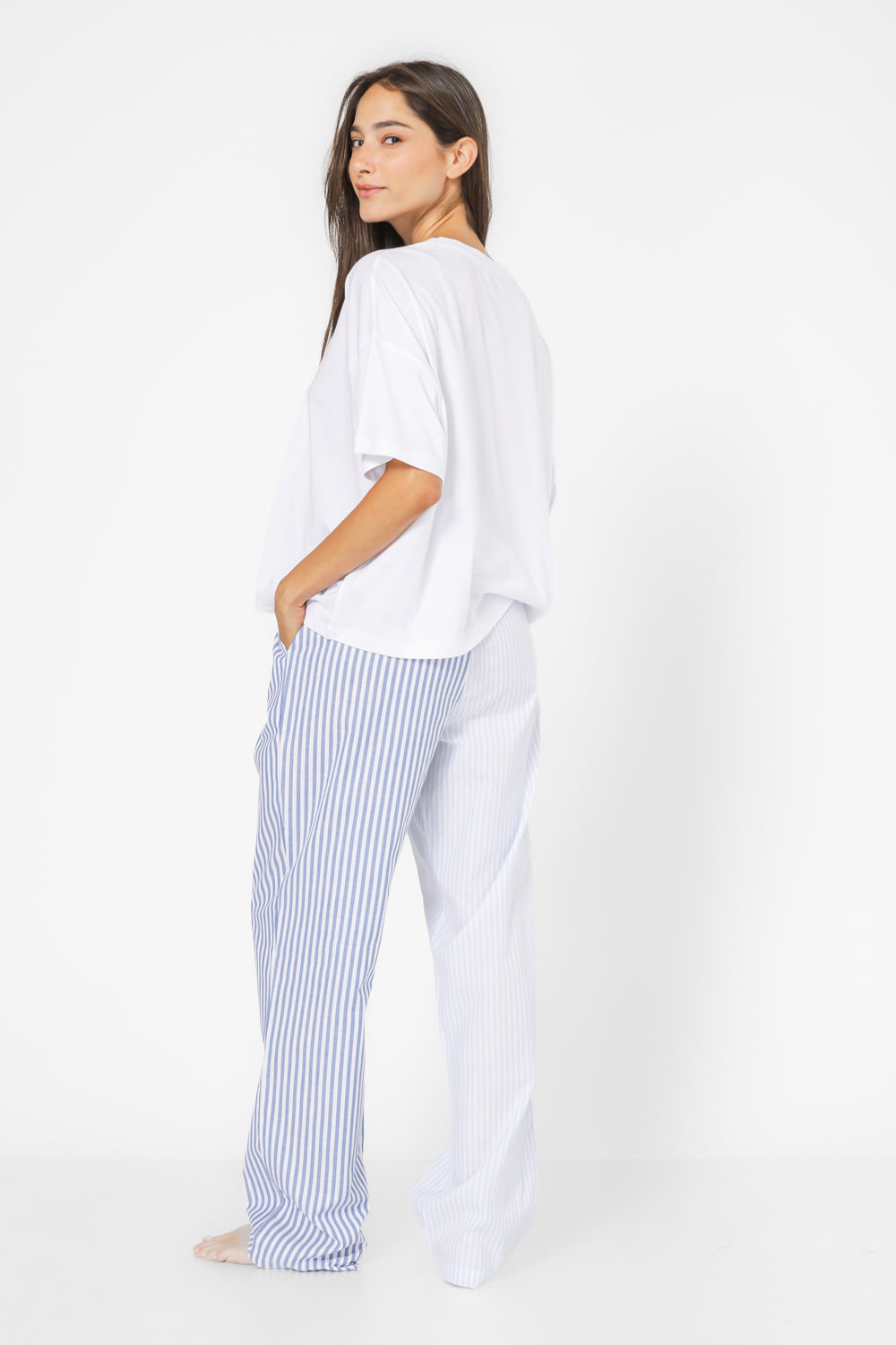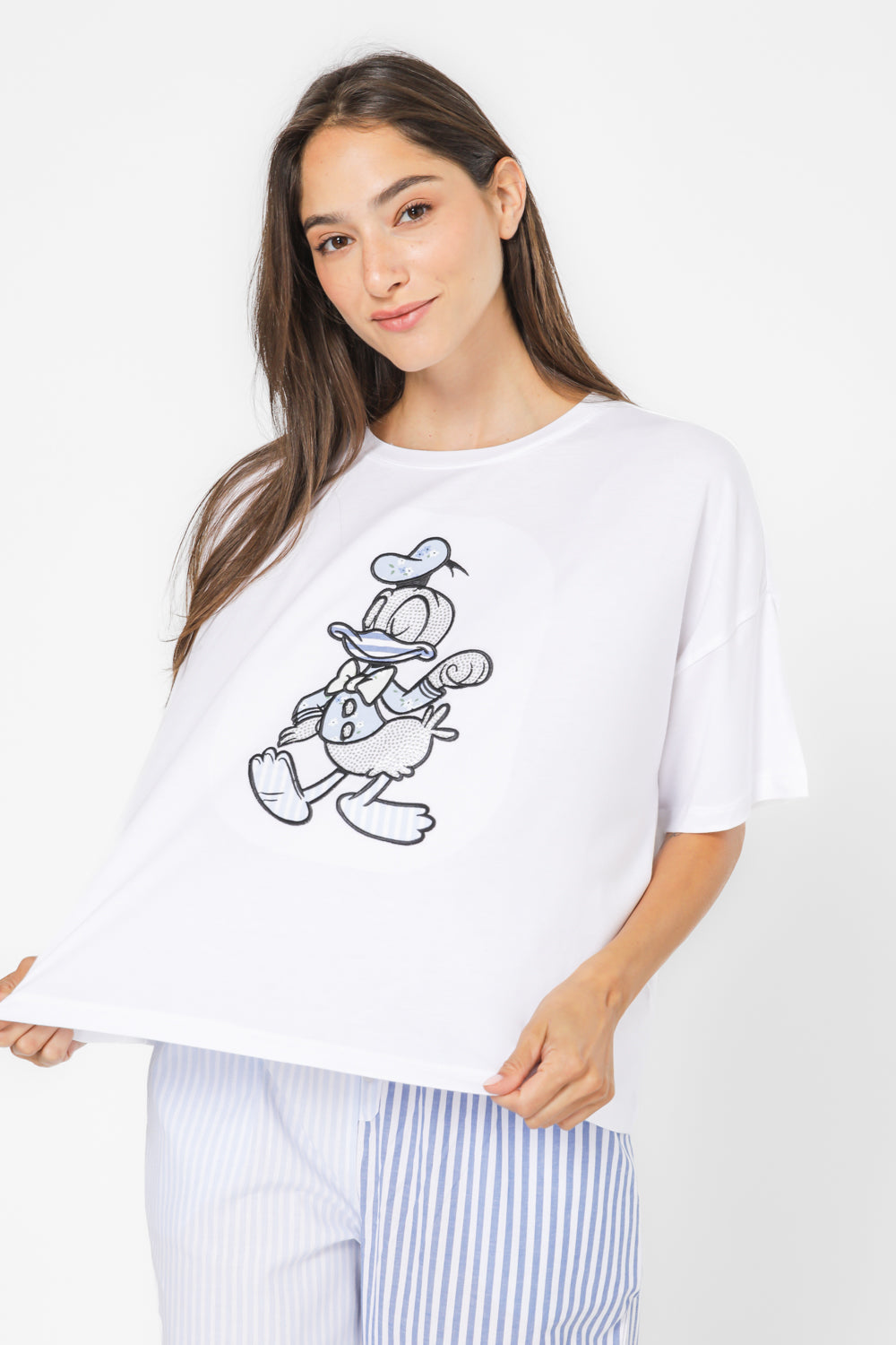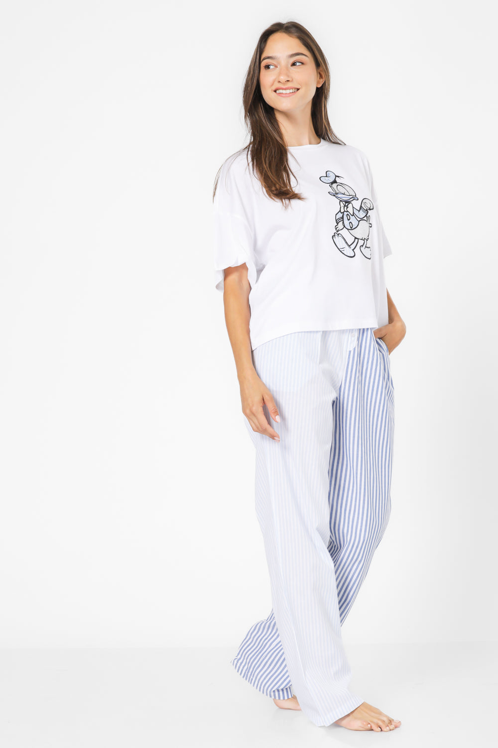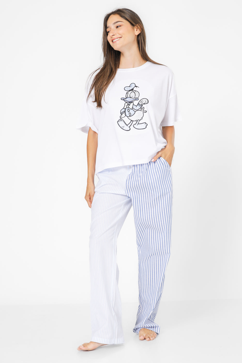 סט מבד אריג דק ונעים במיוחד בהדפס דונלד דאק. חולצה מכופתרת עם צווארון משולשים ושרוולים קצרים ומכנסיים ארוכים בגזרה ישרה עם גומי במותניים וכיסים בצדדים.