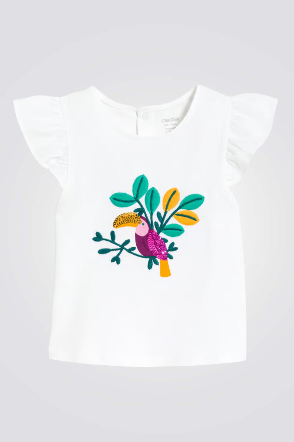 חולצה לתינוקות מבית המותג OBAIBI, בצבע לבן עם הדפס מתוק של תוכי ושרוולי מלמלה.