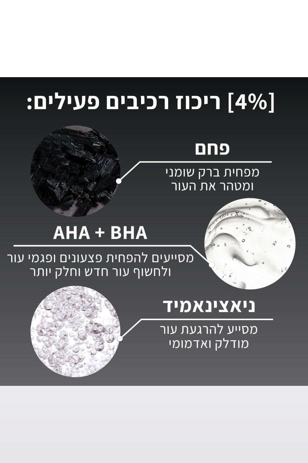 סרום לעור הפנים עם פחם, 4% BHA + AHA + ניאצינאמיד, מפחית מראה פגמי עור [ 44%-] מסייע בהפחתת פצעונים
