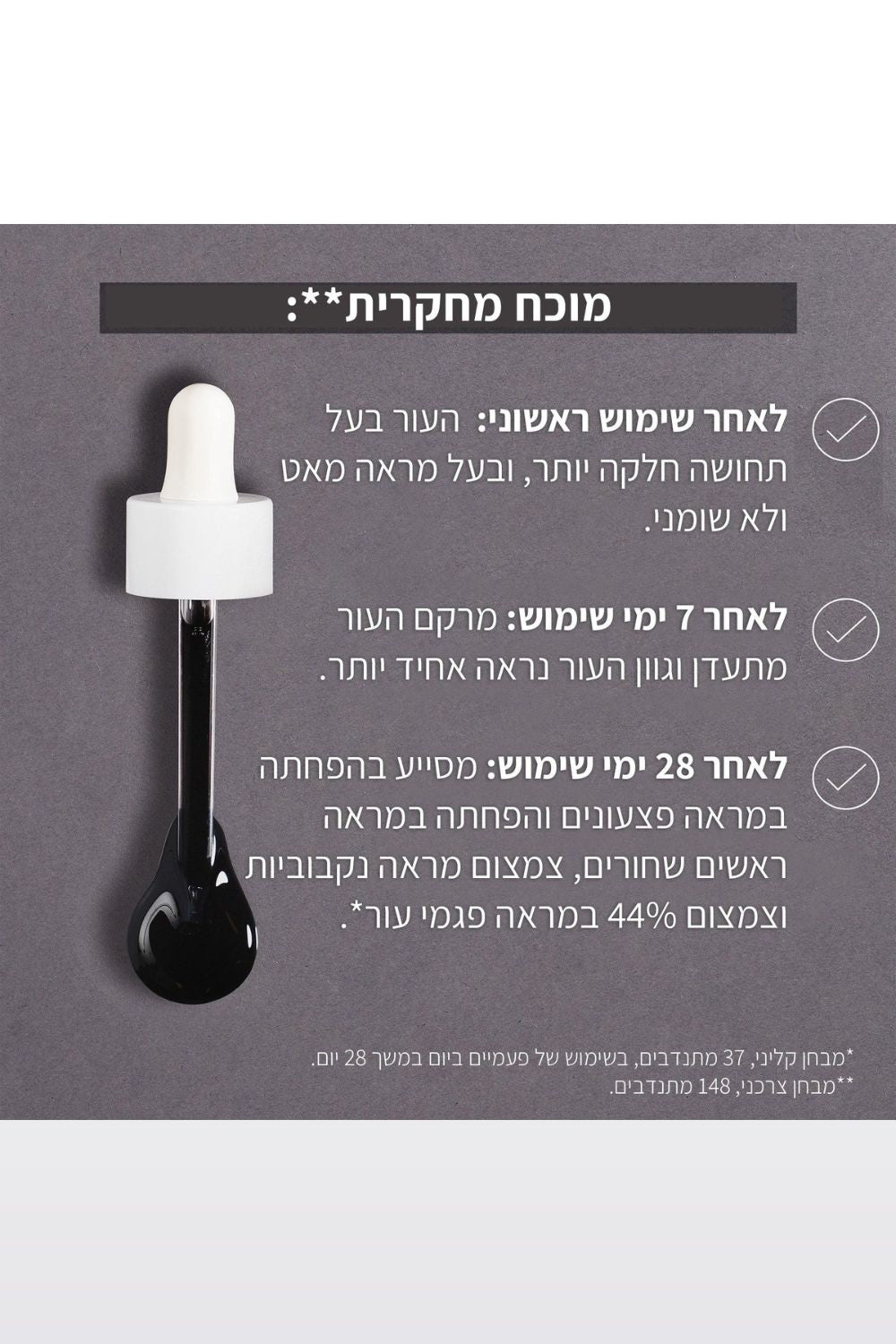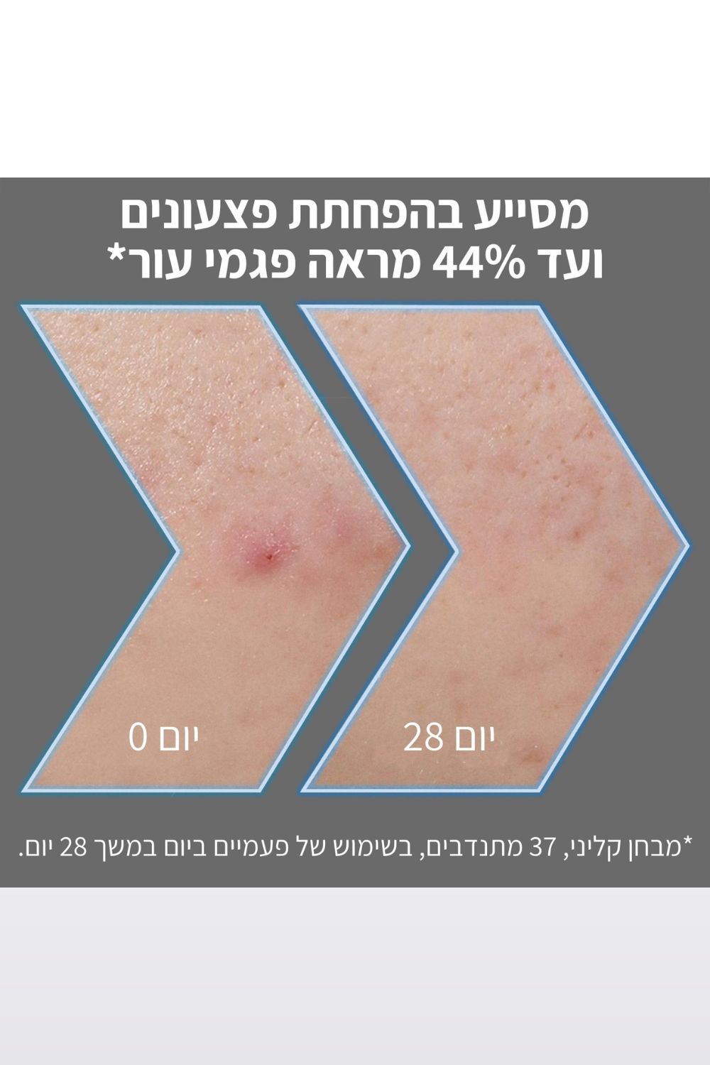 לאחר 28 ימי שימוש, מסייע בהפחתה במראה הפצעונים והפחתה במראה ראשים שחורים, צמצום מראה נקבוביות וצמצום -44% במראה פגמי עור.