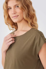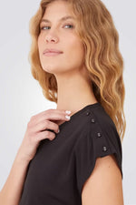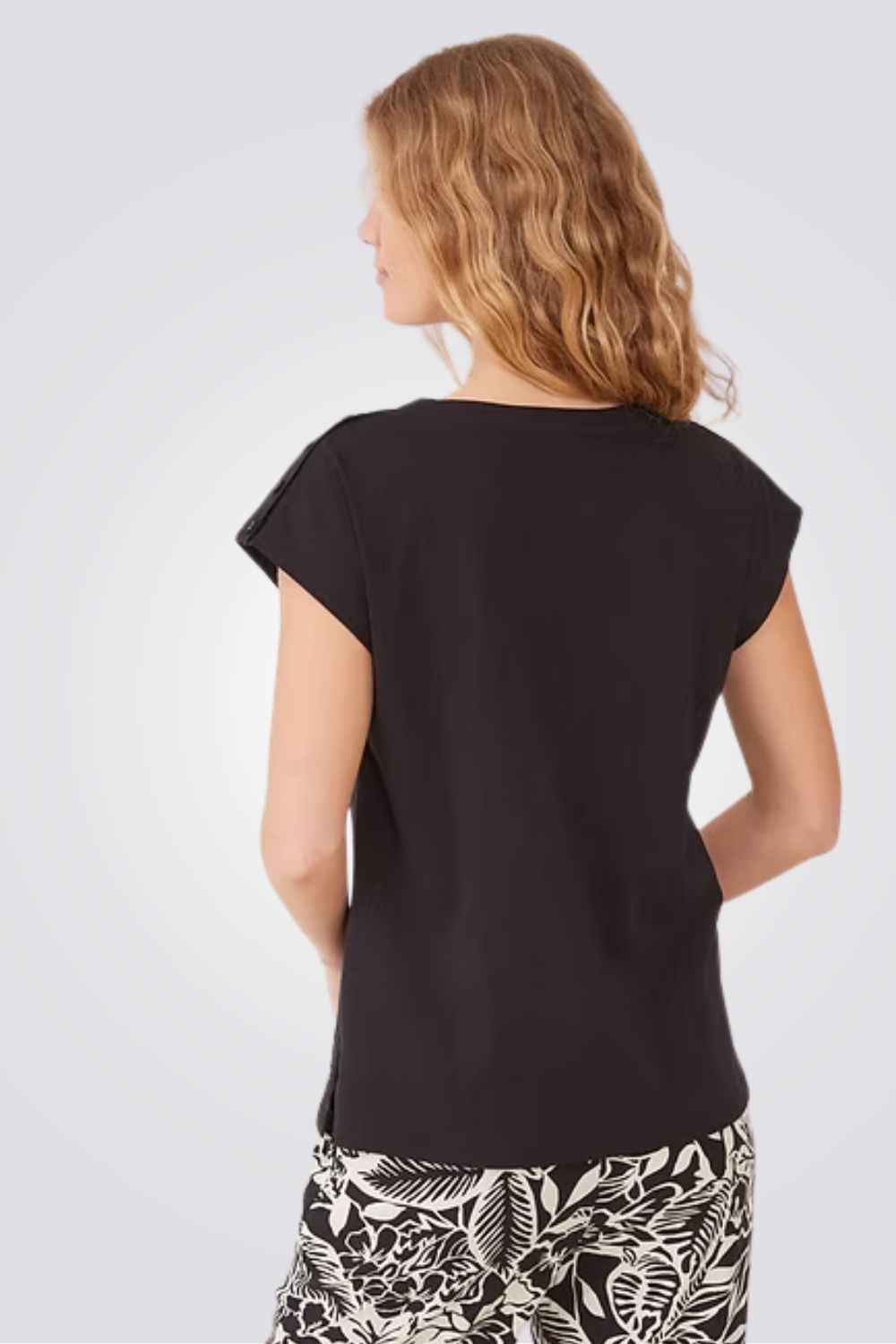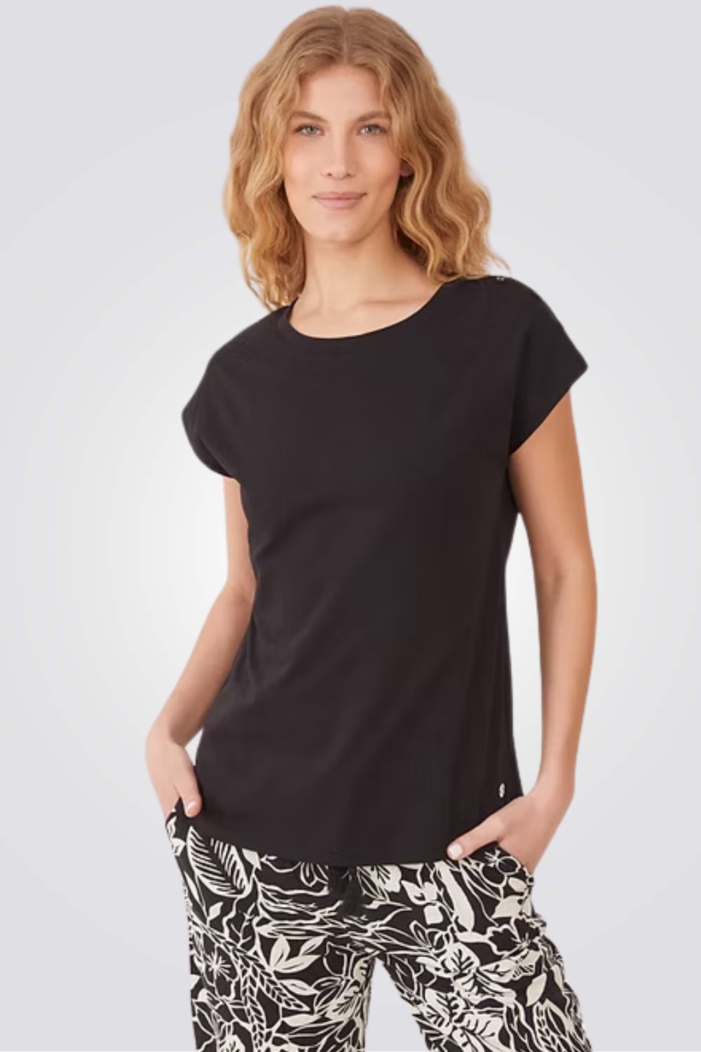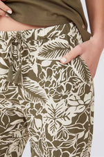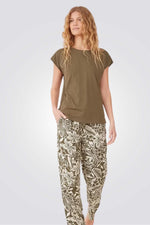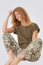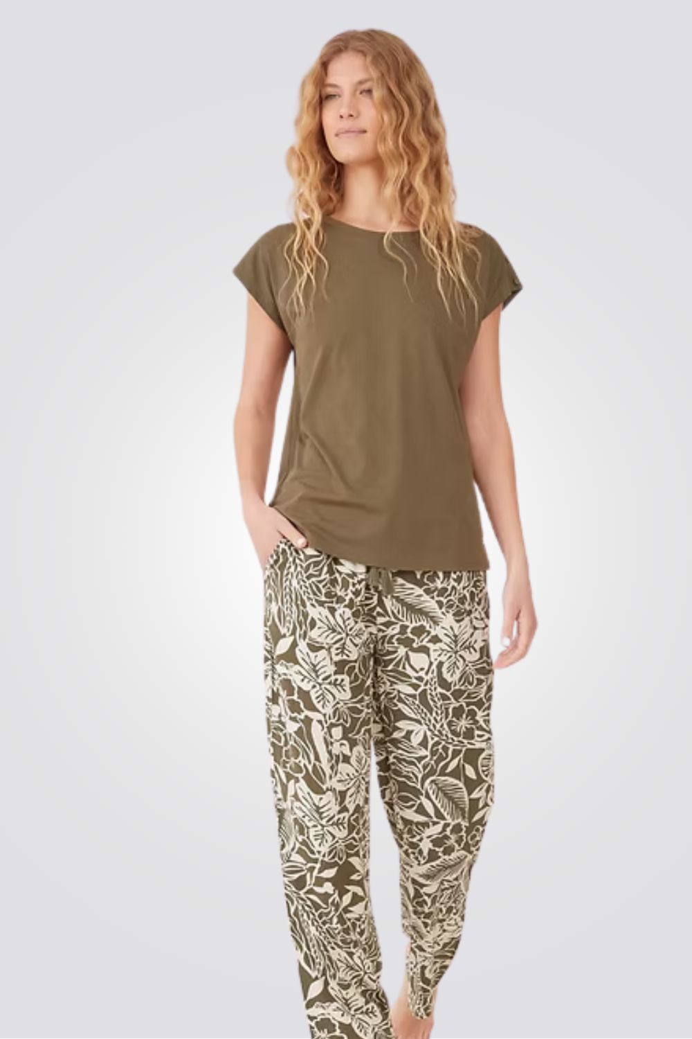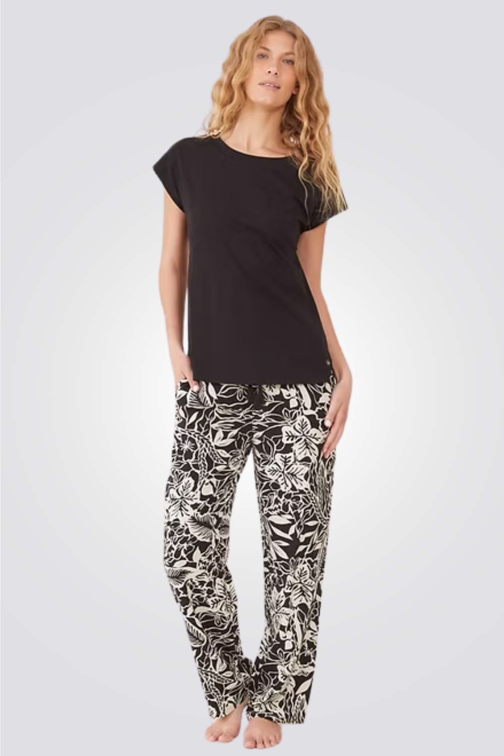 הסט מורכב ממכנסיים ארוכים עם מותן אלסטית וכיסים צדדיים בעיצוב פרחוני יחד עם חולצה חלקה עם שרוולים קצרים.