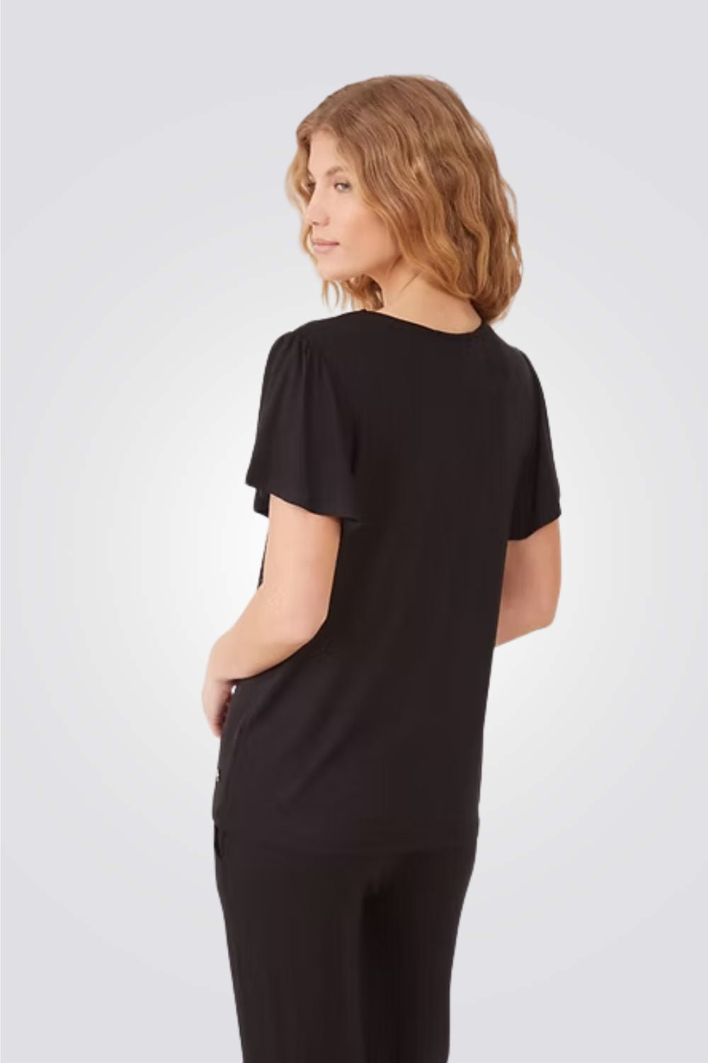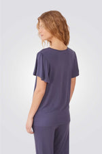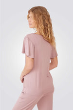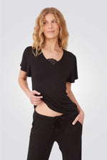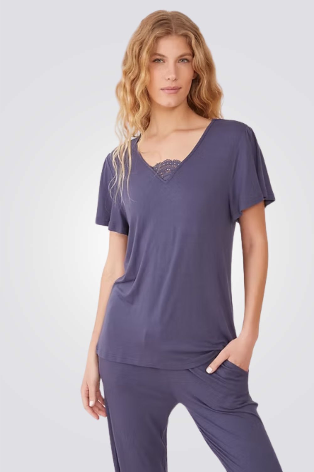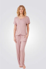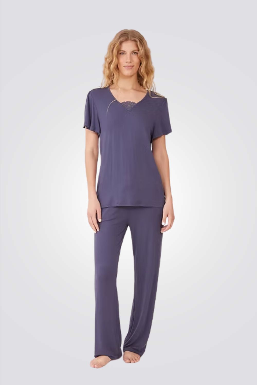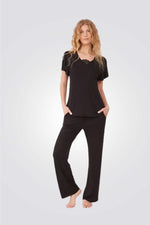 הסט מורכב ממכנסיים ארוכים עם מותן אלסטית וחולצה בעלת שרוול קצר עם עיטור תחרה במחשוף.