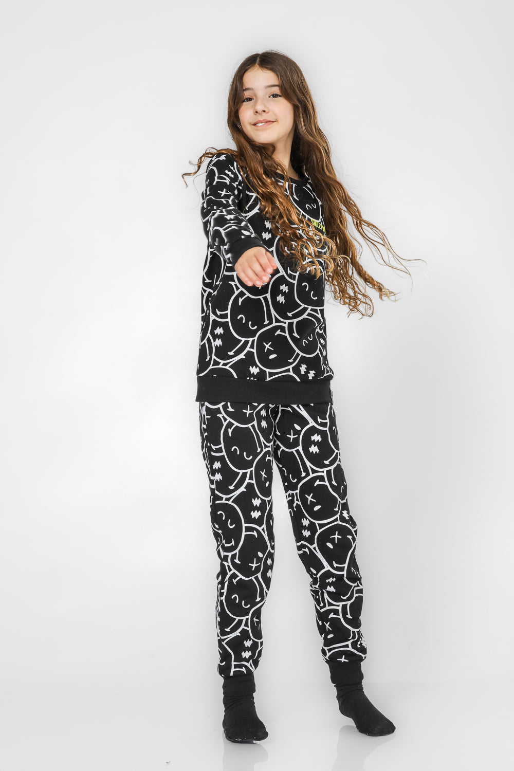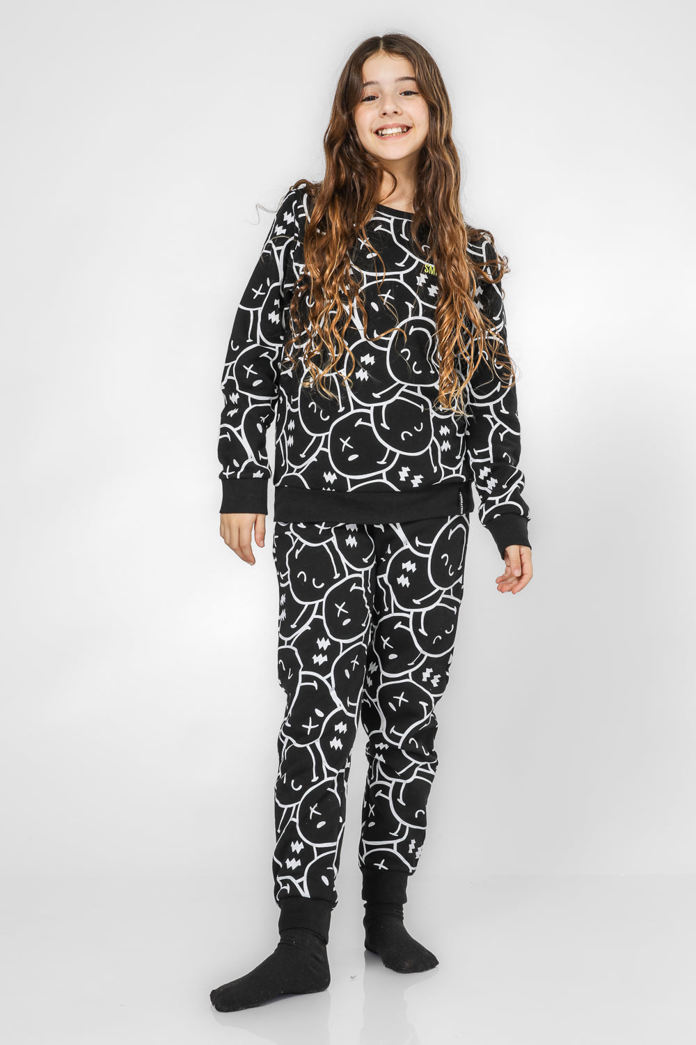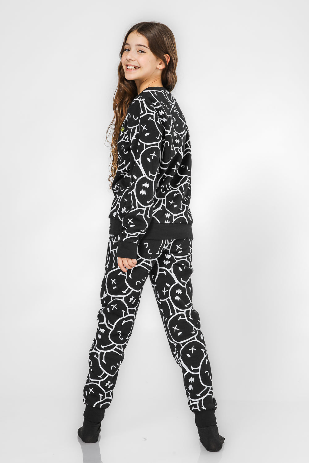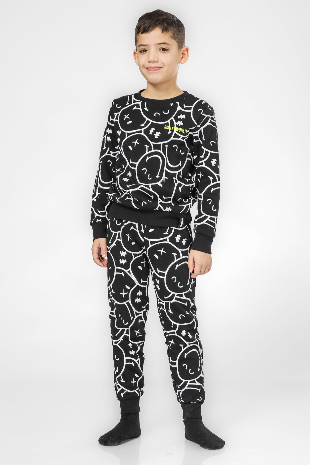 סט חולצה ומכנסיים מבד פוטר נעים בהדפס סמיילי. חולצה עם צווארון עגול ושרוולים ארוכים בסיומת מנג’ט, מכנסיים ארוכים בסיומת מנג’ט עם עם גומי במותניים ושרוכי קשירה.
