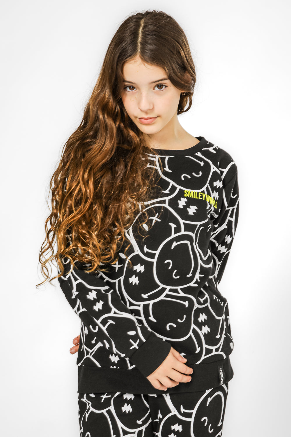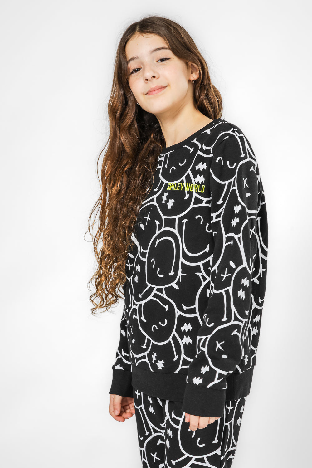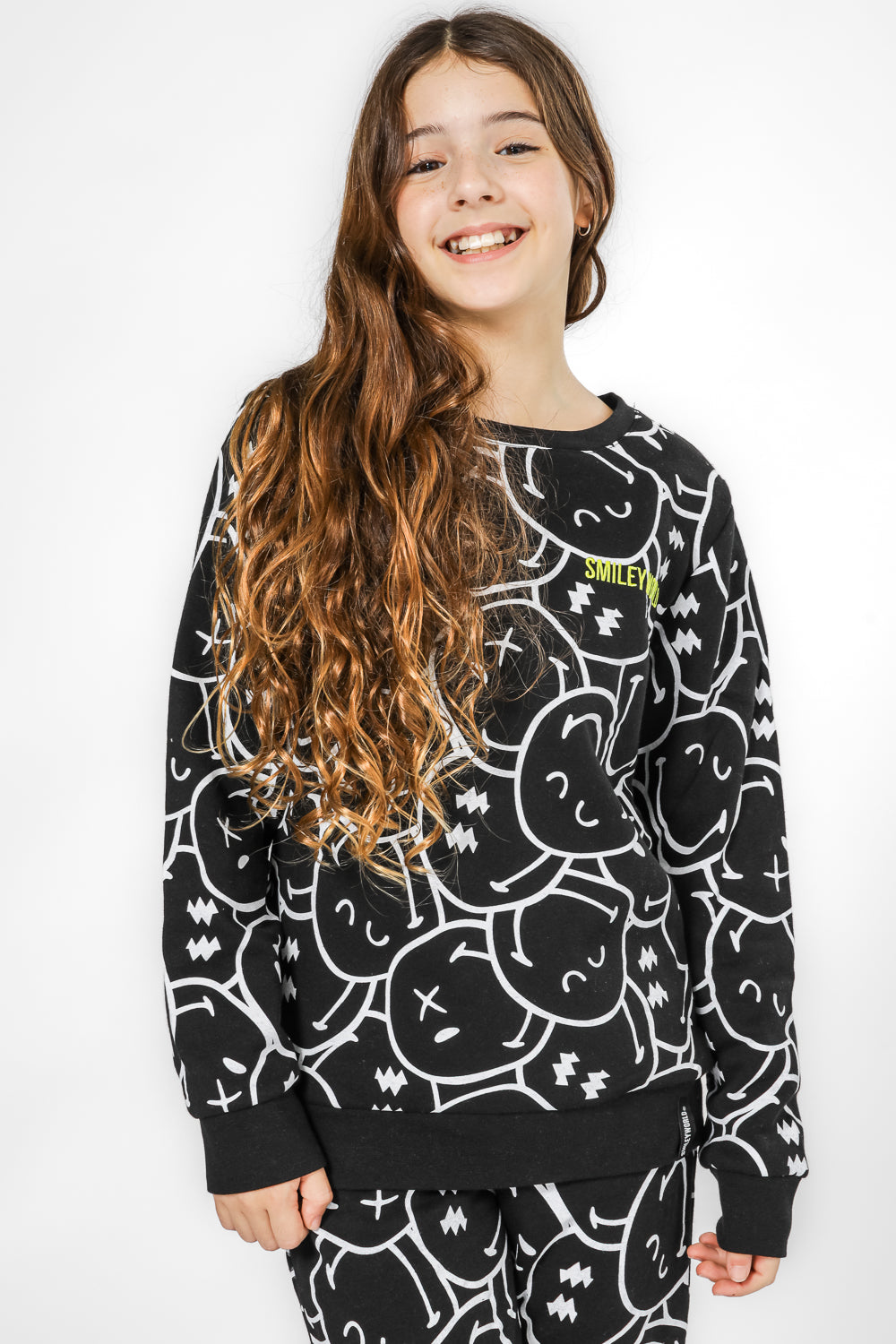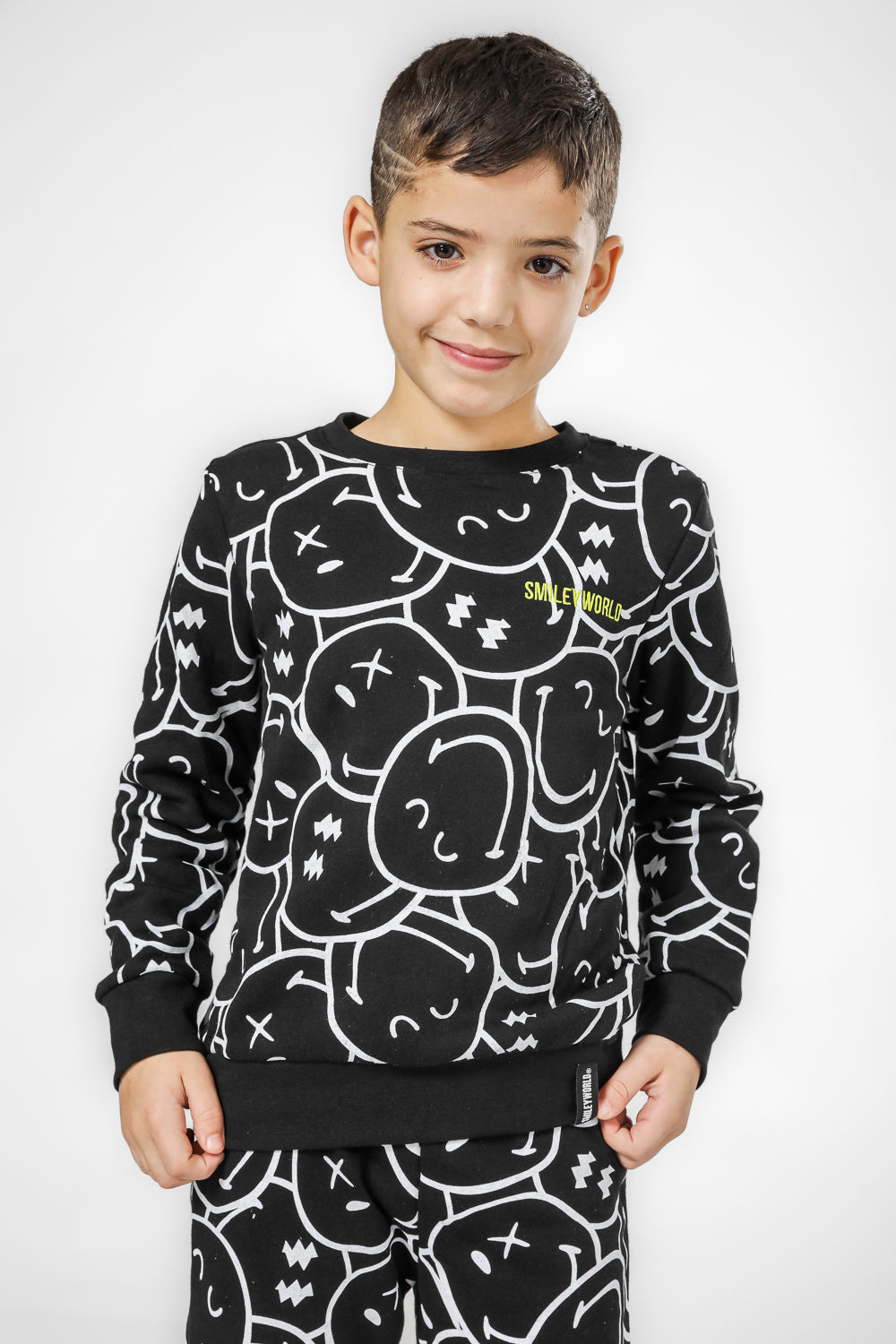 סט חולצה ומכנסיים מבד פוטר נעים בהדפס סמיילי. חולצה עם צווארון עגול ושרוולים ארוכים בסיומת מנג’ט, מכנסיים ארוכים בסיומת מנג’ט עם עם גומי במותניים ושרוכי קשירה.