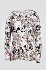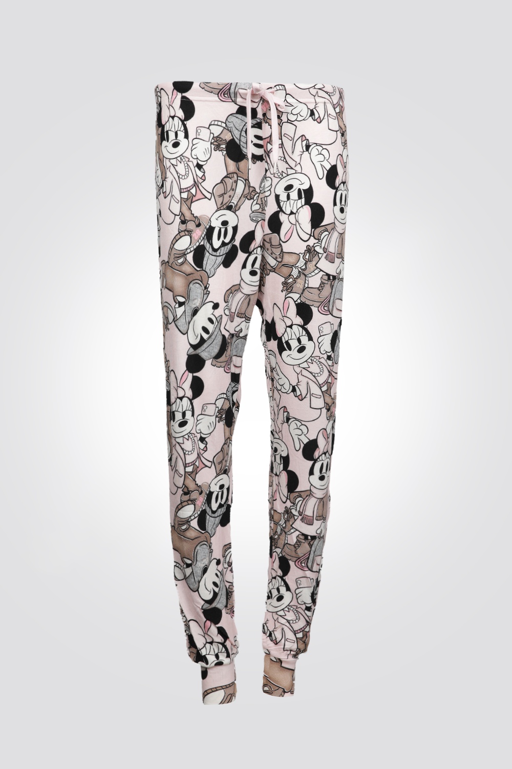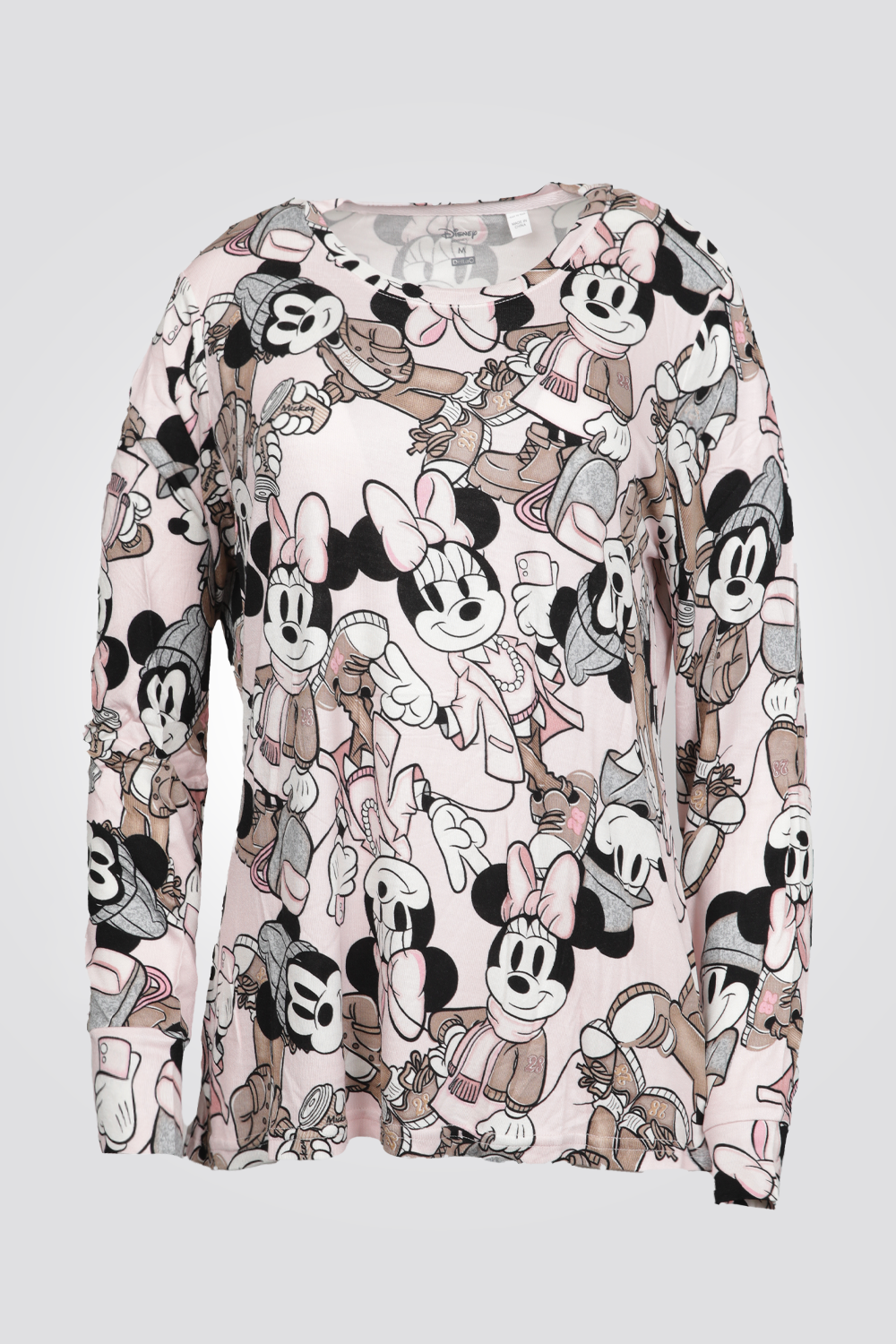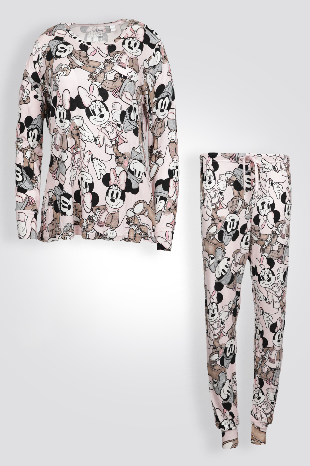 סט פיג’מה דקה לנשים מבית המותג DISNEY העשויה מבד אינטרלוק קליל ורך עם הדפס של מיקי ומיני מאוס. חולצה עם צווארון עגול, שרוולים ארוכים וסיומת מנג’ט ומכנסיים ארוכים עם גומי ושרוכי קשירה בסיומת מנג’ט.