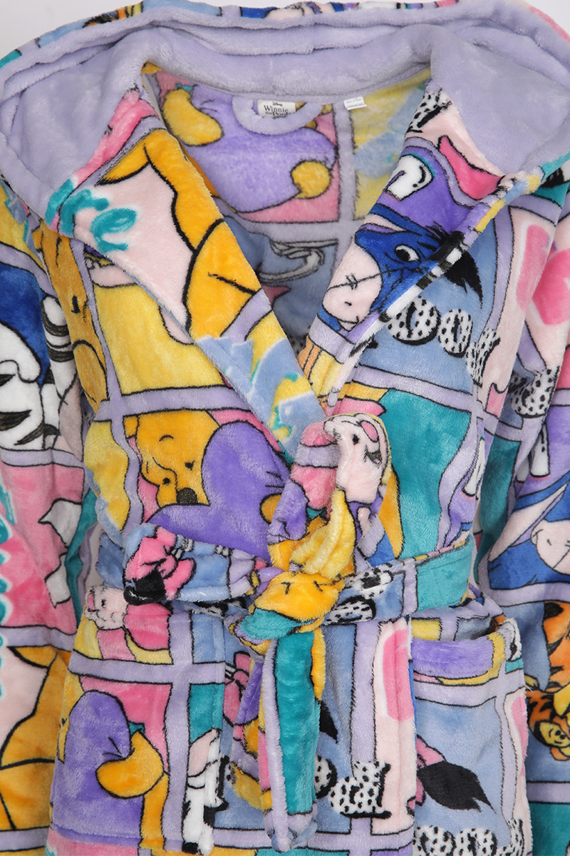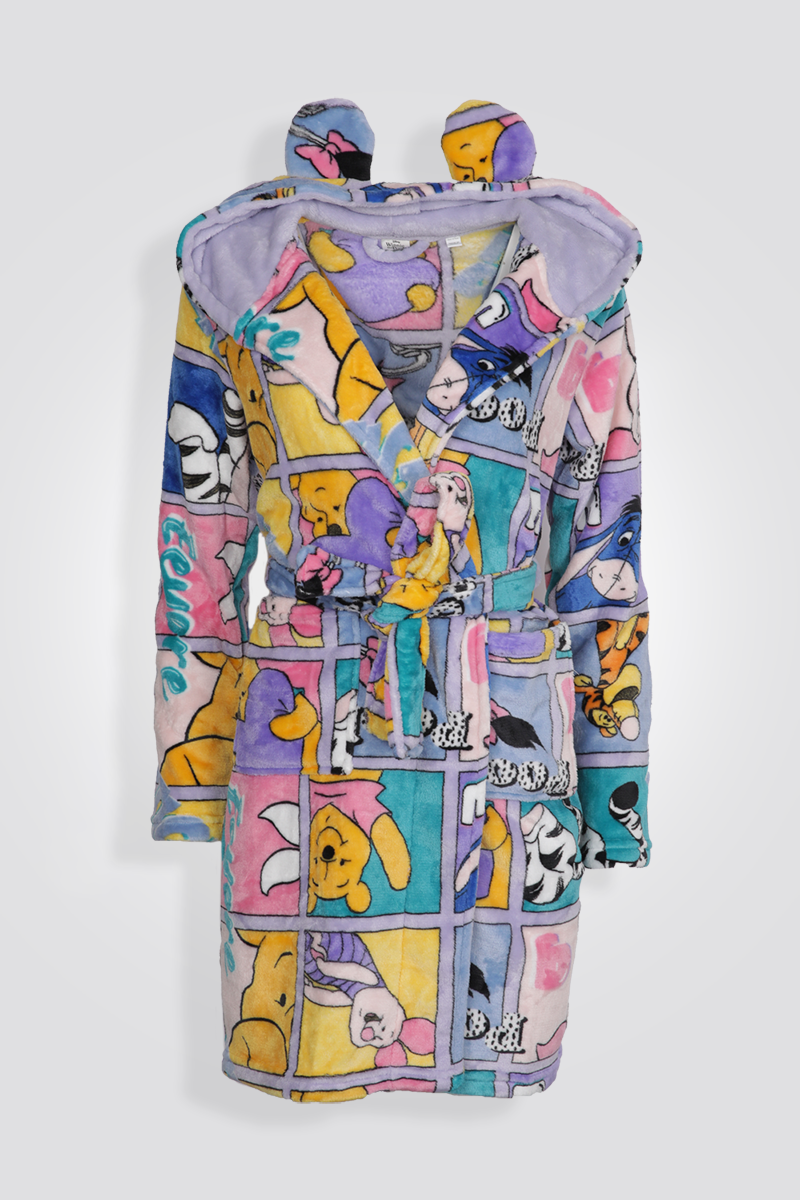 חלוק בית מפנק לנשים מבית המותג DELTA העשוי מבד פלאפי פרוותי ורך עם הדפס צבעוני של פו הדב עם קפוצ’ון עם אוזני פו הדב, חגורת קשירה וכיסים בצדדים לנוחות מיר