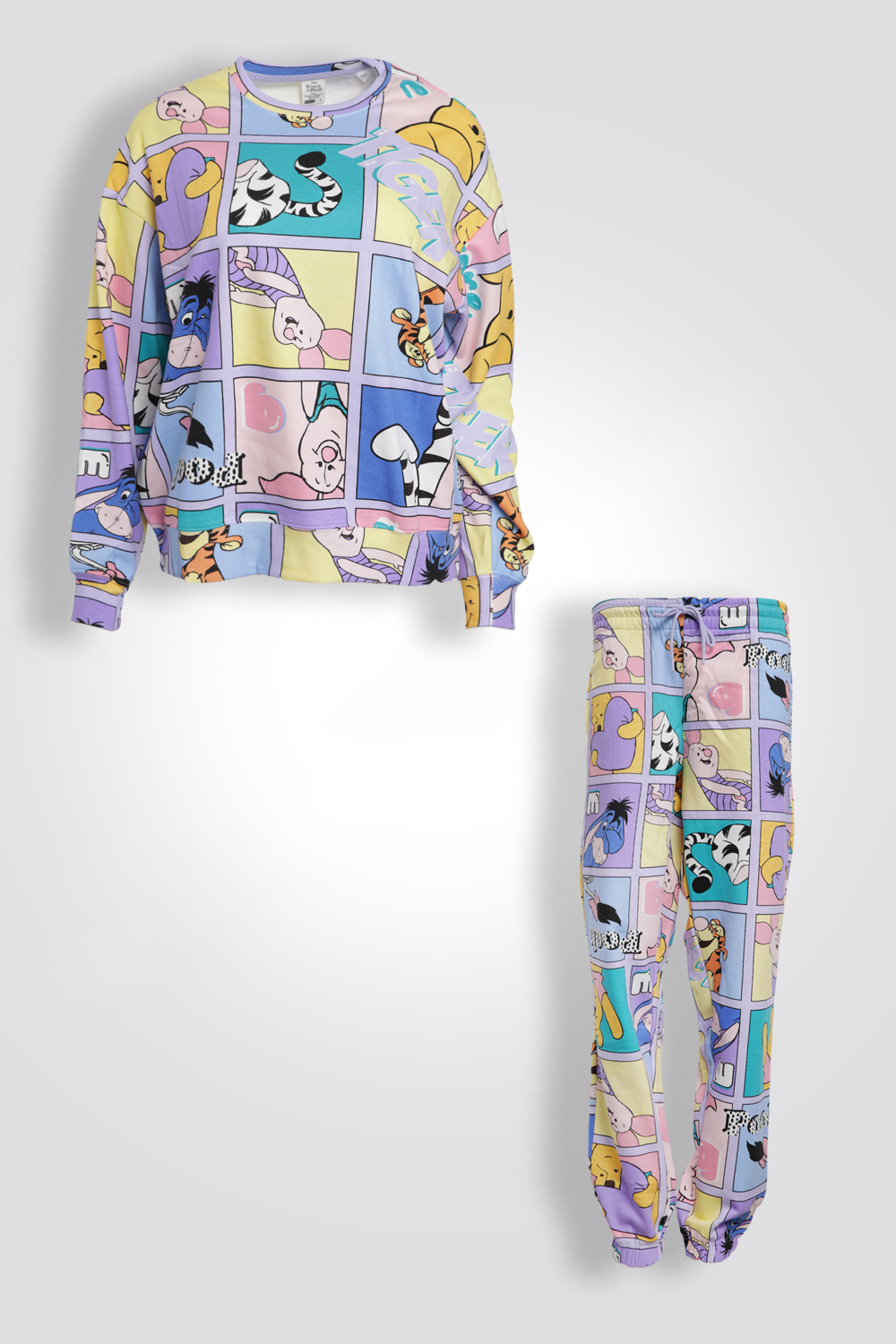 סט פיג'מה לנשים מבית המותג DISNEY העשויה מבד פוטר רך ומחמם עם הדפס צבעוני של פו הדב וחברים. חולצה עם צווארון עגול ושרוולים ארוכים עם סיומת מנג’ט ומכנסיים ארוכים עם גומי במותניים,כיסים וסיומת מנג’ט.