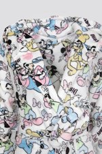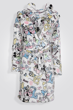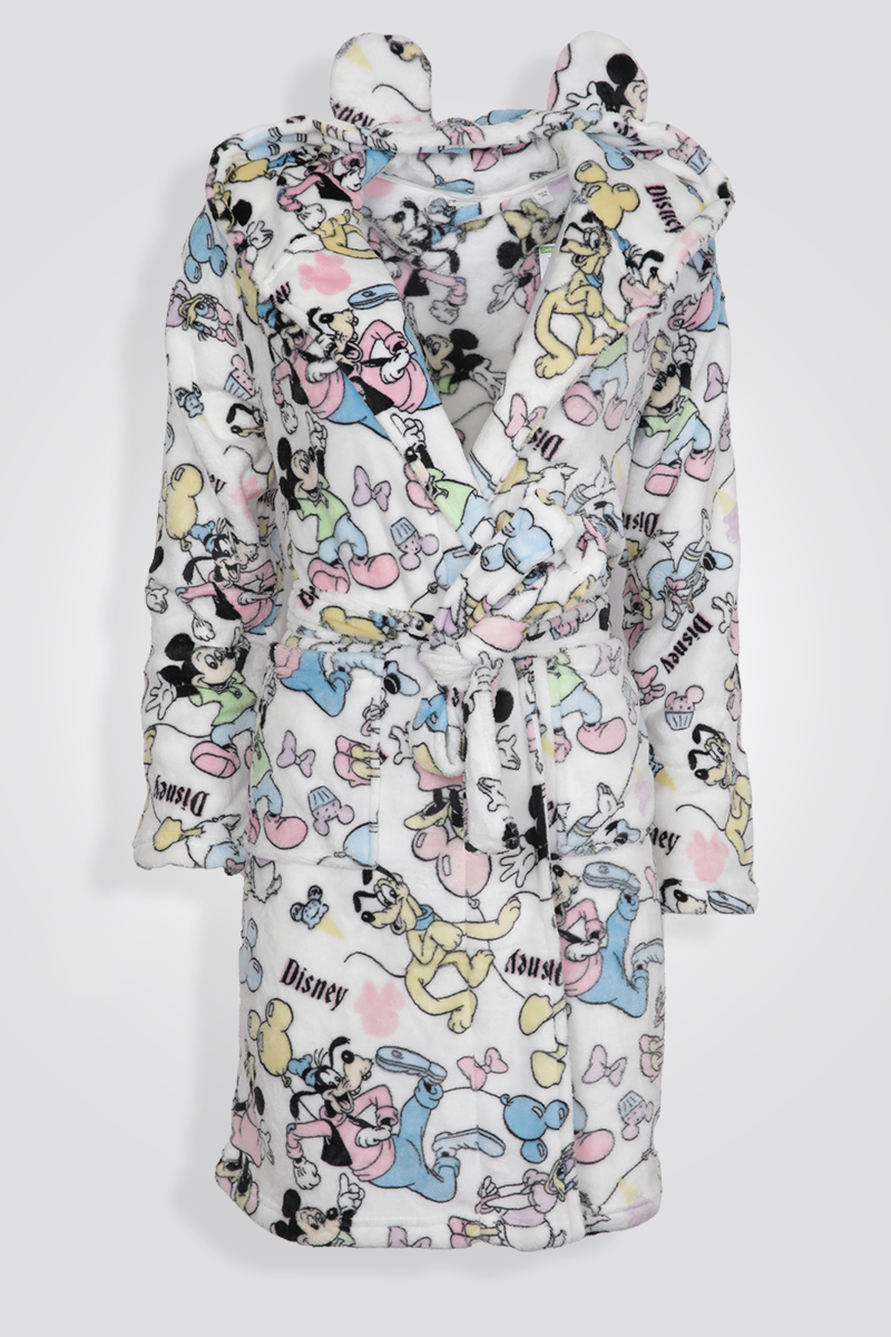 חלוק בית לנשים מבית המותג DISNEY העשוי מבד פלאפי פרוותי ורך עם הדפסים צבעוניים של מיקי מאוס וחברים עם קפוצ’ון עם אוזני מיקי, חגורת קשירה וכיסים בצדדים לנוחות מירבית.