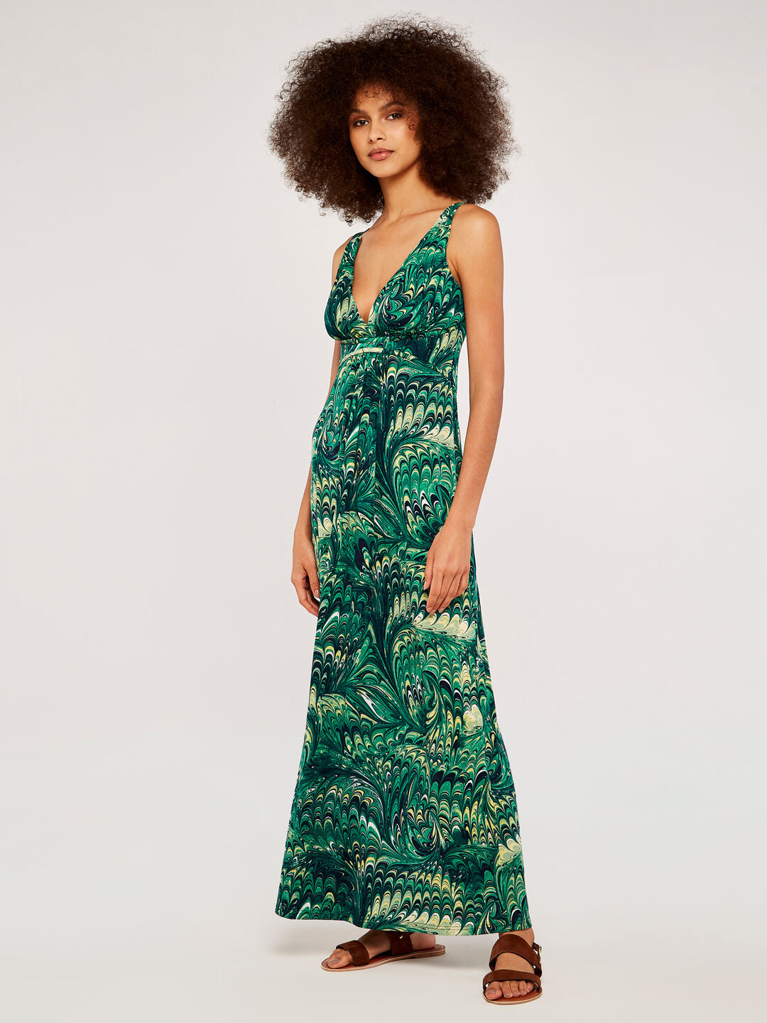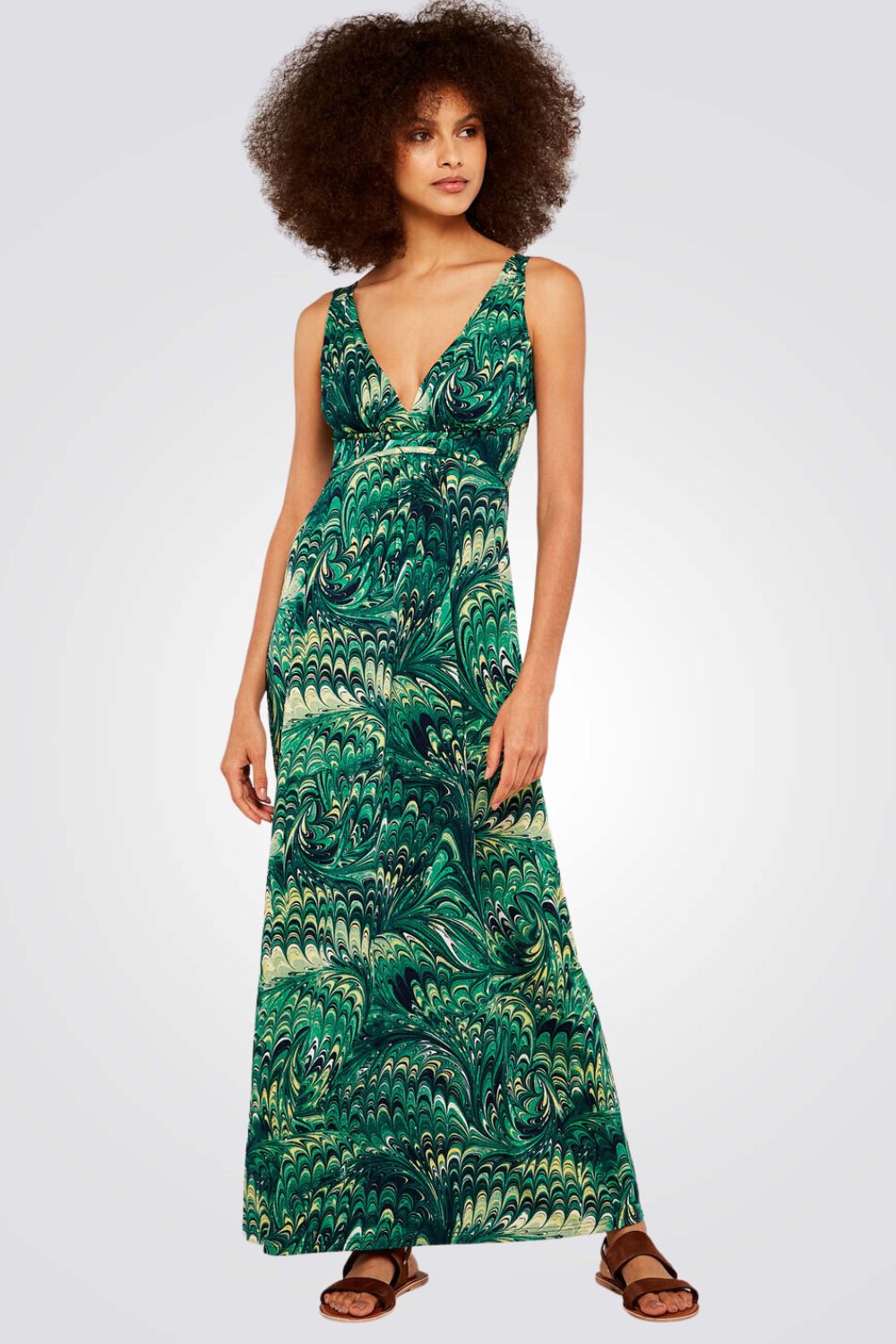 שמלה מבית המותג APRICOT, שמלת מקסי עם כתיפיות והדפס בשילובי צבעים אוורירית ונעימה ללבישה, מתאימה לעונה זו הרכב החומר: 95% פוליאסטר, 5% אלסטן