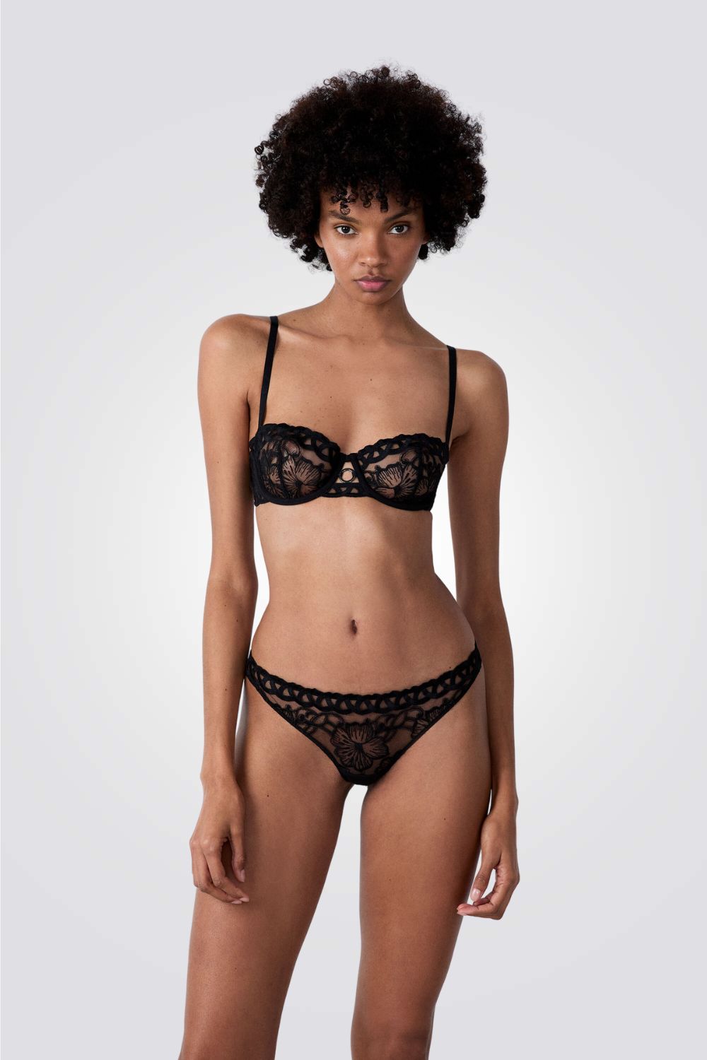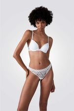 תחתוני תחרה מבית המותג ETAM העשויים ברובם טול חצי שקוף לבן עם עיטורי תחרה פרחוניים עדינים וטבעת קטנה במרכז התחתונים בחלוק הקידמי.