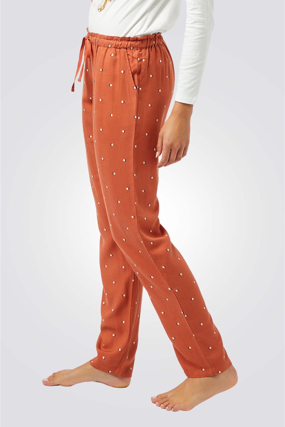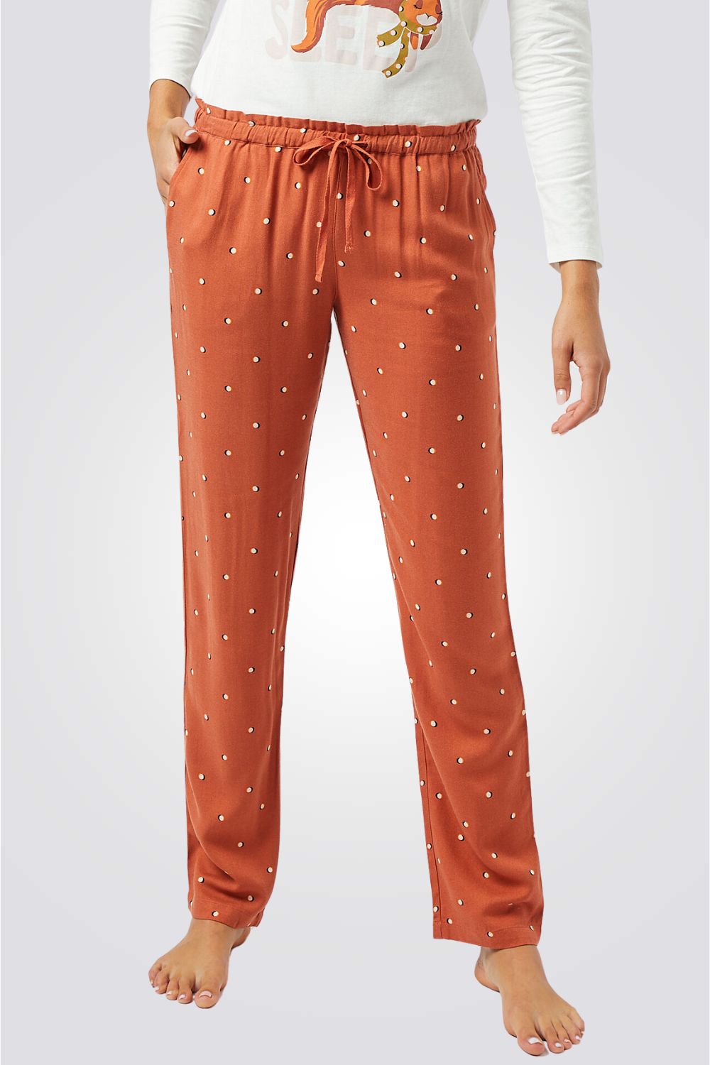 מכנסי פיג'מה ארוכים מבית המותג הצרפתי ETAM בגזרה ישרה, בעלי כיסים צידיים, רצועת מותן אלסטית עם שרוך קשירה ובהדפס עדין של נקודות.
