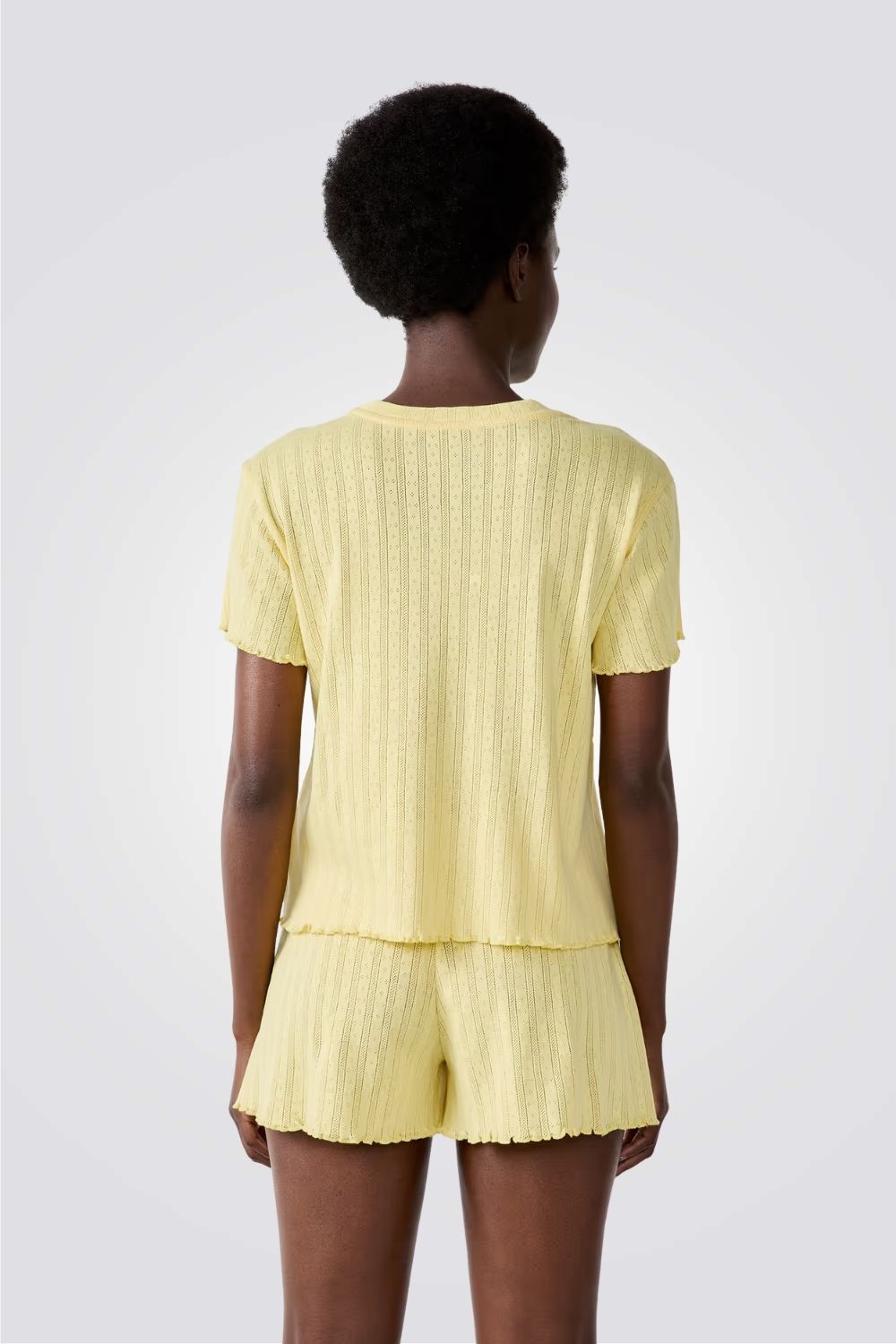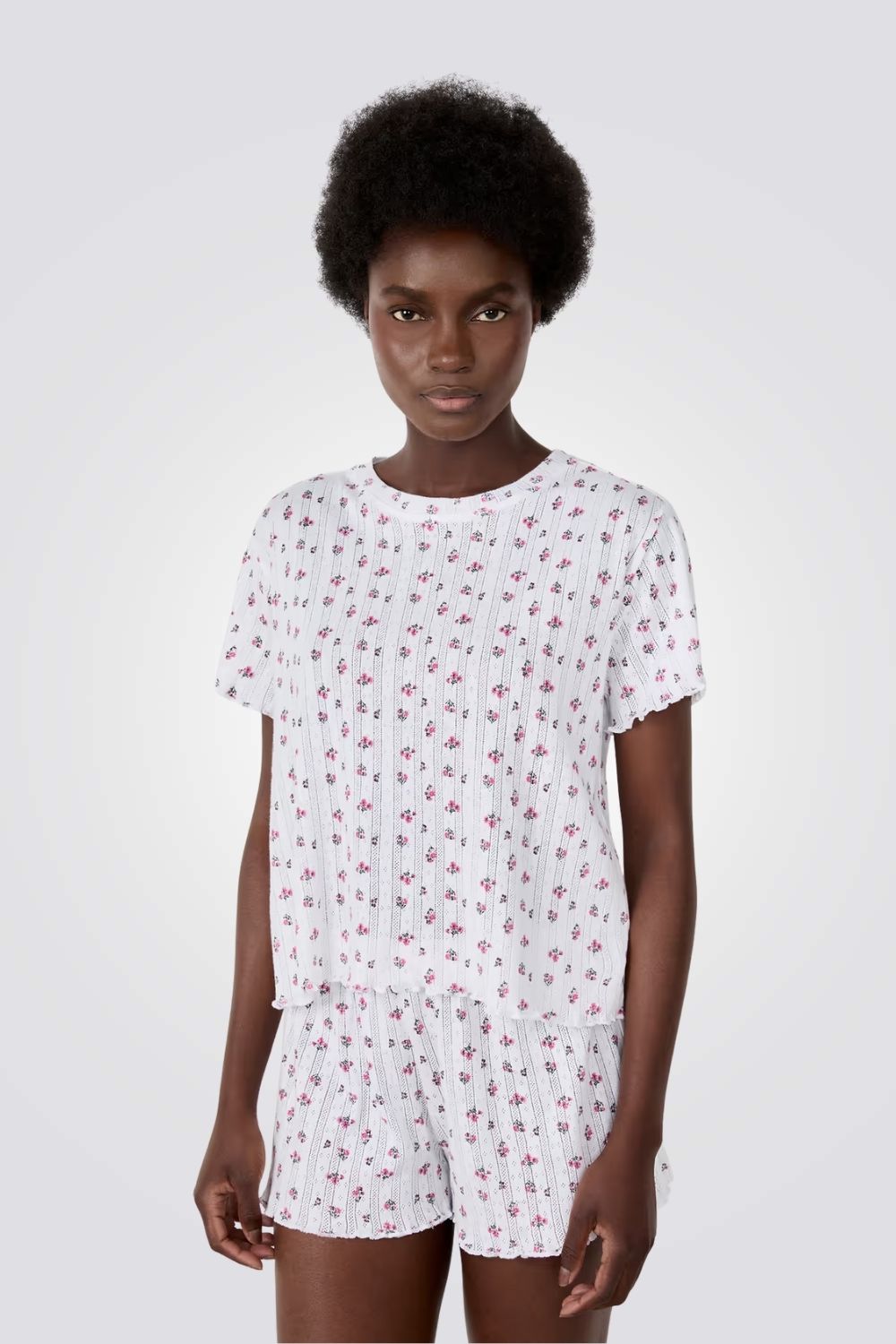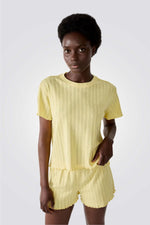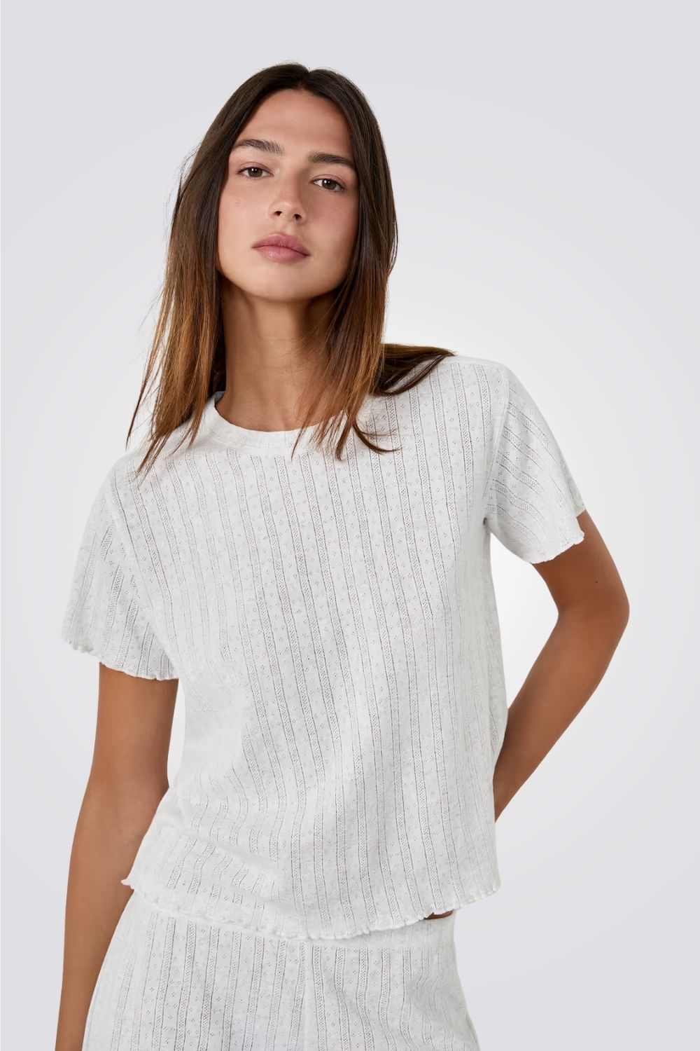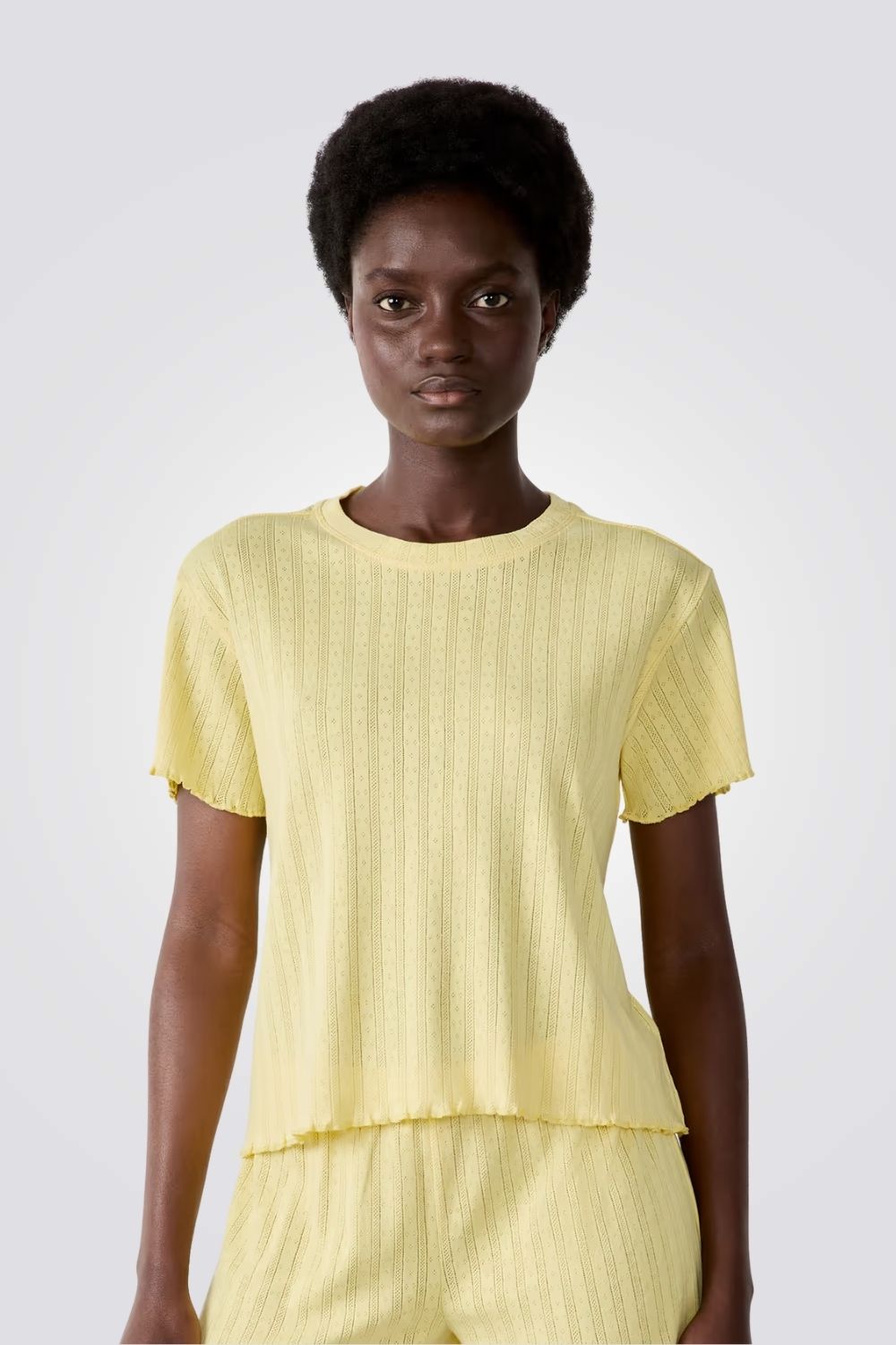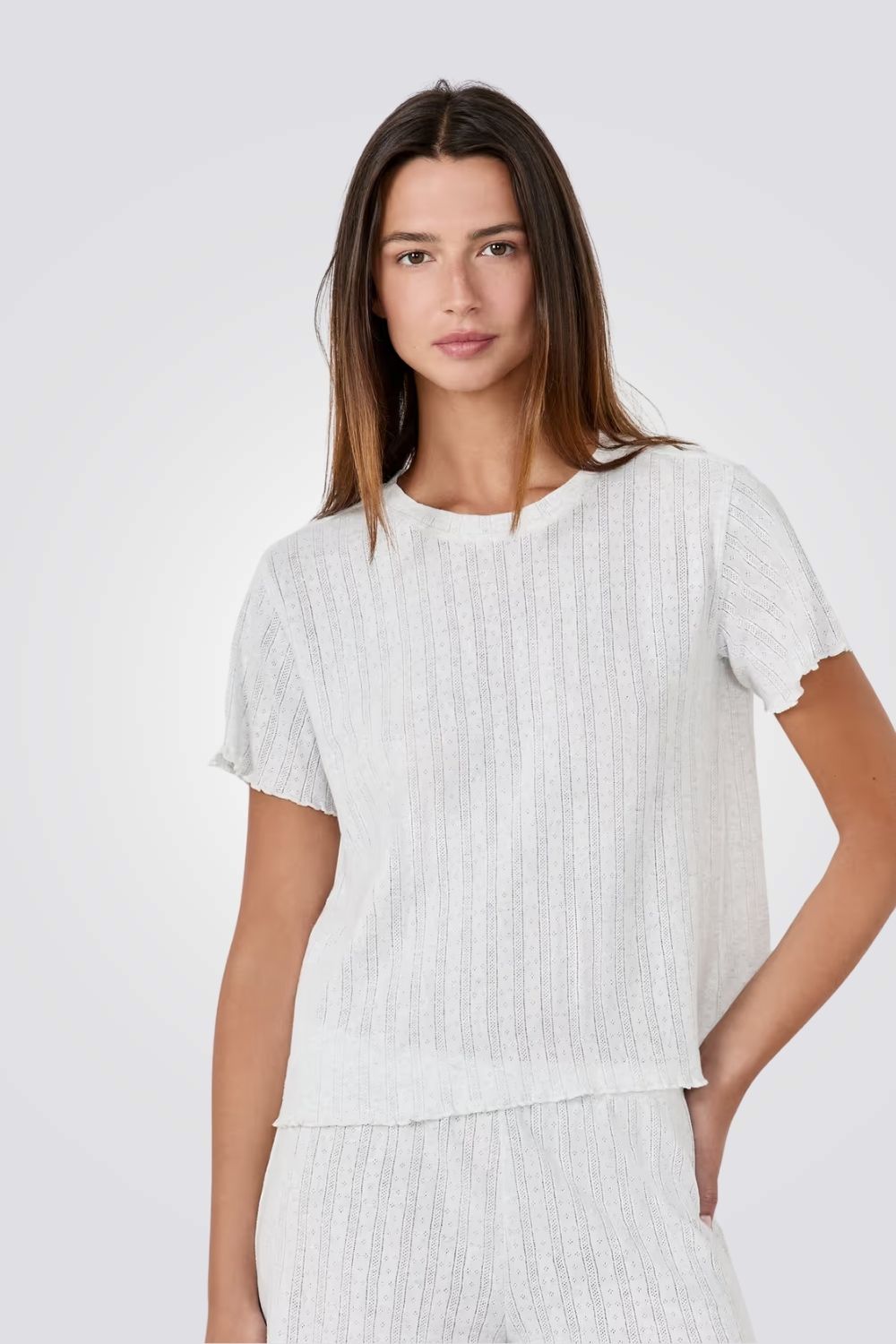 חולצת פיג'מה מבית המותג ETAM עשויה בד רך ונוח, בעלת גזרה קלאסית, צווארון עגול, שרוולים קצרים וטקסטורת פסים מעט שקופה.
