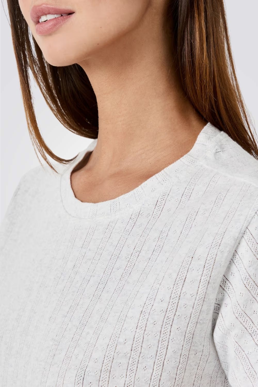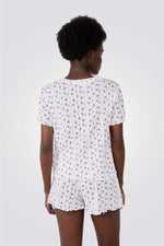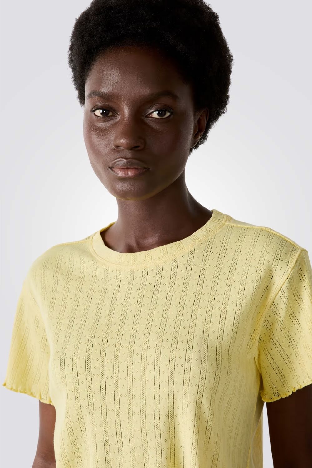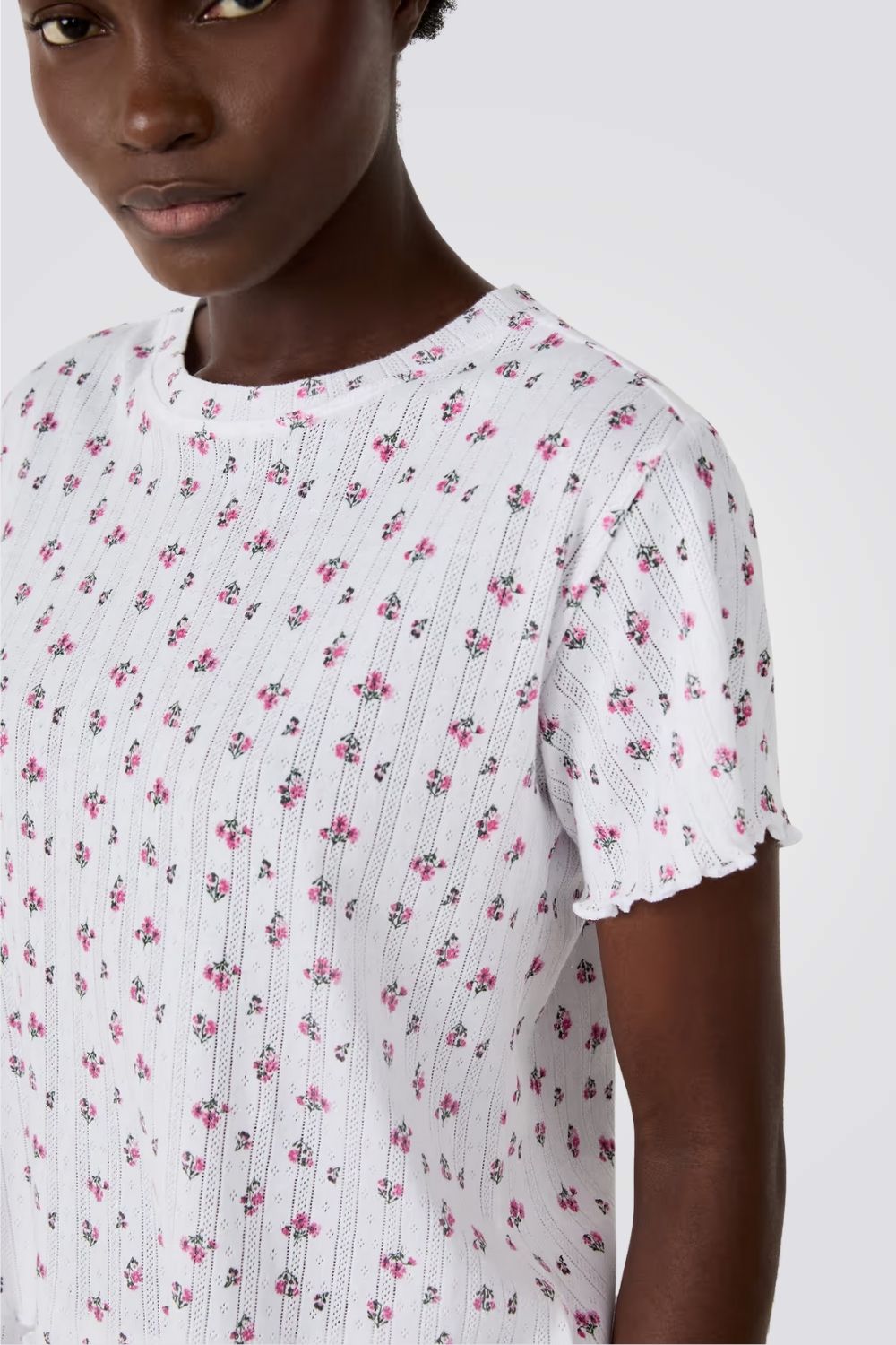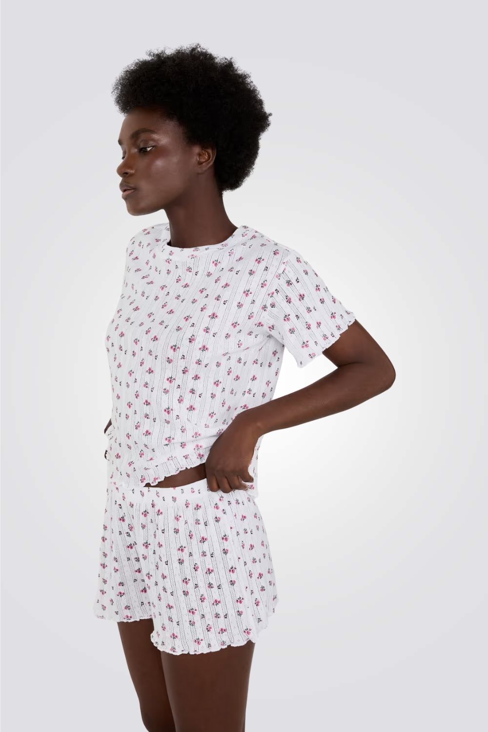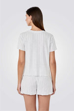 חולצת פיג'מה מבית המותג ETAM עשויה בד רך ונוח, בעלת גזרה קלאסית, צווארון עגול, שרוולים קצרים וטקסטורת פסים מעט שקופה.