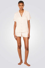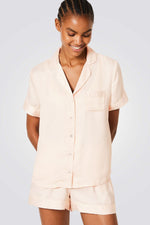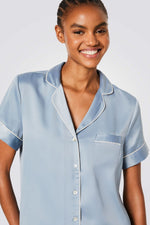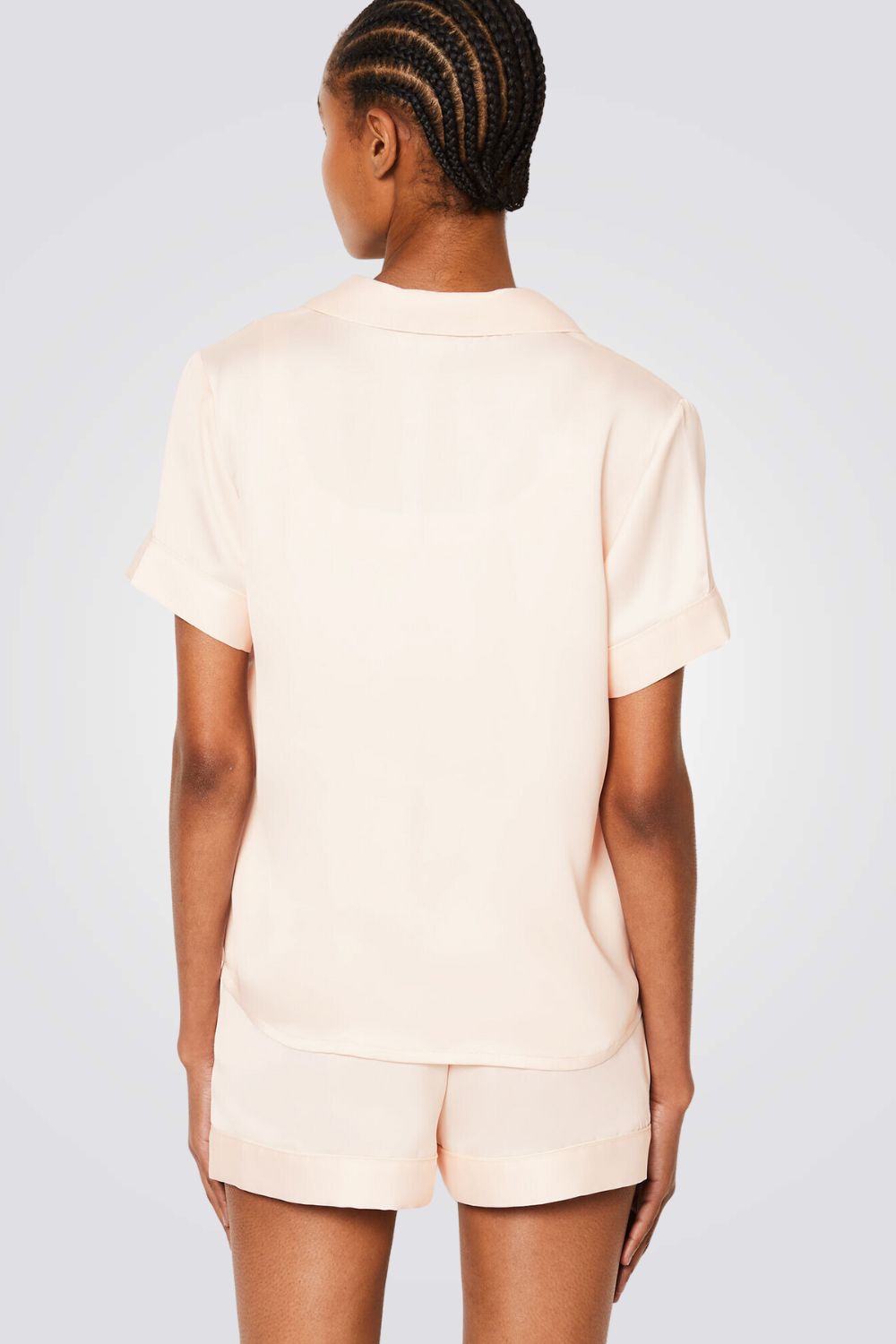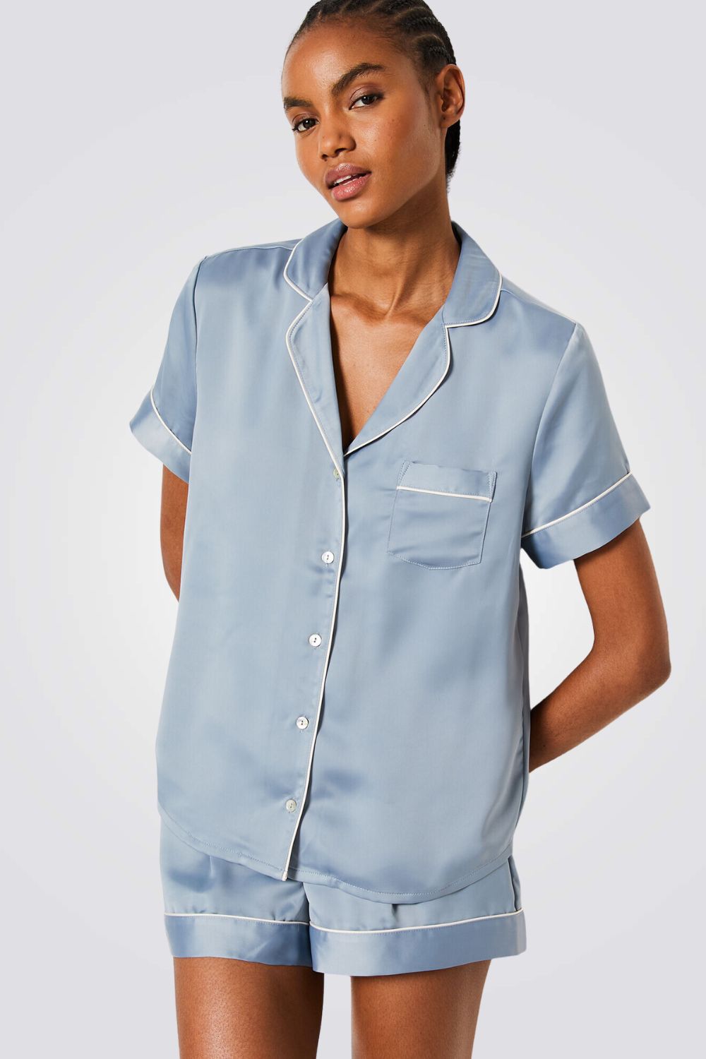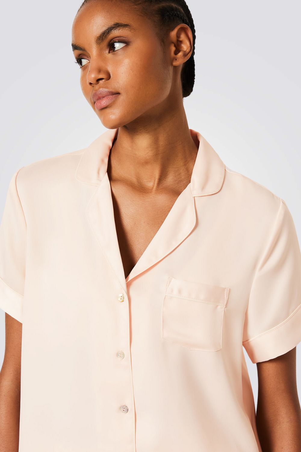 חולצת פיג'מה מכופתרת מהבית המותג ETAM העשויה בד סאטן רך ונעים על הגוף, בעלת שרוולים קצרים, כיס קטן בחלק העליון וצווארון דש.