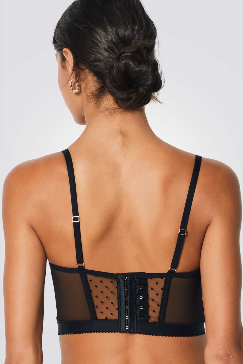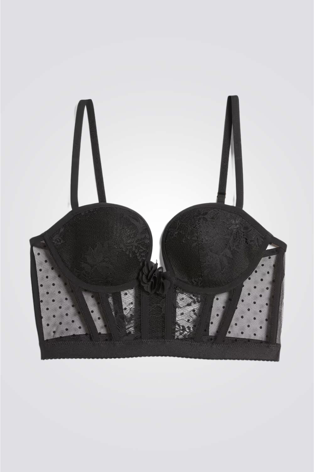 חזיית תחרה מבית המותג הצרפתי ETAM בעלת קו מותניים רחב העשוי טול רקות, רצועות דקות ומתכווננות, מחשוף עמוק ופרח דקורטיבי במרכז.