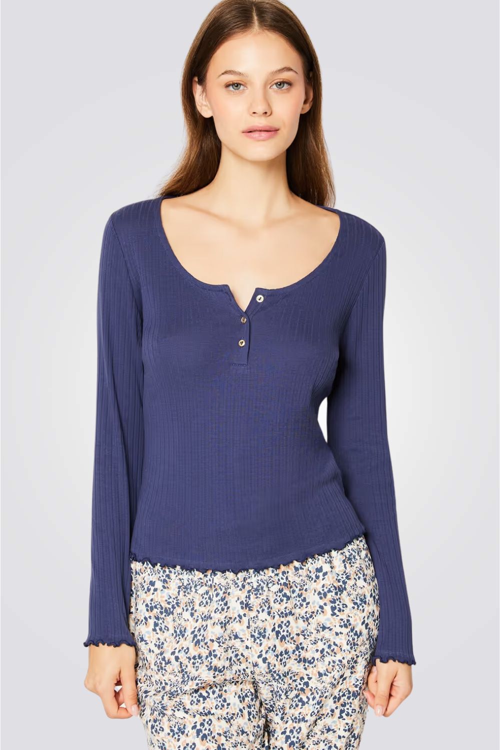 חולצת פיג'מה לנשים מבית המותג הצרפתי ETAM, בעלת שרוולים ארוכים, בגזרה ישרה ועם צווארון עגול עם כפתורים בחזית.