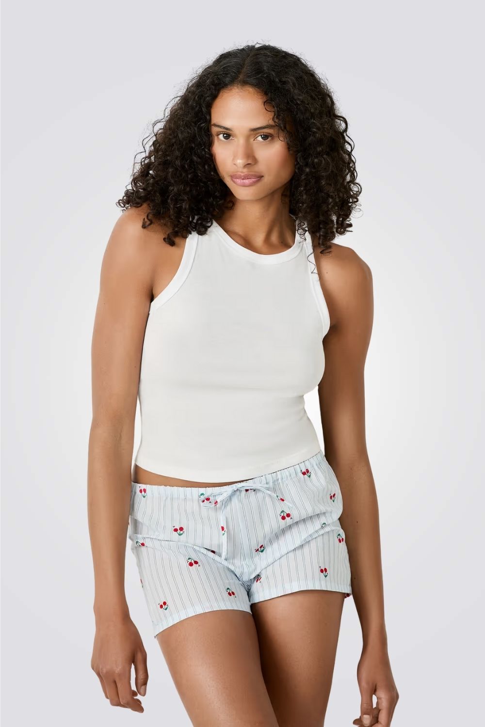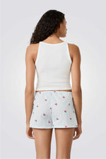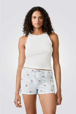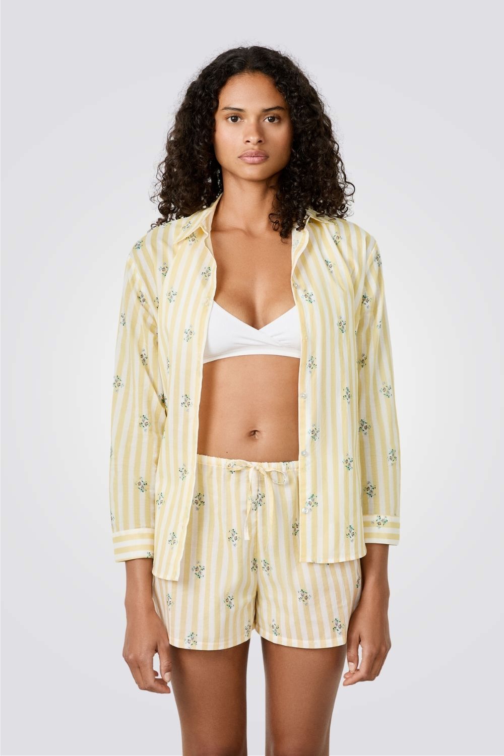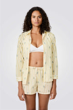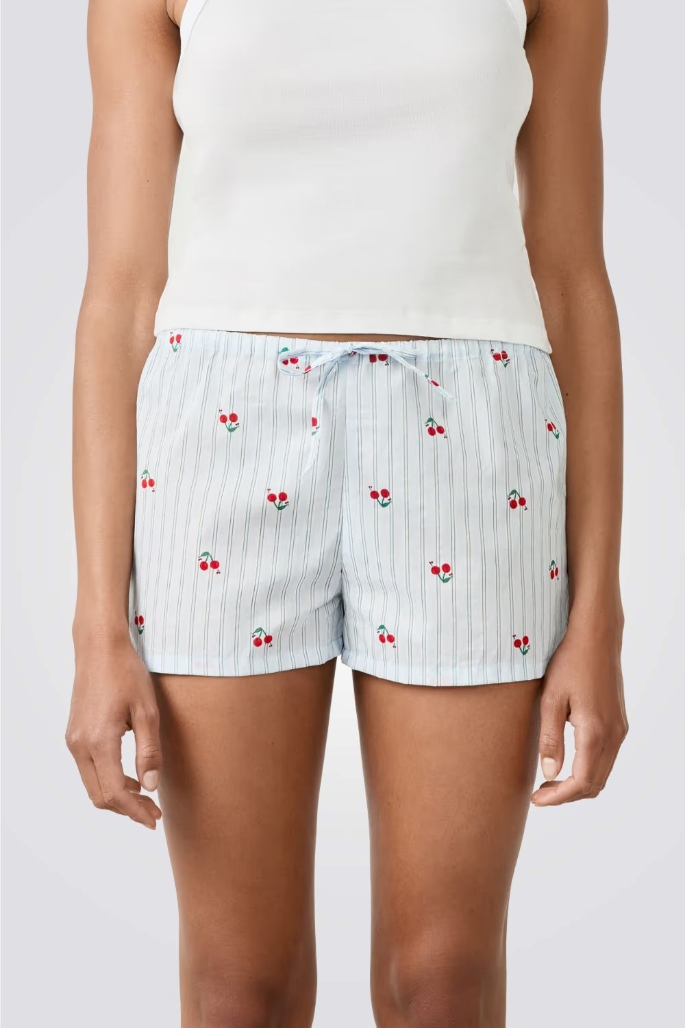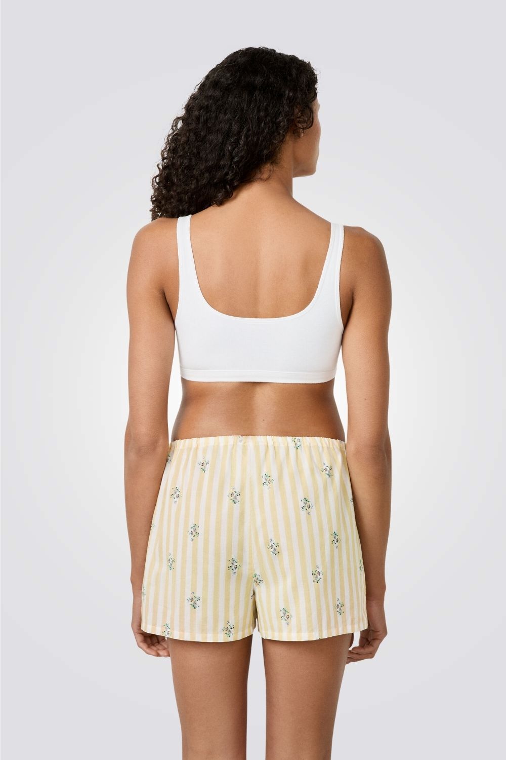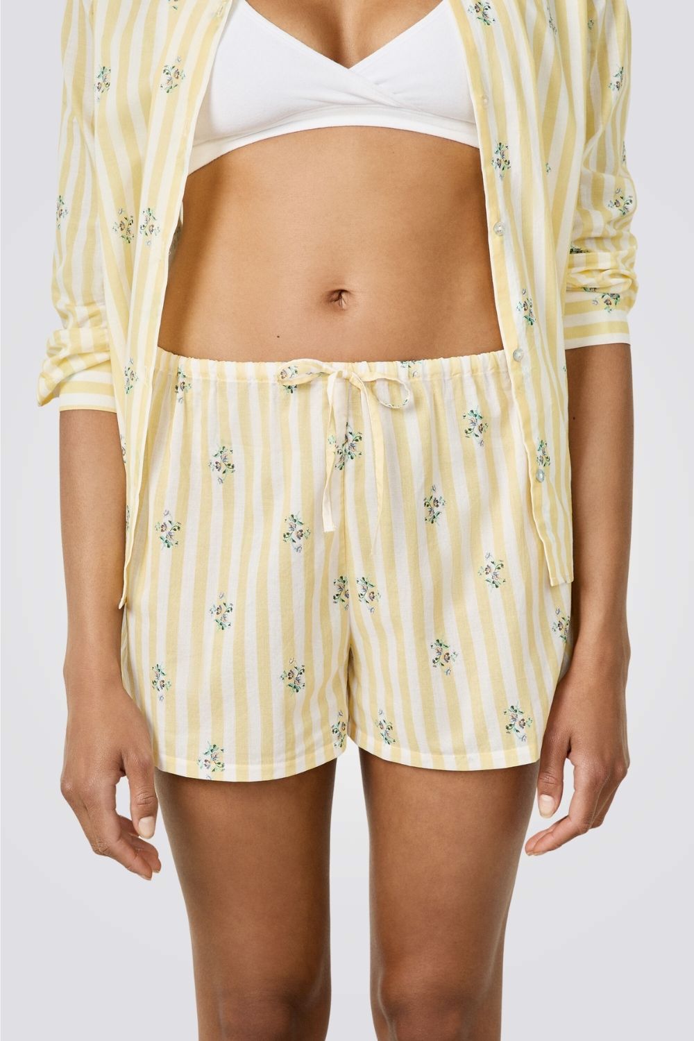 מכנסי פיג'מה קצרים מבית המותג ETAM עשויים בד כותנה רך ונעים בעלי גזרה מתרחבת עם הדפס פסים עדין ושרוך קשירה בקו המותן.