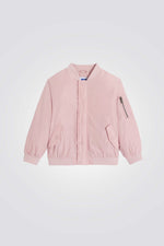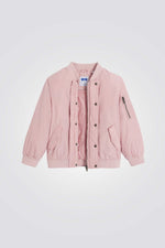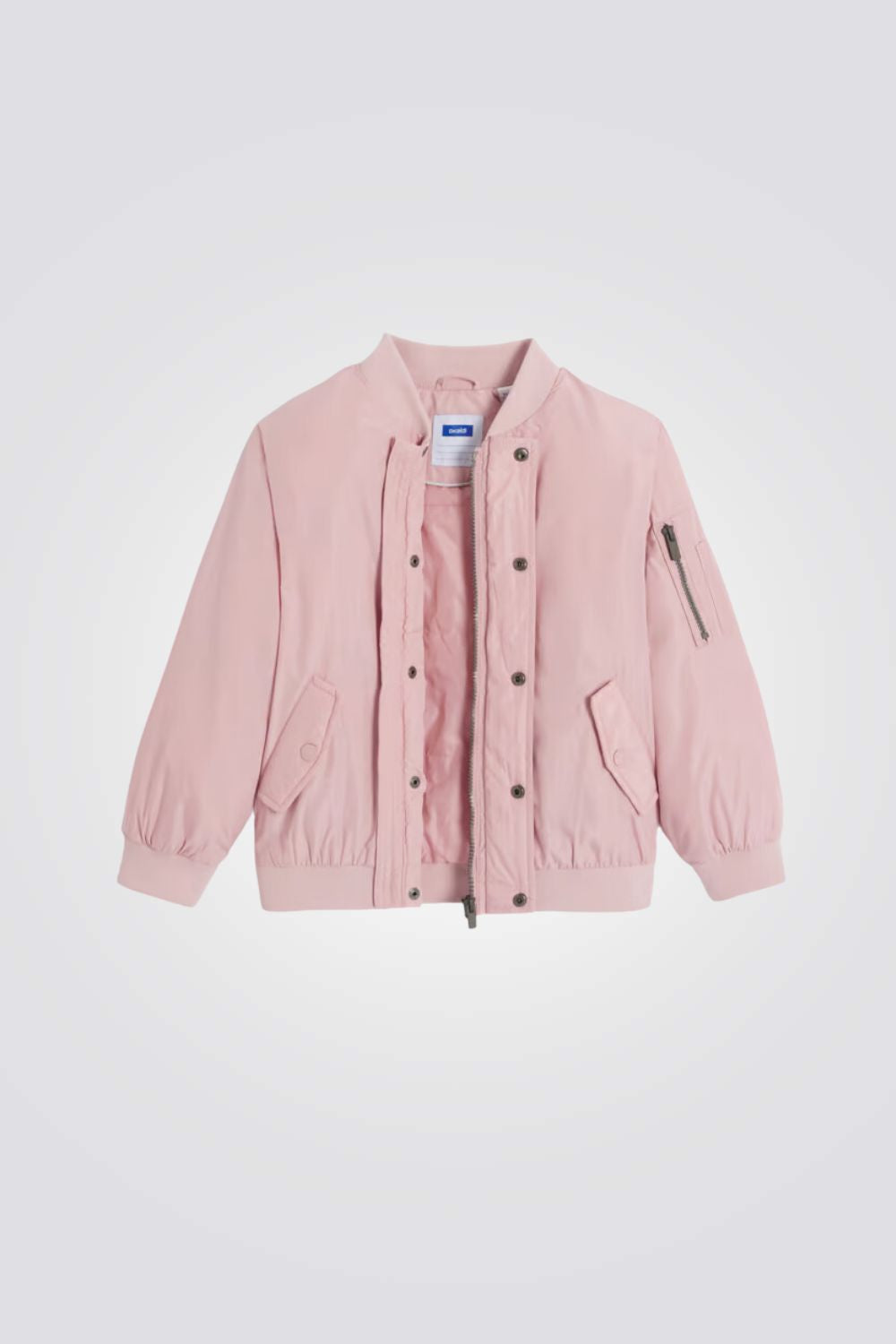 מעיל לילדות מבית המותג OKAIDI, בצבע ורוד בגזרת ג'קט בומבר, צווארון עגול, פתיחת רוכסן מוסתר וארבעה כיסים.