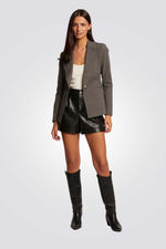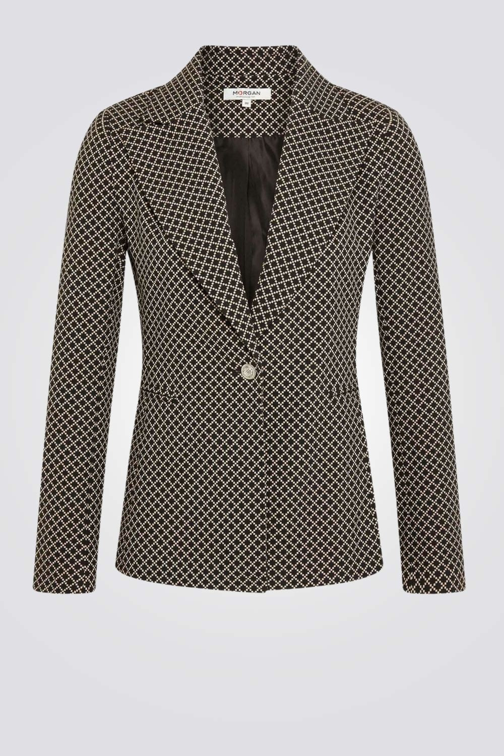 ג'קט נשים מבית המותג MORGAN, משובץ בגווני חום, צאוורון דש, שרוולים ארוכים, שני כיסים קדמיים וסגירת כפתורים