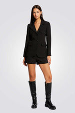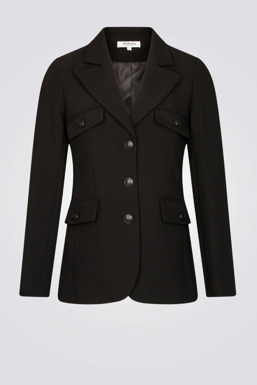 ג'קט מחוייט נשים מבית המותג MORGAN, בצבע שחור, צאוורון דש עם מפתח V רחב, ארבעה כיסי דמה וסגירת כפתורים