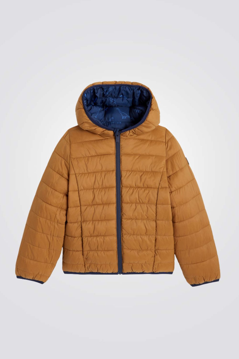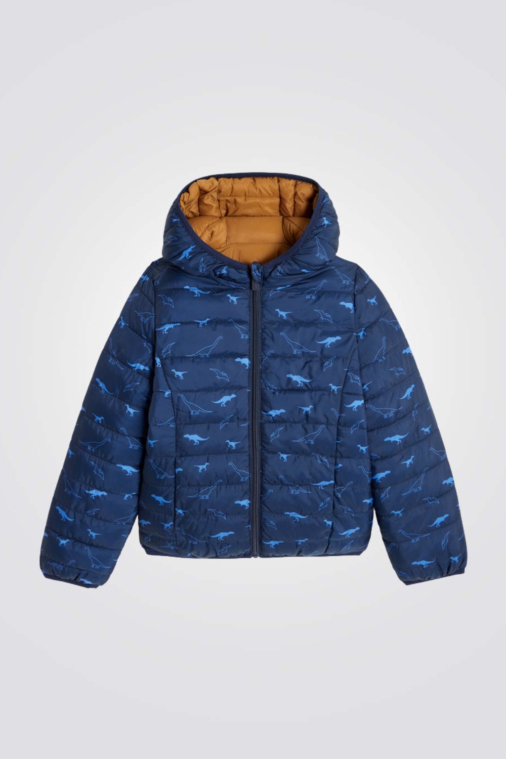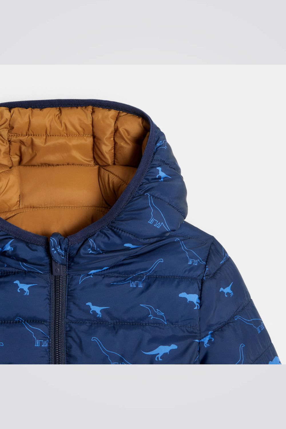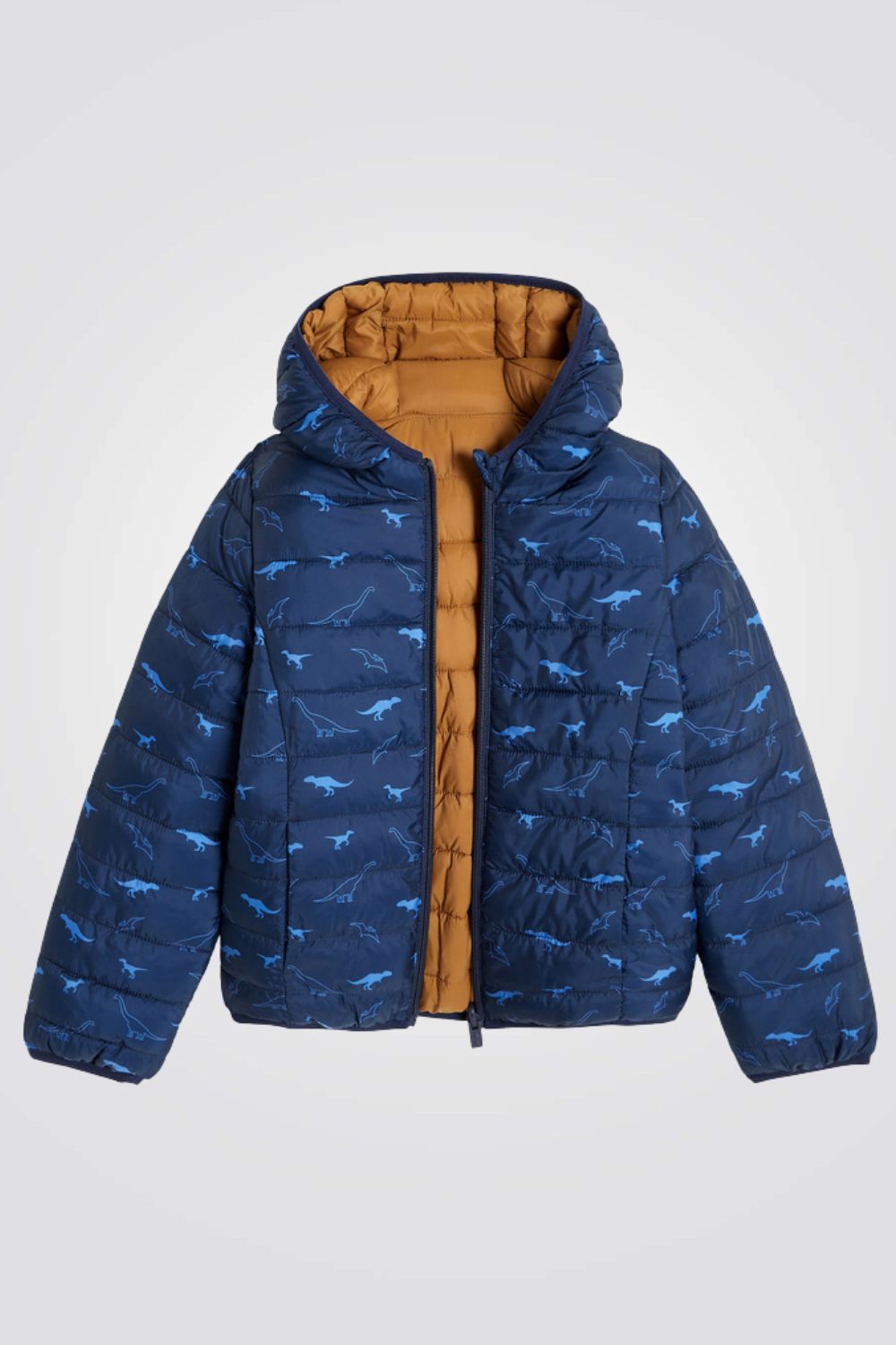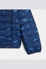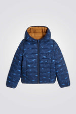 מעיל פוך דו צדדי לילדים בצבע כחול עם הדפס דינוזאורים
