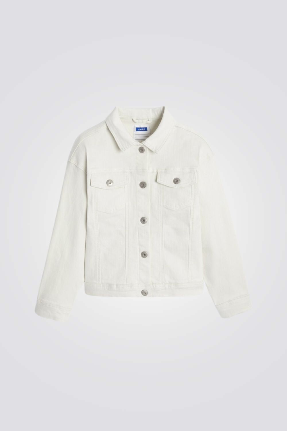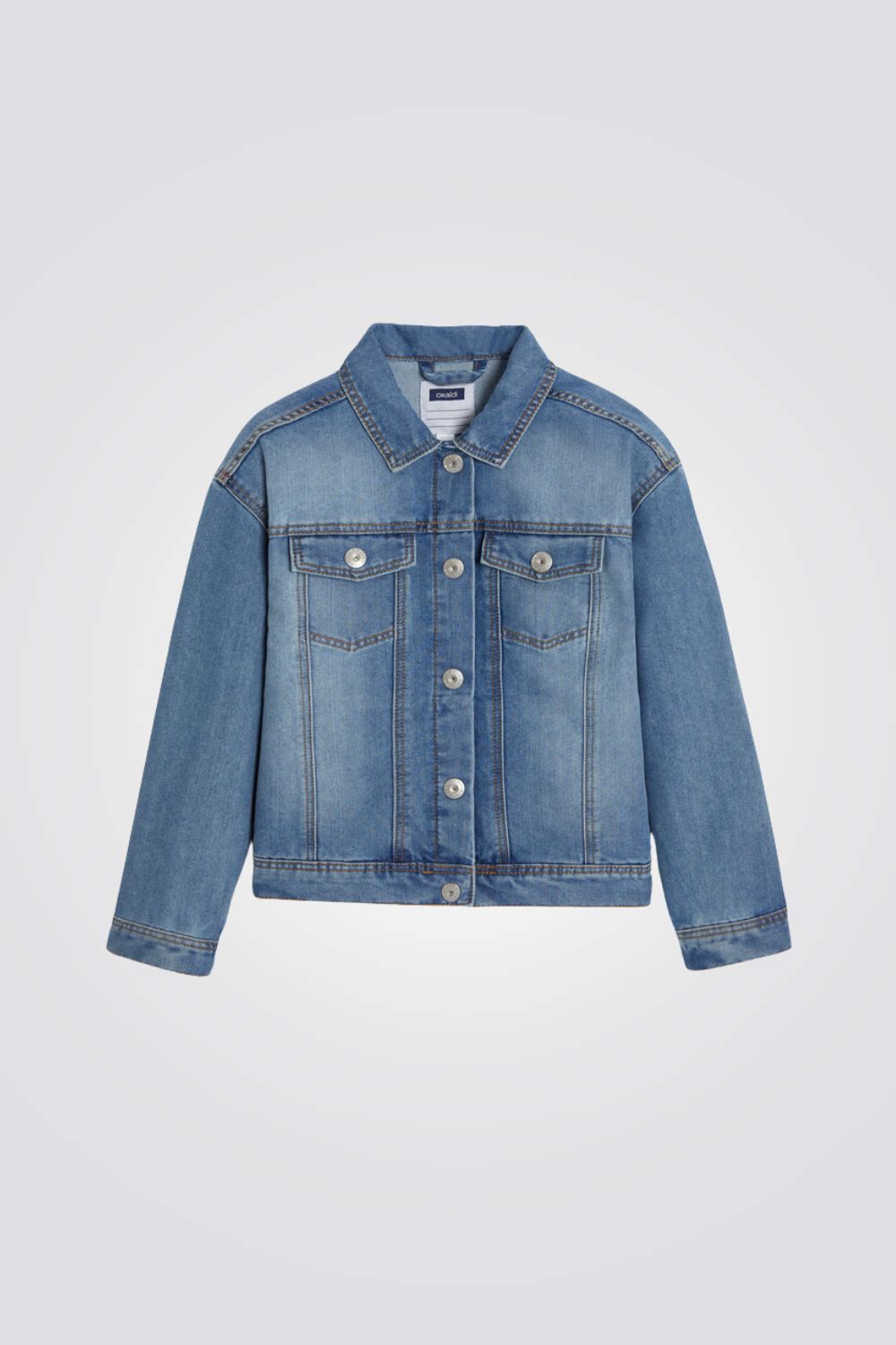 ג'קט ג'ינס לילדות מבית המותג OKAIDI, בגזרה ישרה עם צווארון קלאסי , סגירת כפתורים ושני כיסים בחזה.