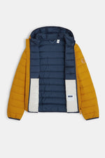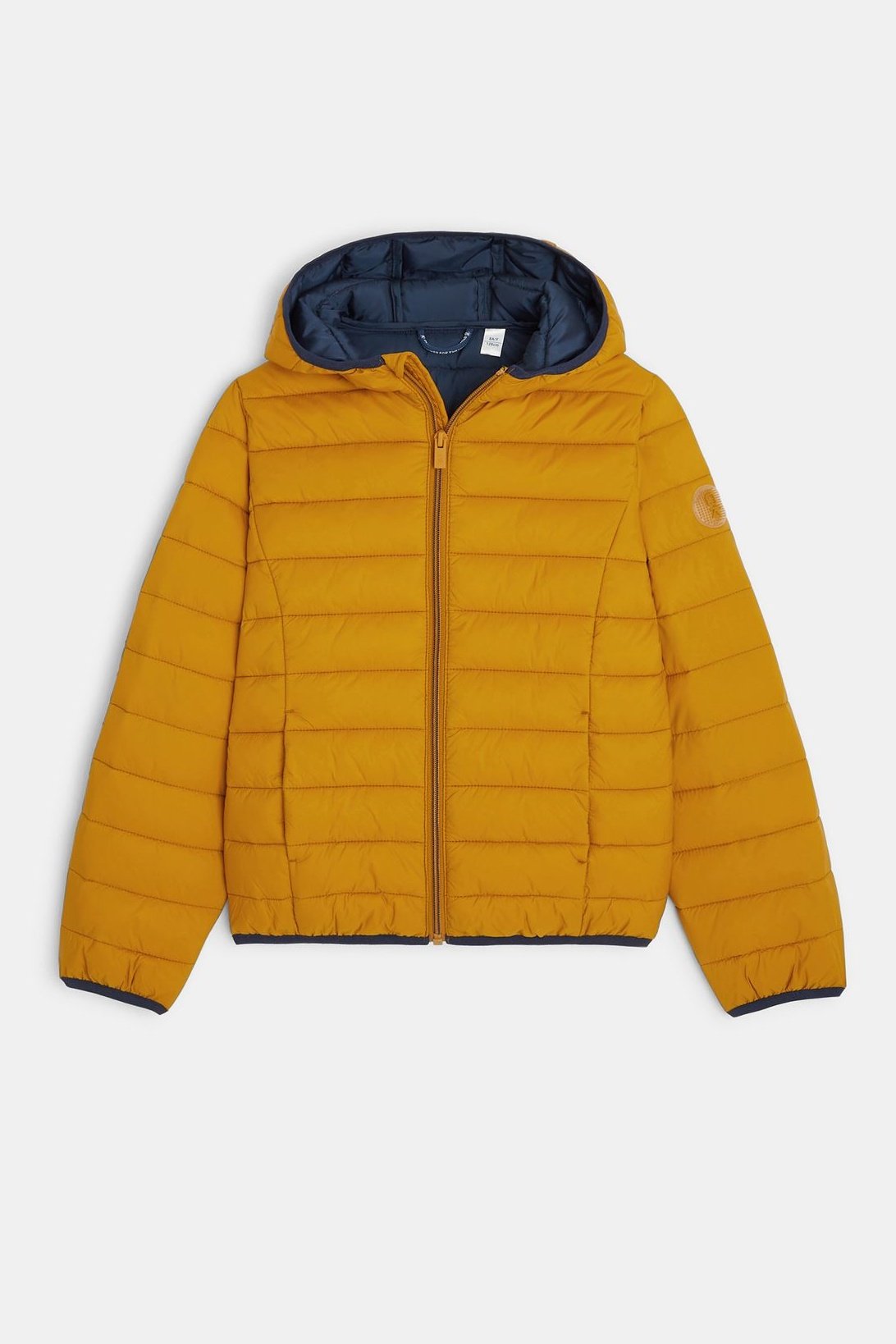 מעיל ניילון מבית OKAIDI בצבע צהוב חרדל עם ביטנה בצבע כחול נייבי. מעיל מחמם, מגן מפני קור עד מינוס 10 מעלות ועמיד בפני מים. למעיל תפרים היוצרים שורות של ריפוד, כובע קפוצ'ון, צווארון עגול וארוך, מחזירי אור בגב המעיל, תג זהות פנימי, 2 כיסים צדדיים, וסגירת רוכסן קדמי. הרכב בד: 100% פוליאמיד