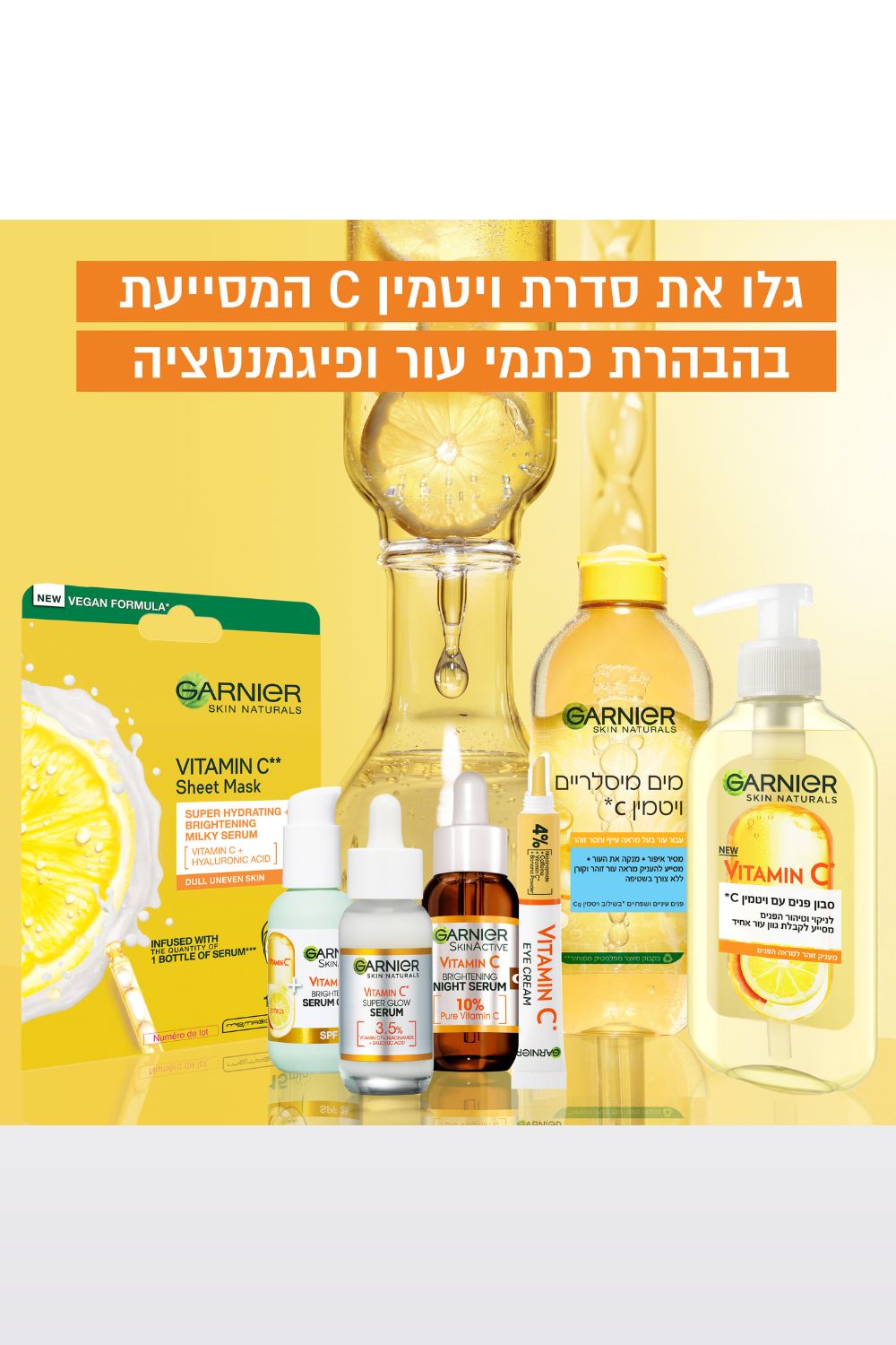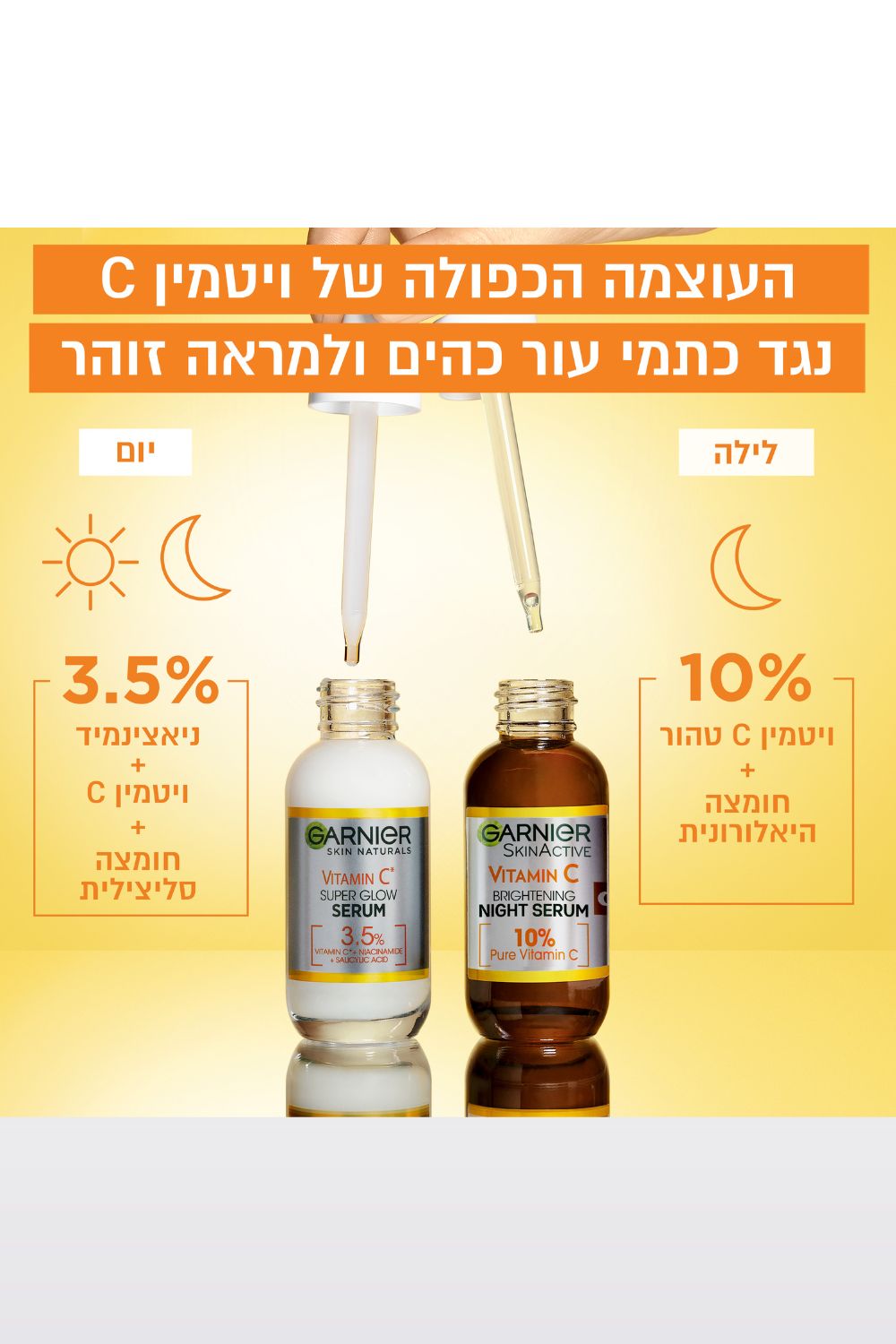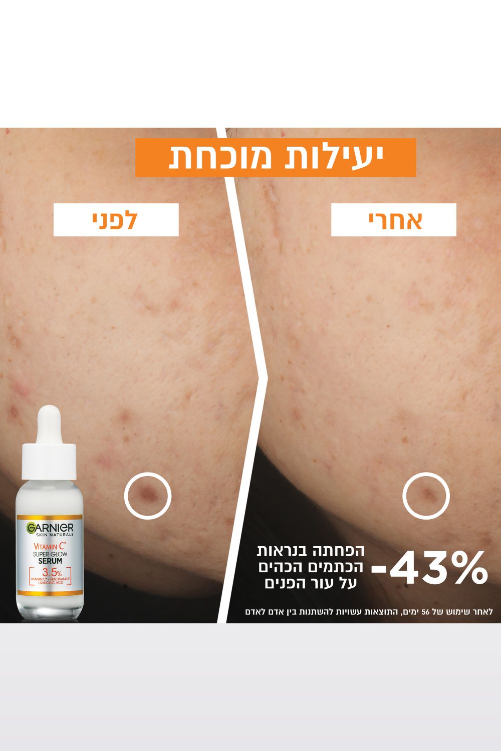 הסרום הראשון של גרנייה, שבו הריכוז של ניאצינאמיד + ויטמין C + חומצה סליצילית כל כך גבוה [3.5%] , כך שהוא מסייע בהפחתת מראה כתמי עור בתוך 6 ימים בלבד!**