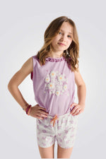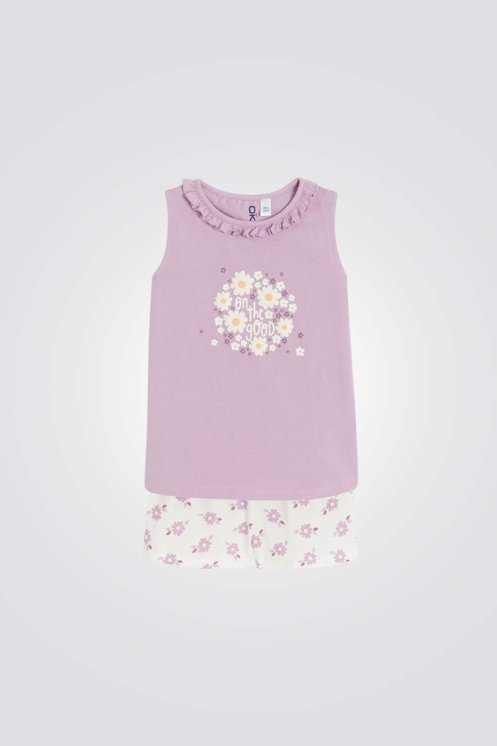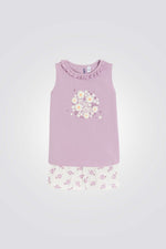 פיג'מה לילדות מבית המותג OKAIDI, בצבע סגול עם הדפס פרחוני , עשויה מבד ג'רסי רך, חולצה קצרה ללא שרוולים בגזרה ישרה ונוחה, ומכנסיים קצרים עם מותן אלסטית והדפס פרחוני.