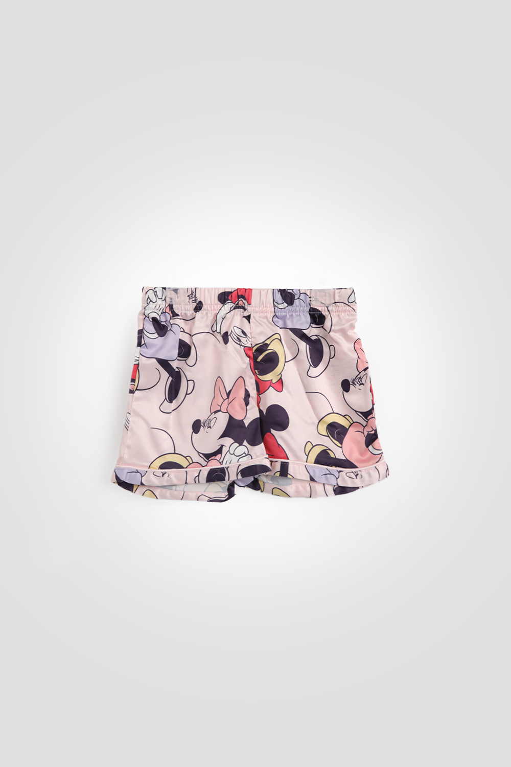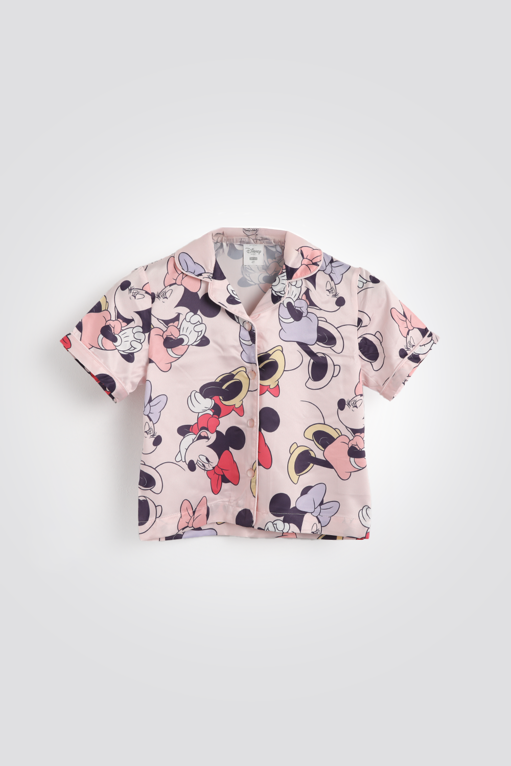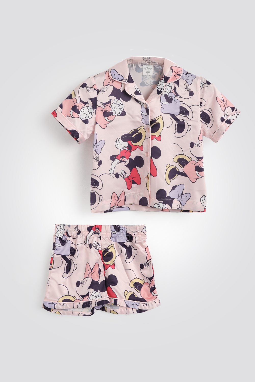 סט פיג'מה מכופתרת לילדות מבית המותג DELTA העשויה בשילוב בד סאטן נעים עם הדפס צבעוני של מיני מאוס. חולצה מכופתרת עם צווארון משולשים ושרוולים קצרים, ומכנסיים קצרים עם גומי במותניים ושרוכי קשירה.