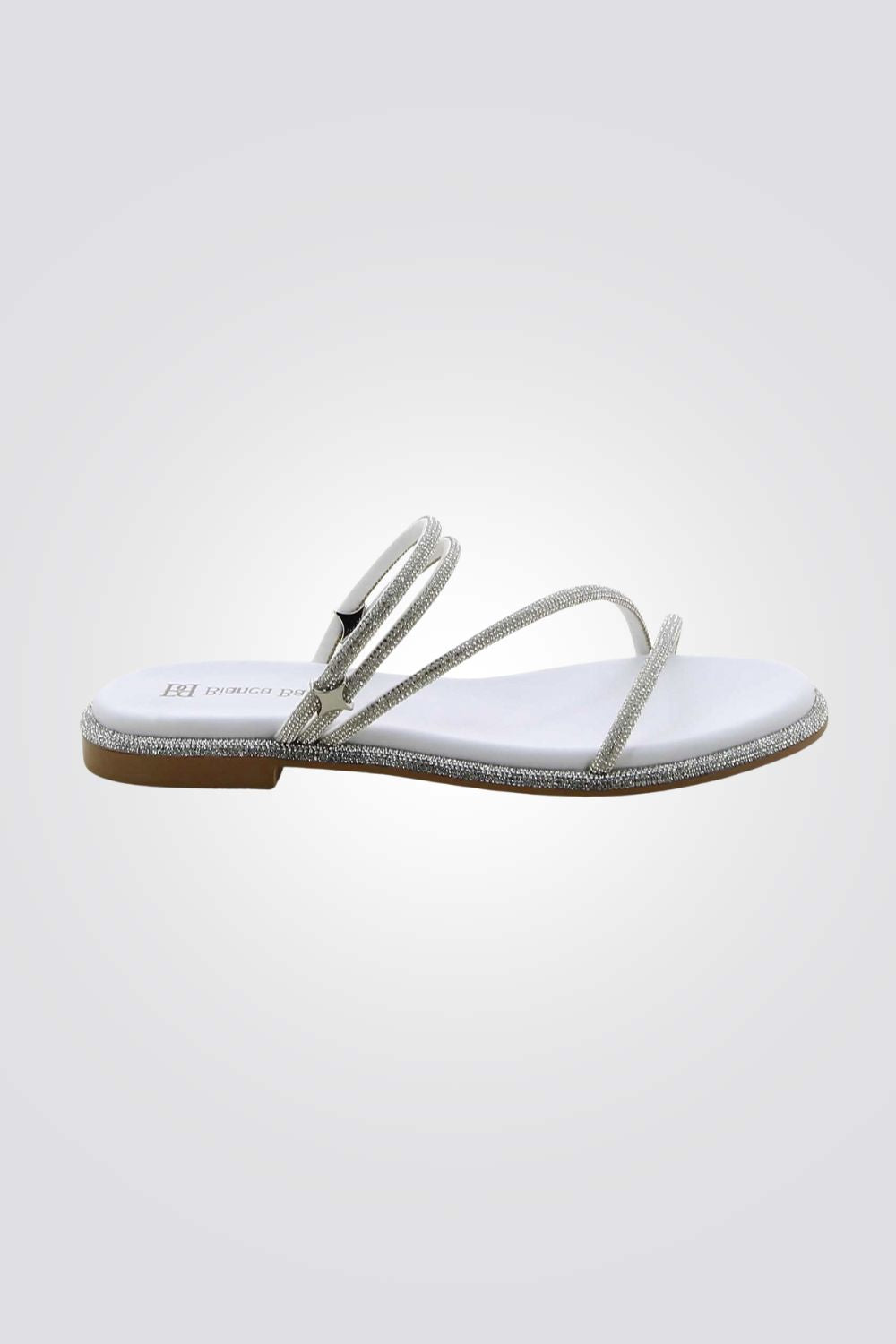 כפכף רצועות לנשים מבית המותג BIANCA BALTI, בצבע לבן, עם רצועות משובצות אבנים, נוחות ואופנתיות.