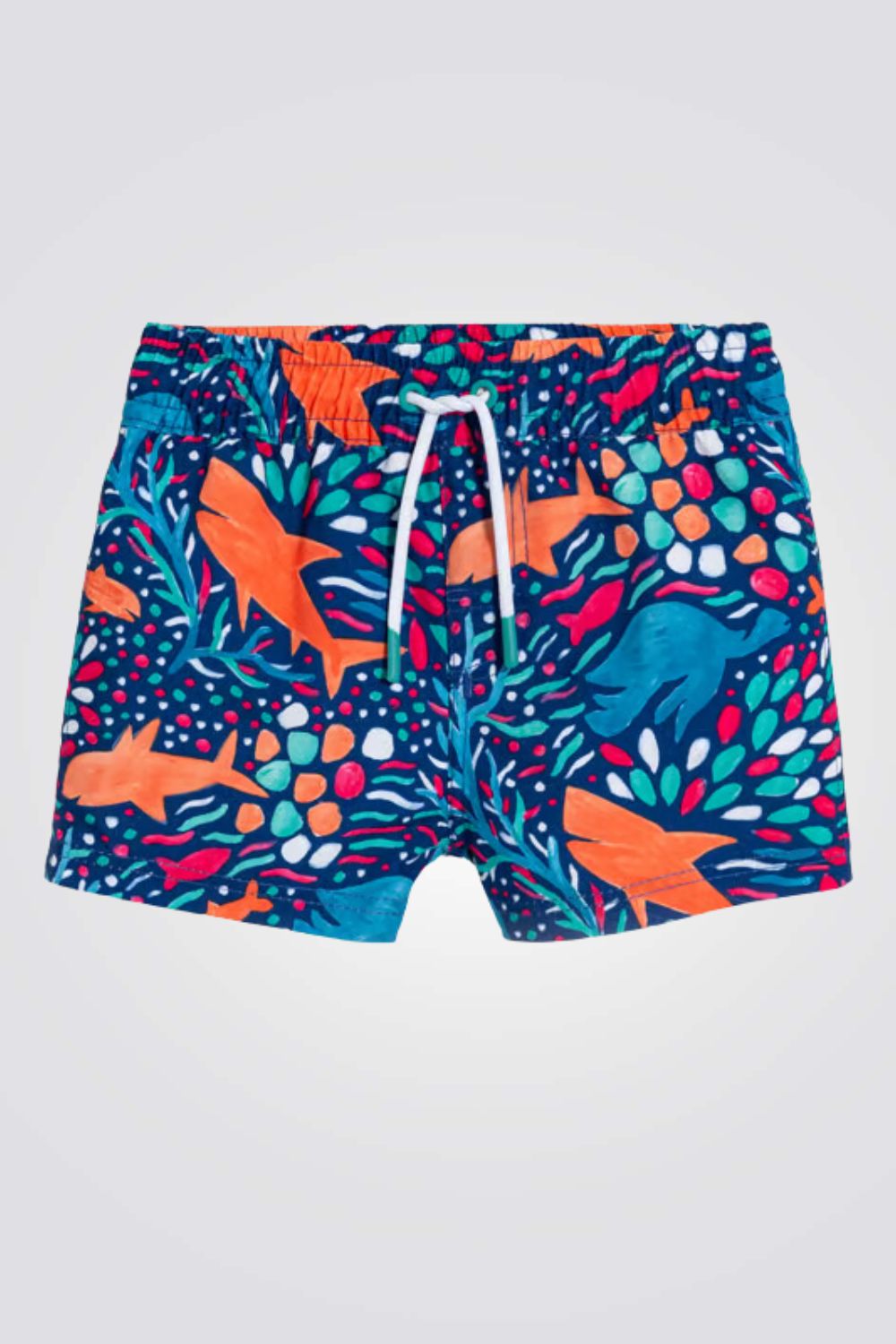 מכנס בגד ים לתינוקות מבית המותג OBAIBI, בצבע כחול עם הדפס כרישים , בד המתייבש במהירות, שרוך סגירה קידמי ומותן אלסטית .