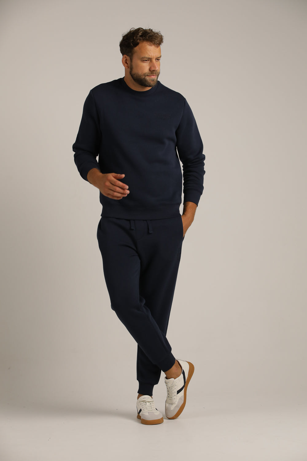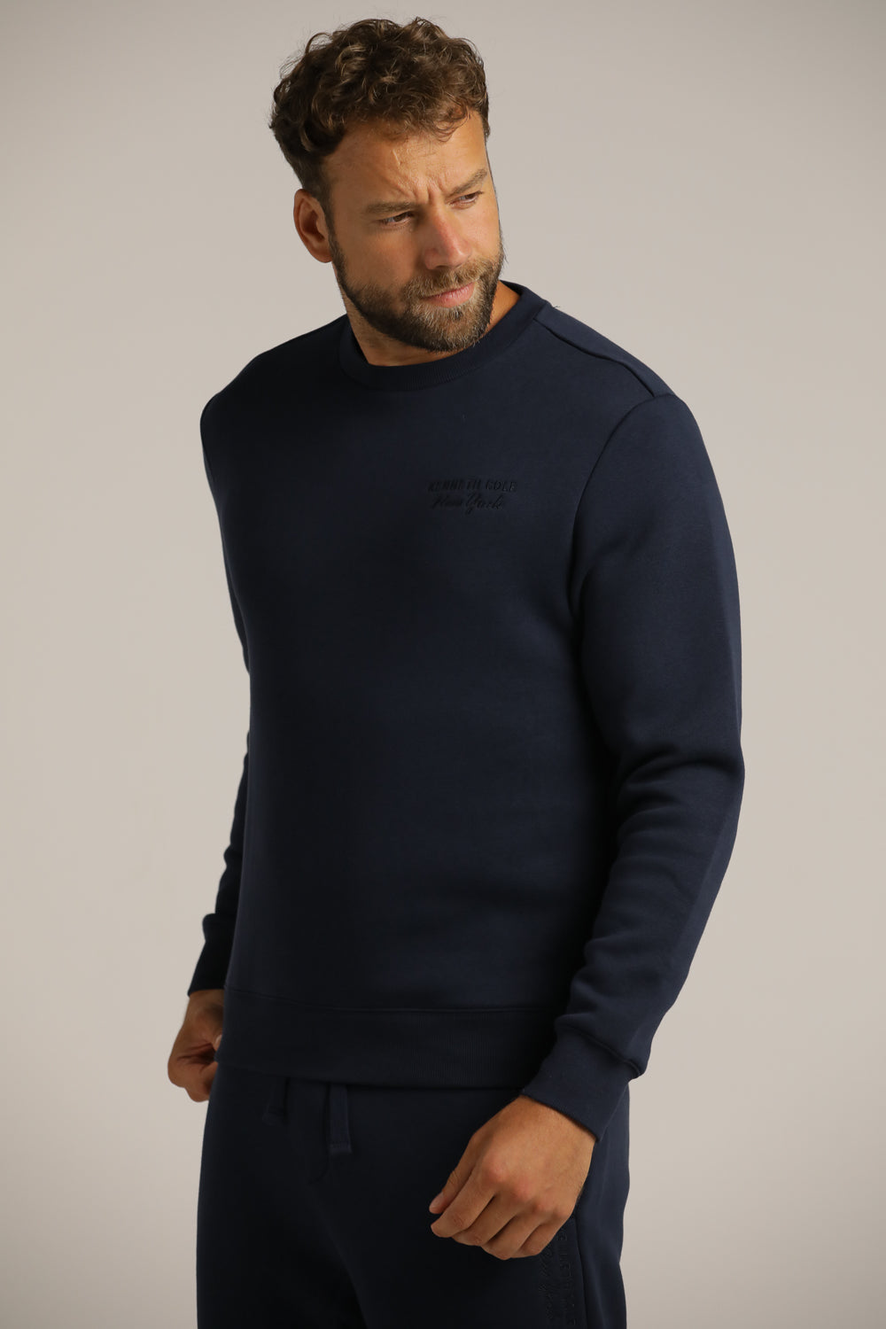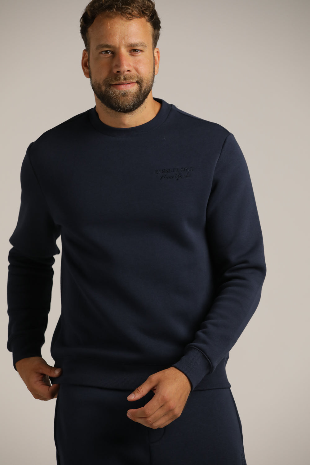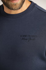 סווטשירט מבית המותג KENNETH COLE לגברים בצבע נייבי, מתאים לימים הקרים ולשימוש יומיומי, מחמם ונעים למגע, מכיל שרוולים ארוכים אם סיומת ריב, צווארון עגול ולוגו המותג בחזית.