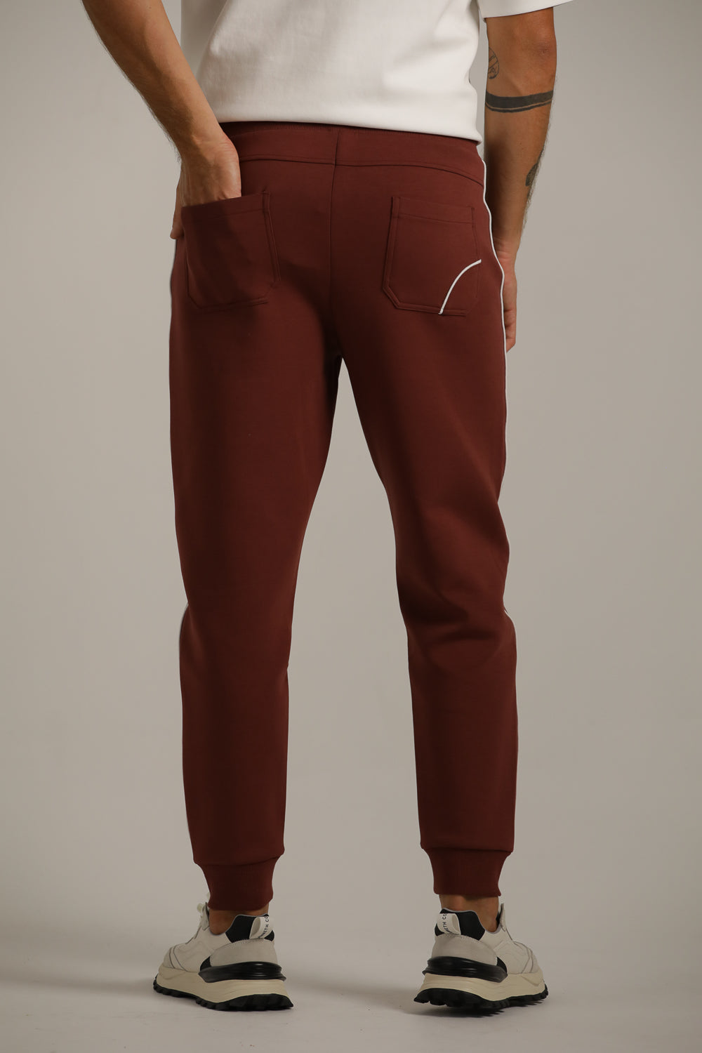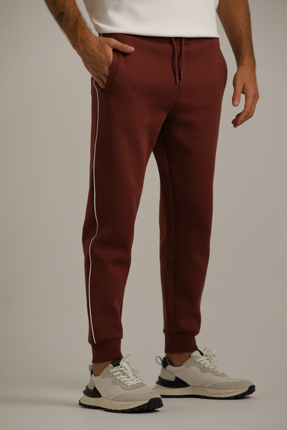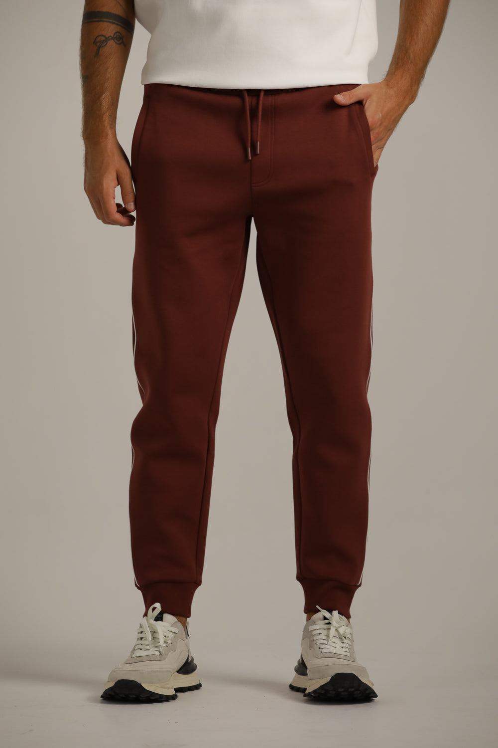 מכנסי ג'וגר מבית המותג KENNETH COLE לגברים בצבע בורדו, עשויים מבד אינטרלוק איכותי ונעים למגע, בגזרת טייפר מתחדדת, בעלי גומי אלסטי במותן ושרוך לקשירה, פס דק לבן בכל צד, כיסים מקדימה ומאחורה וסיומת גומי צמודה בקרסוליים.