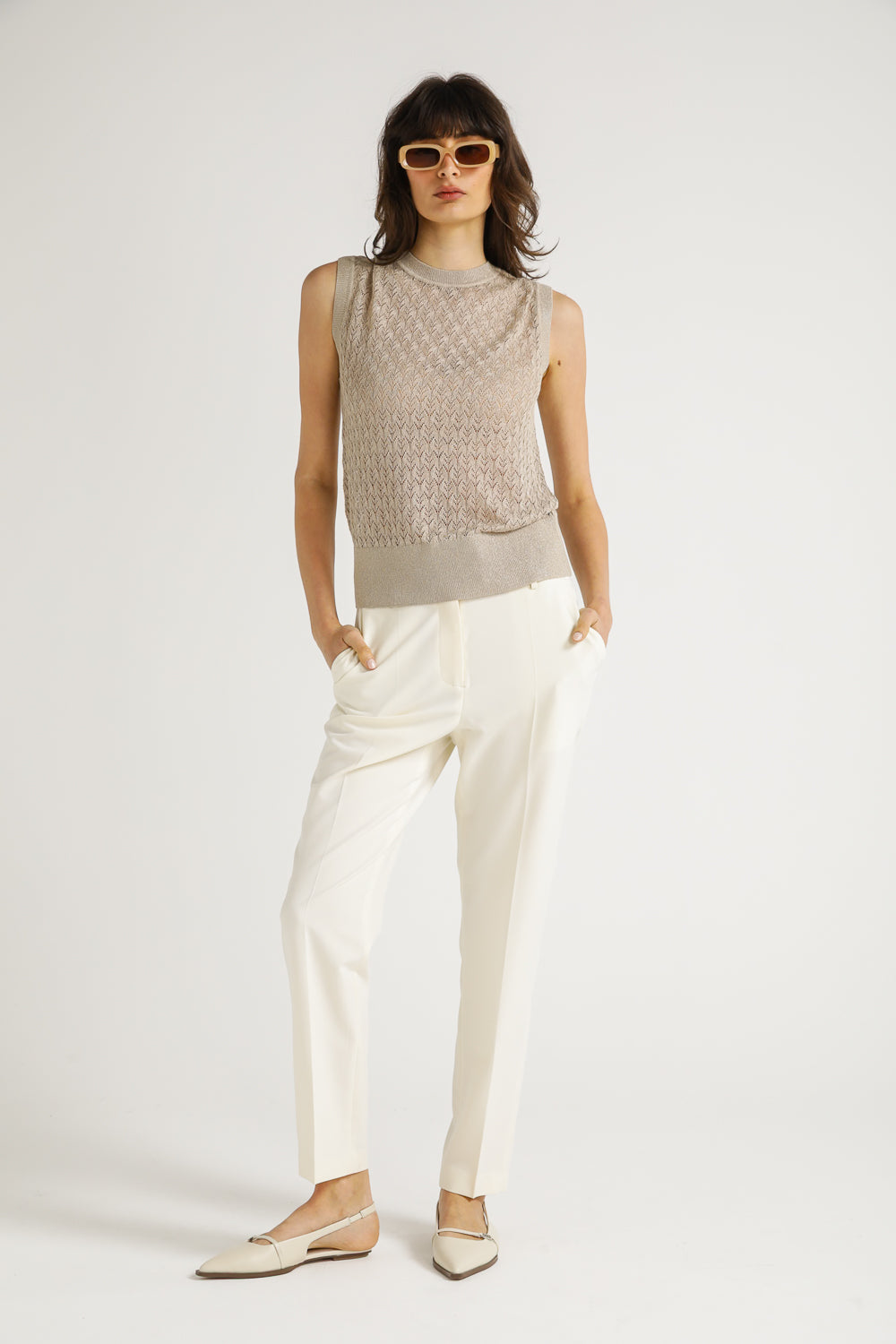 חולצת סריג מבית המותג KENNETH COLE, ללא שרוולים, בגזרה מחמיאה ונוחה, עם טקסטורה מחוררת שיוצרת מראה אלגנטי וקליל. עשויה מבד נעים למגע עם גימורי ריב בצווארון ובמכפלת.