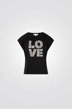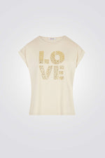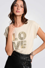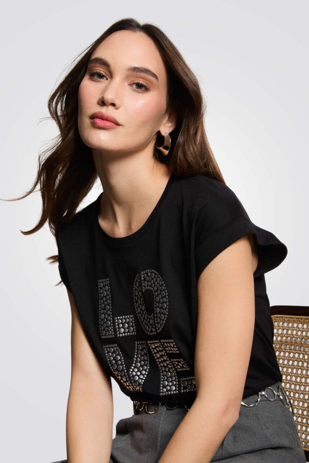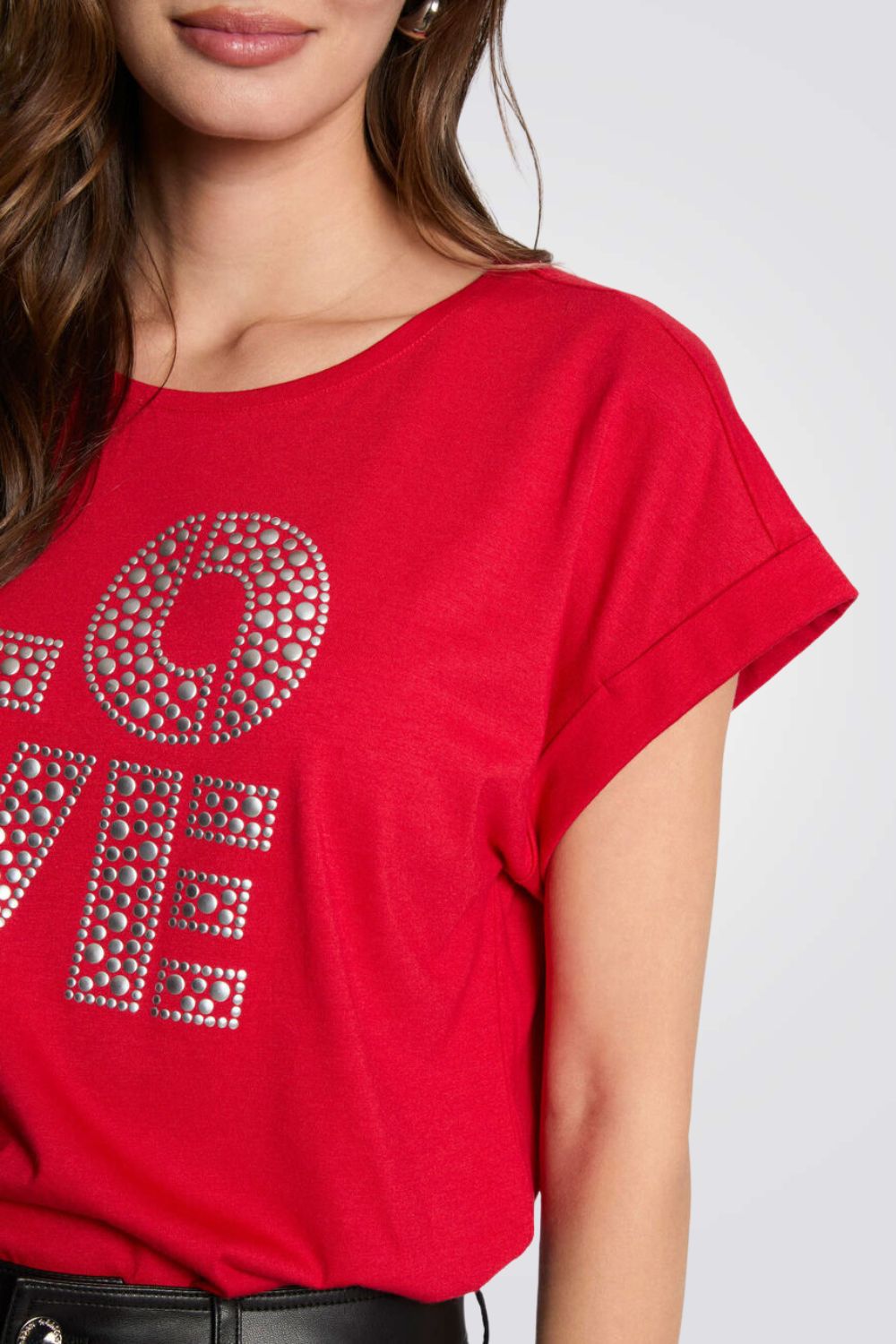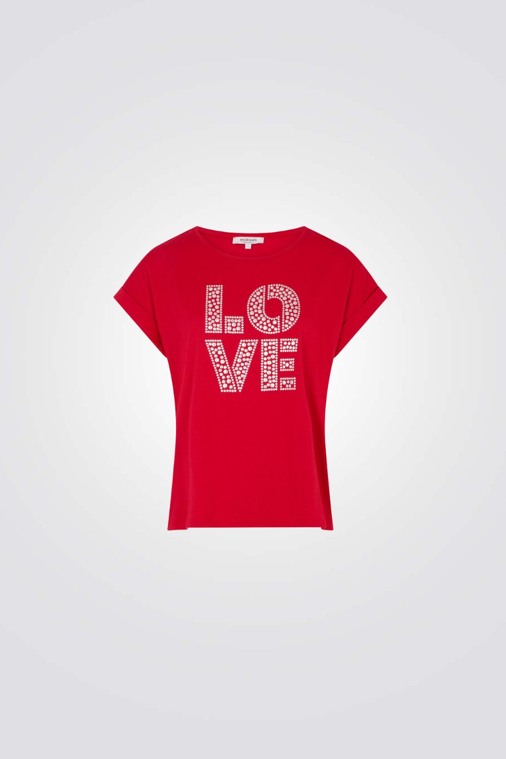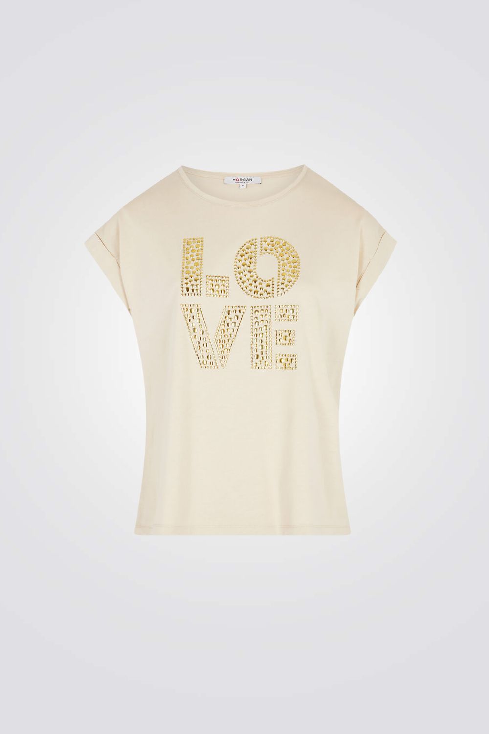 טישירט לנשים מבית המותג MORGAN, עם כיתוב LOVE בחזית בשילוב עיטור ניטים, בעלת שרוולים קצרים עם מכפלות וצווארון עגול.