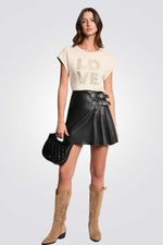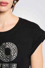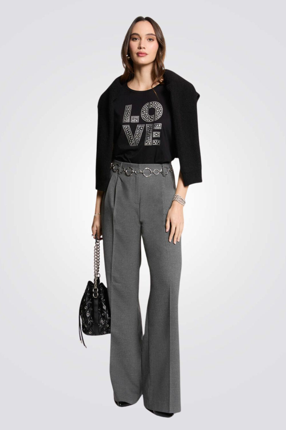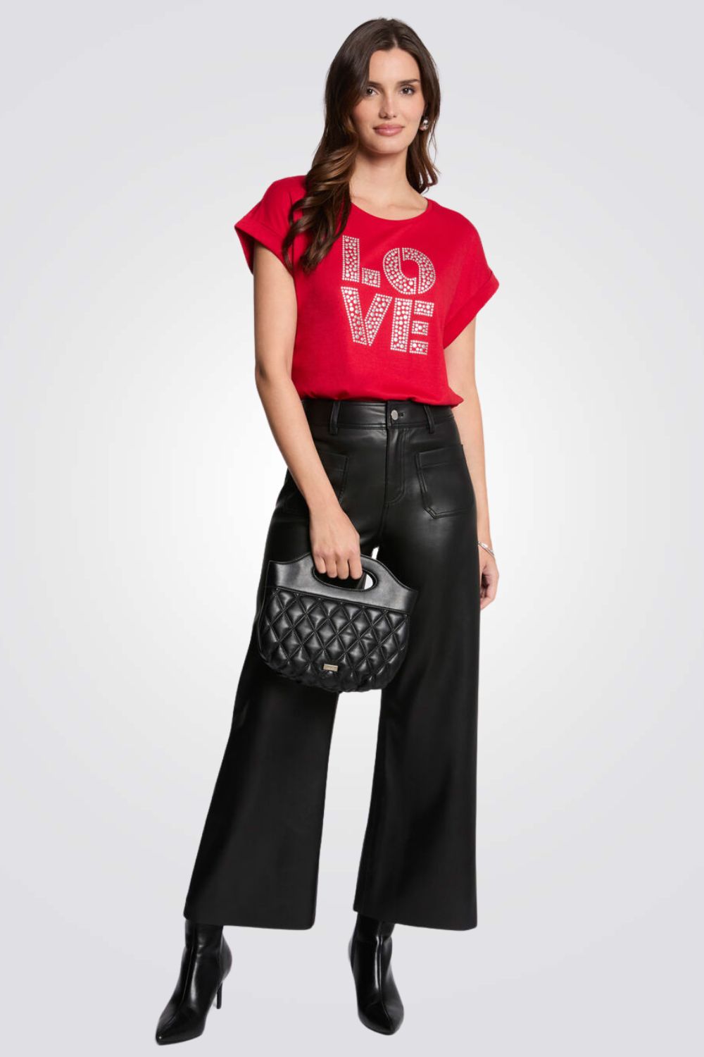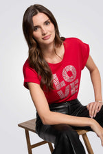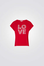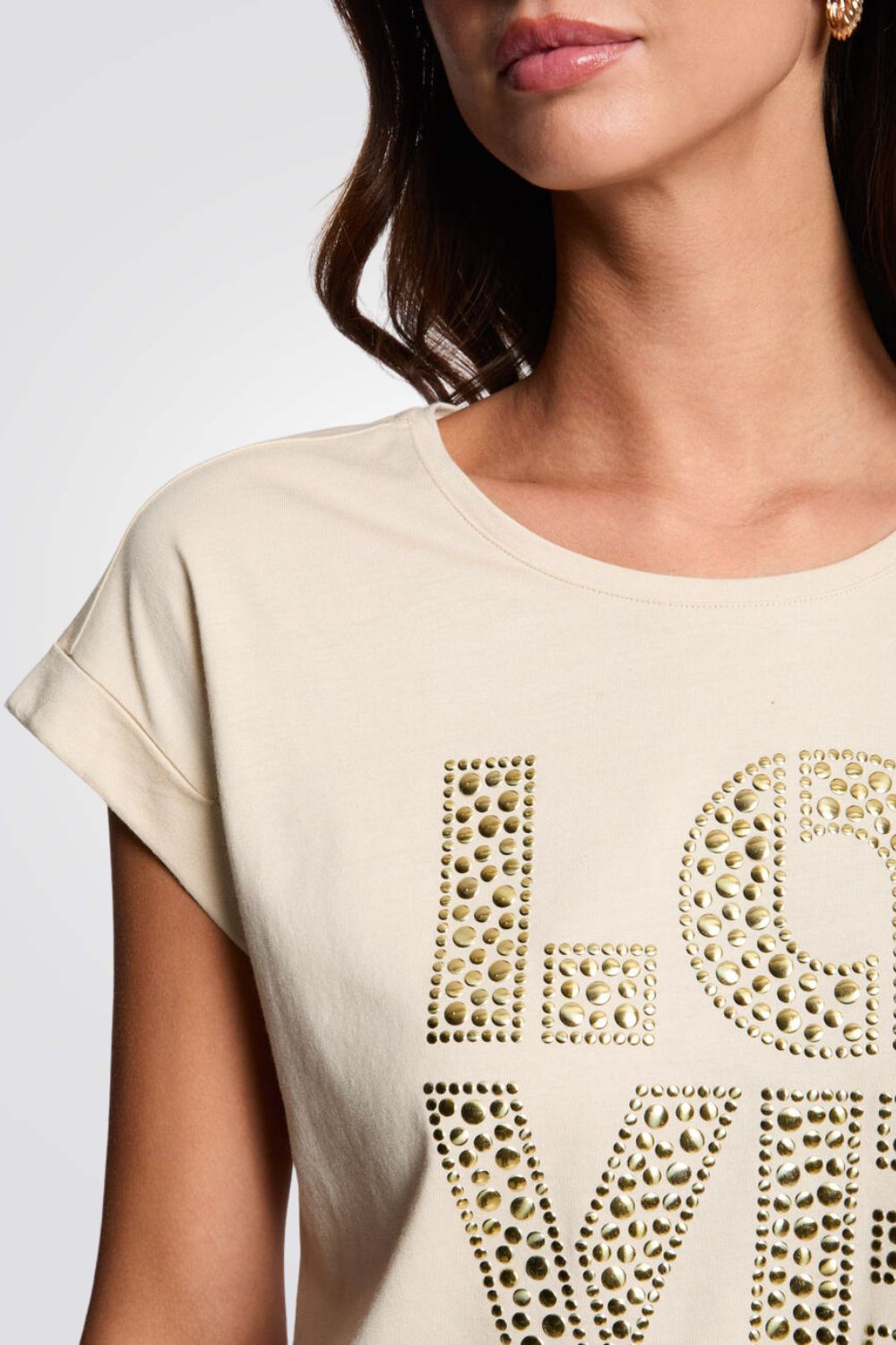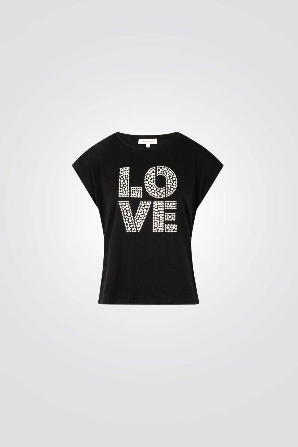 טישירט לנשים מבית המותג MORGAN, עם כיתוב LOVE בחזית בשילוב עיטור ניטים, בעלת שרוולים קצרים עם מכפלות וצווארון עגול.