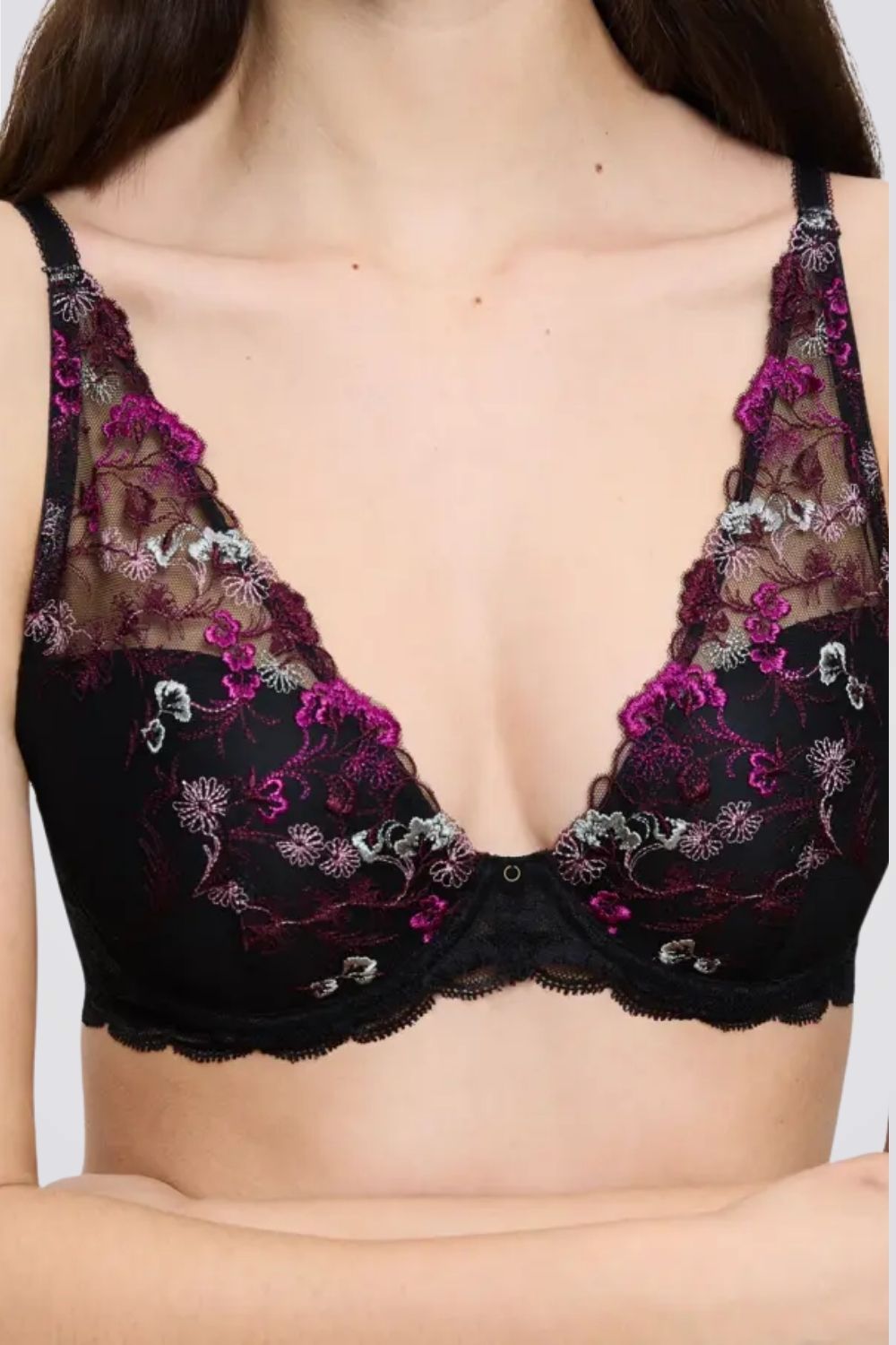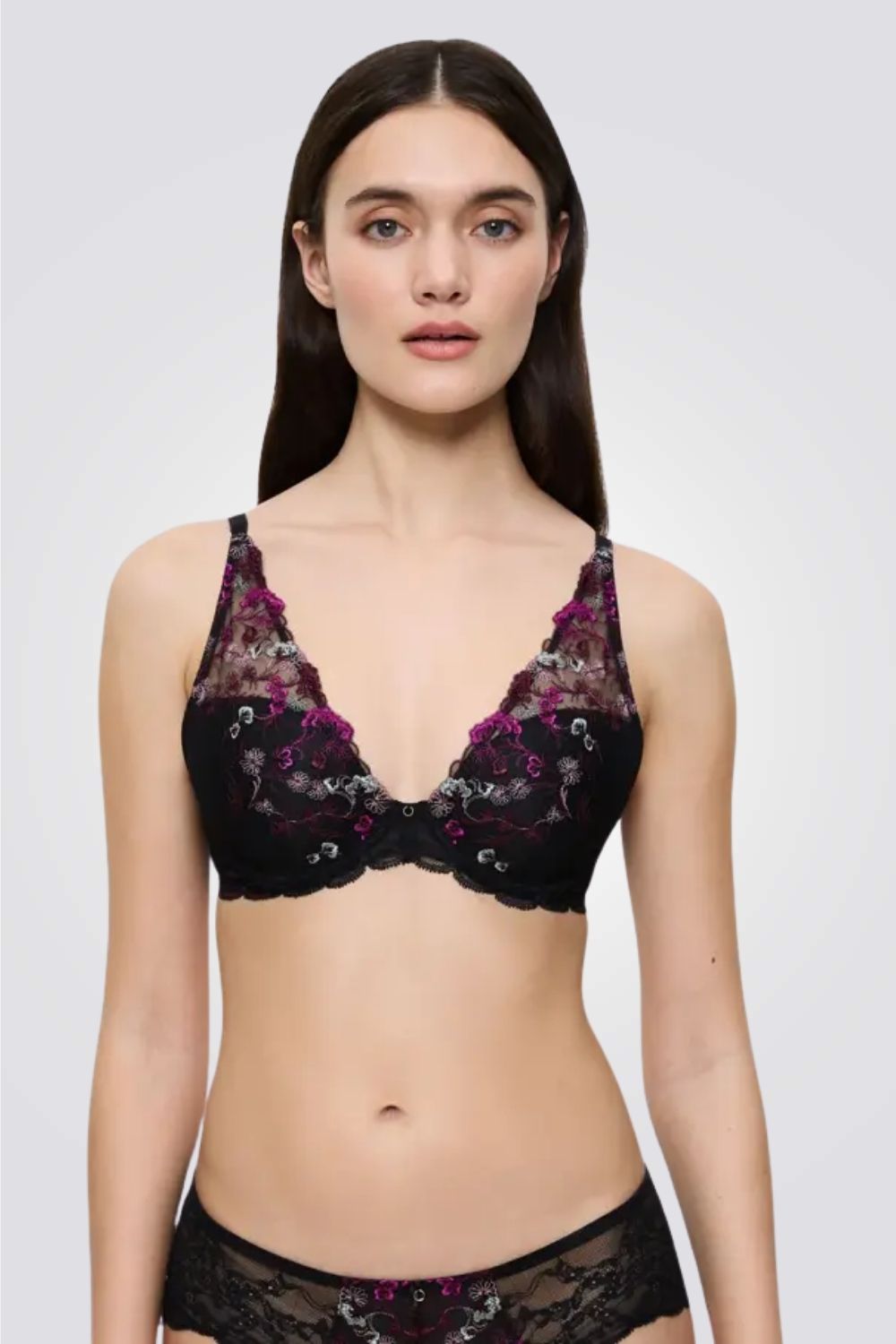חזייה מרופדת מבית המותג TRIUMPH בעיצוב מיוחד המשלב תחרה עדינה וגמישה בעלת רקמה פרחונית בכמה צבעים, קאפים נמוכים וכתפיות דקורטיביות ואלסטיות.