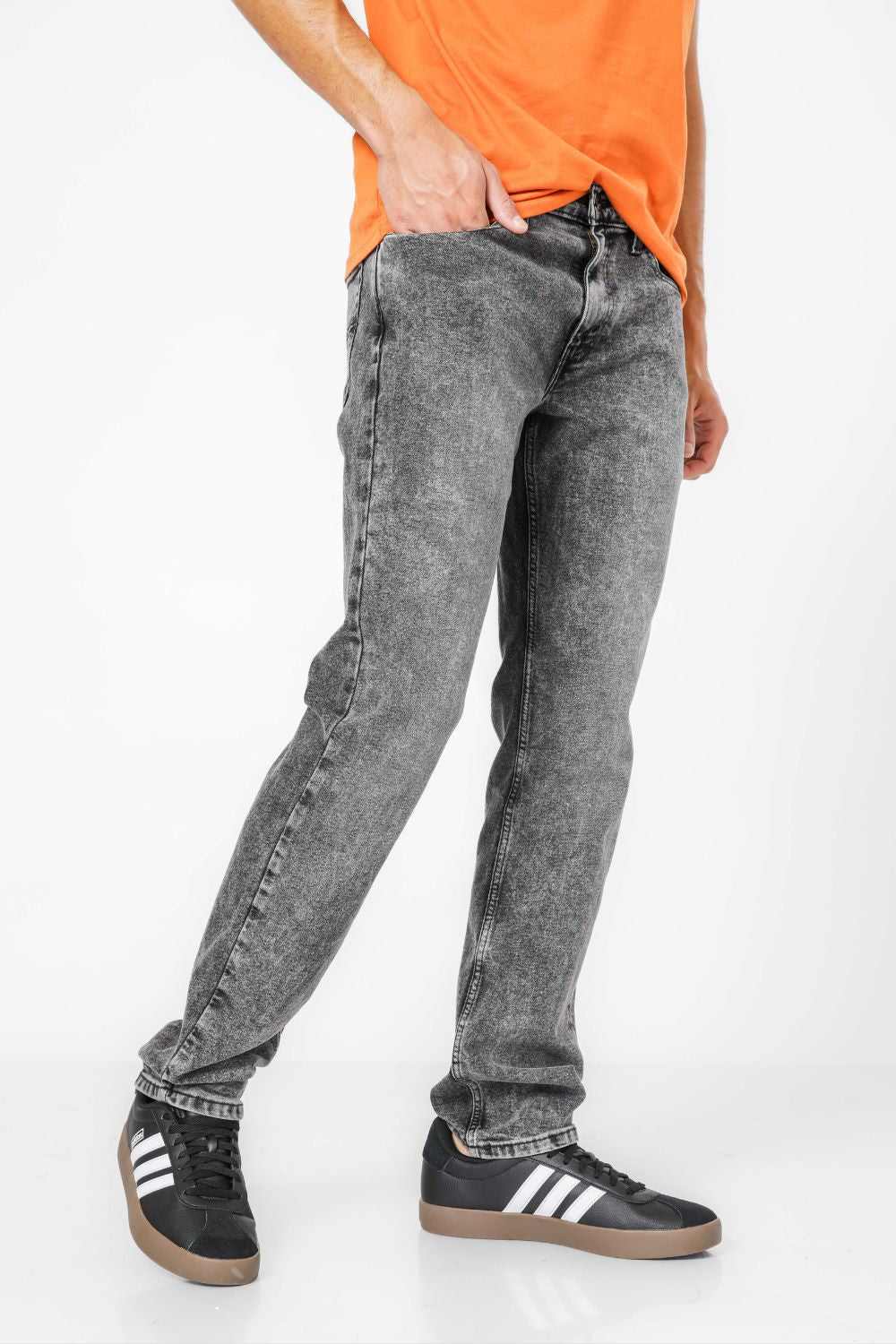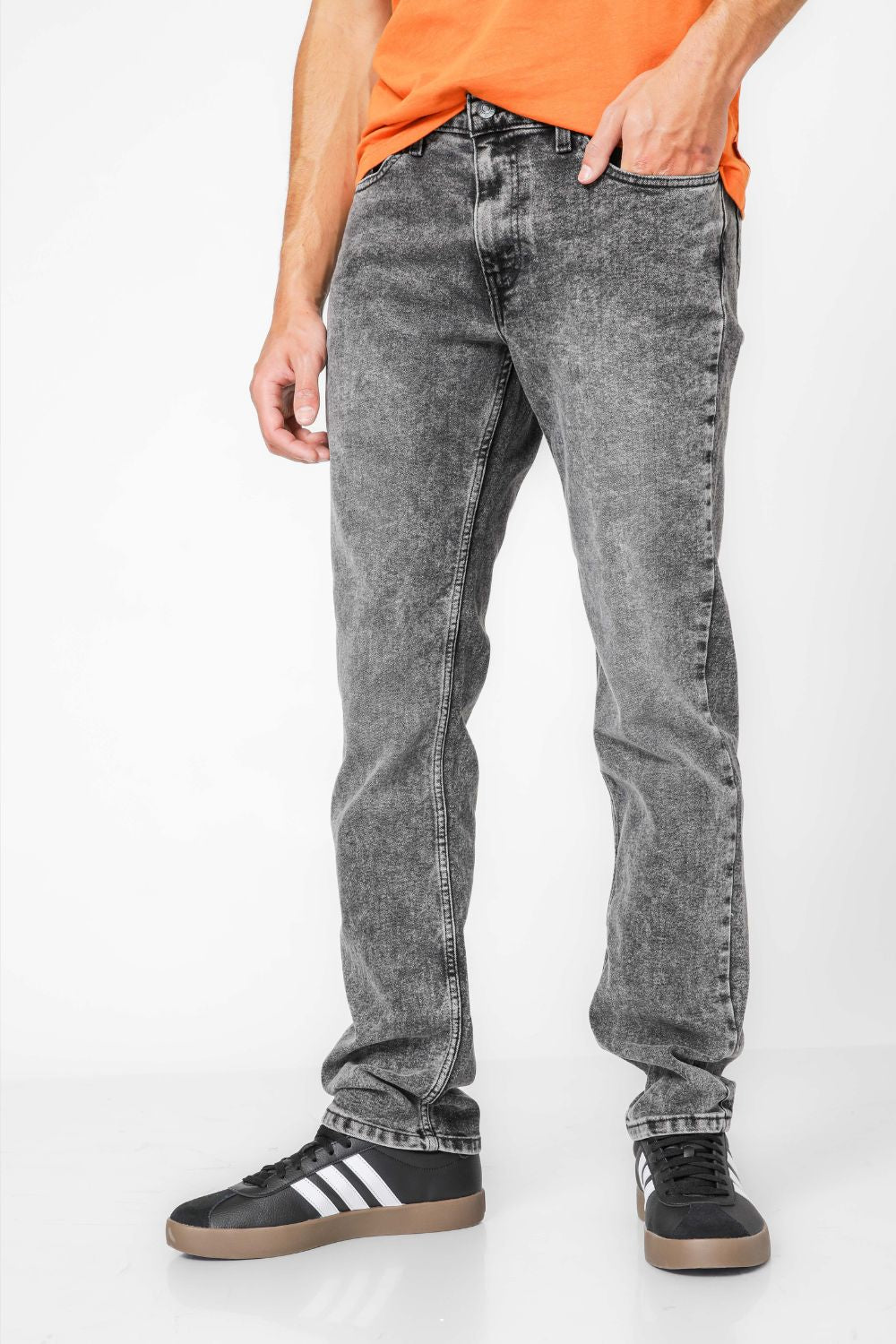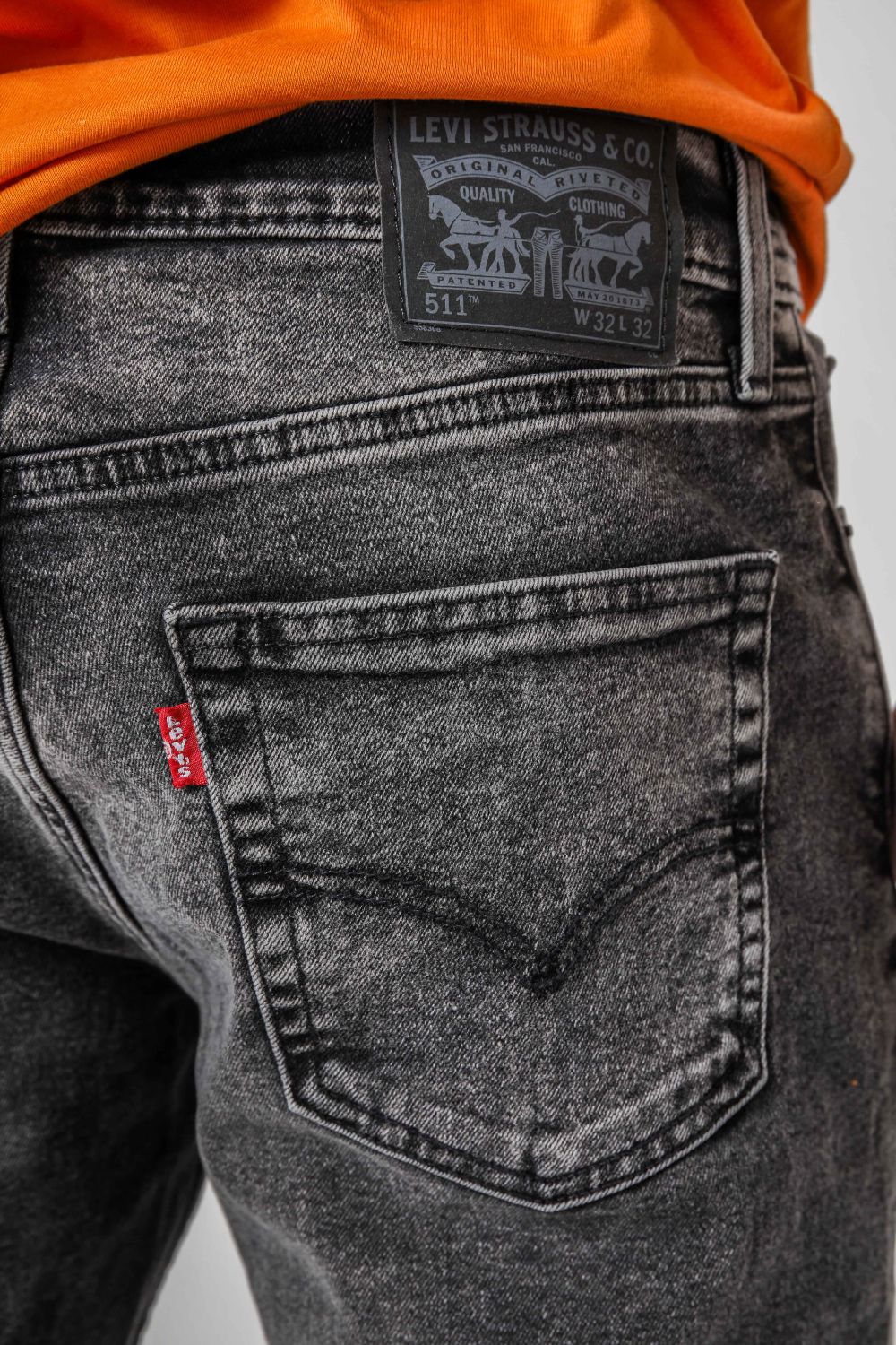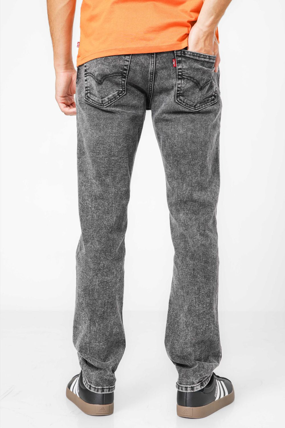 ג'ינס מבית המותג Levi's לגברים בצבע אפור, בגזרה צמודה, בגובה המותן, בעל רוכסן וכפתור לפתיחה וסגירה וכיסים קדמיים ואחוריים.