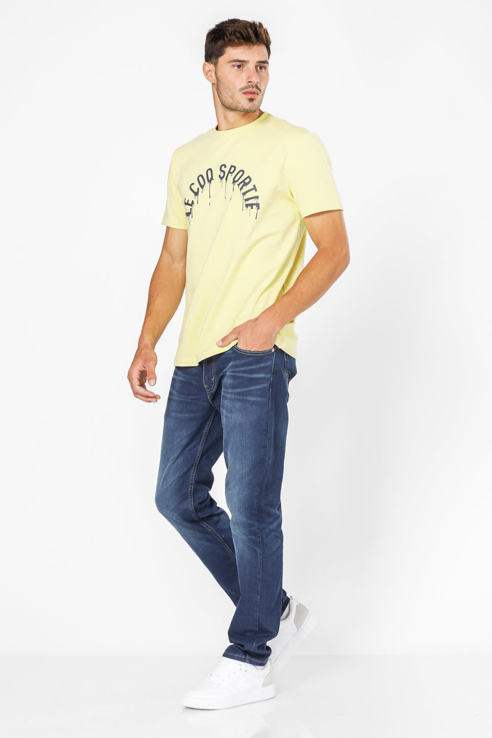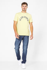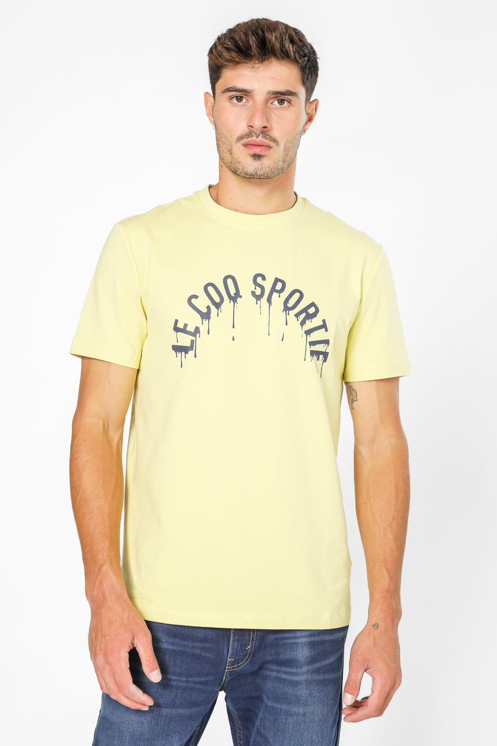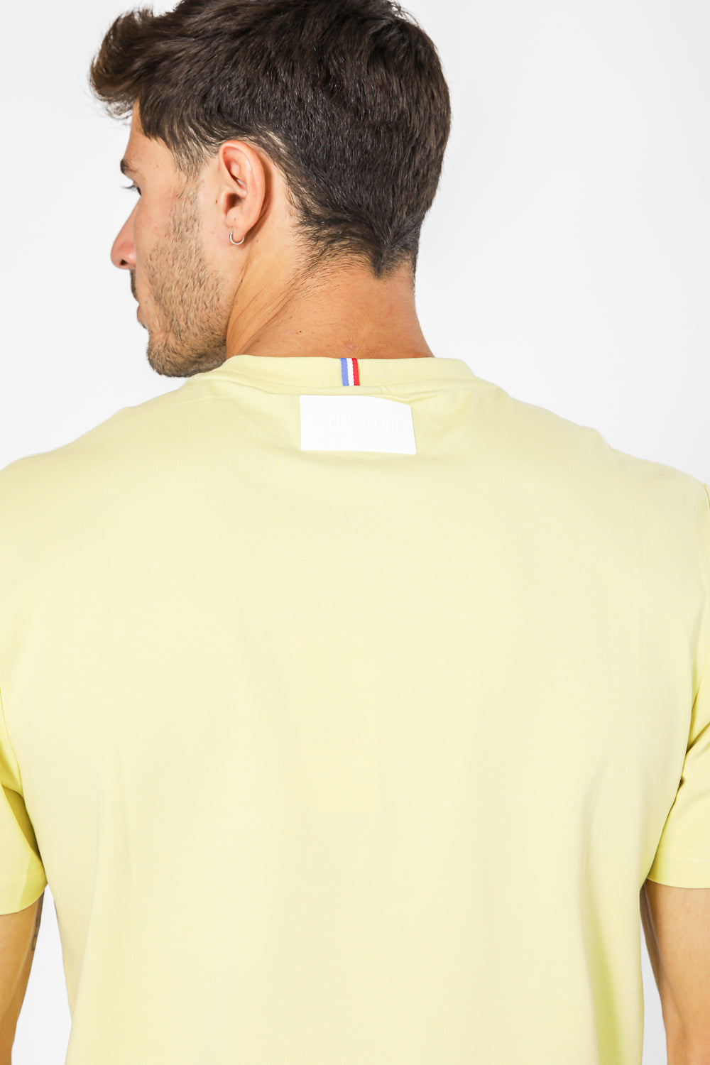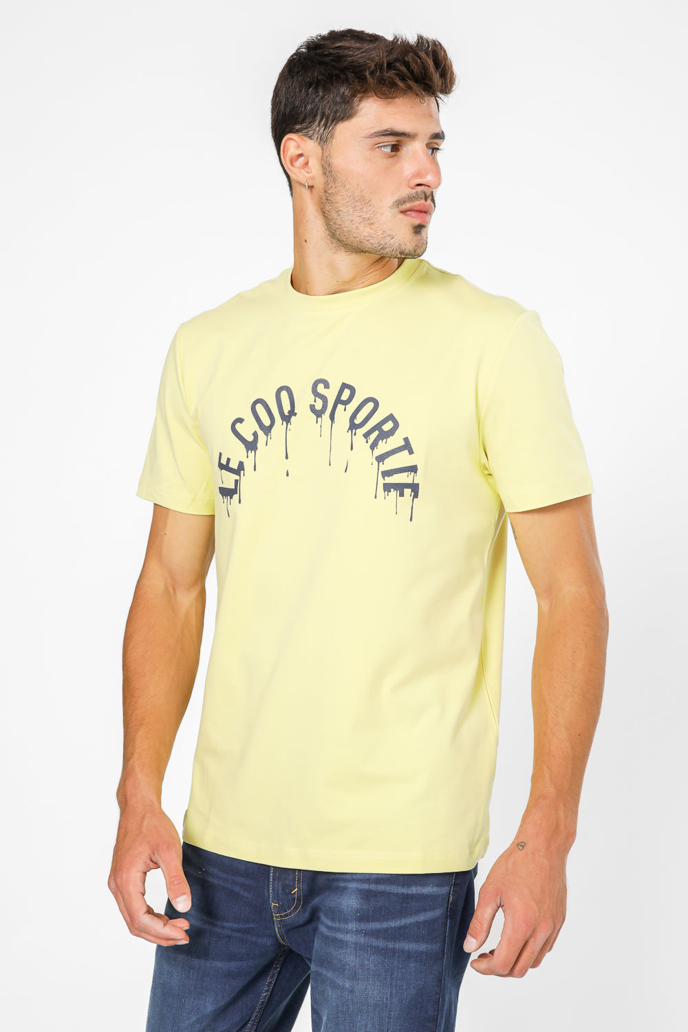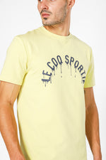 חולצת טישירט מבית המותג LA COQ SPORTIF העשויה בד לייקרה נמתח ונעים בצבע צהוב עם שרוול קצר ולוגו מודפס בצבע שחור בחזית.