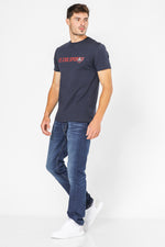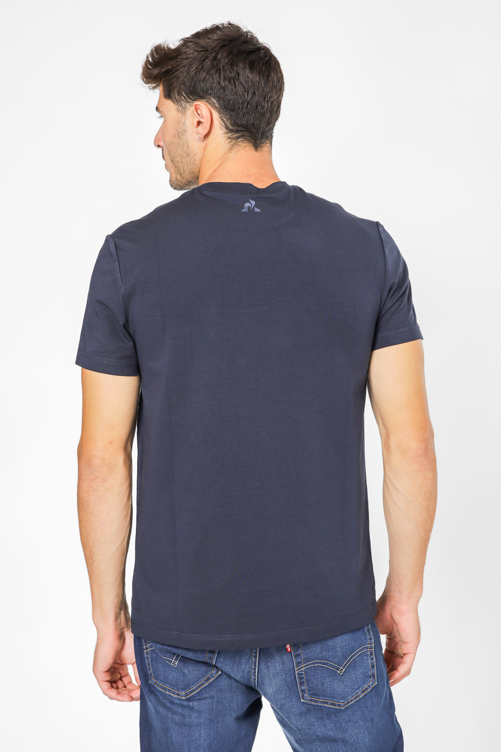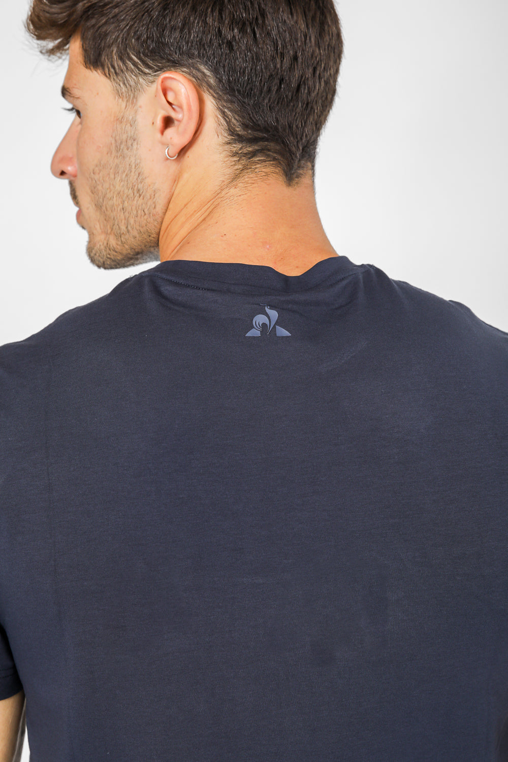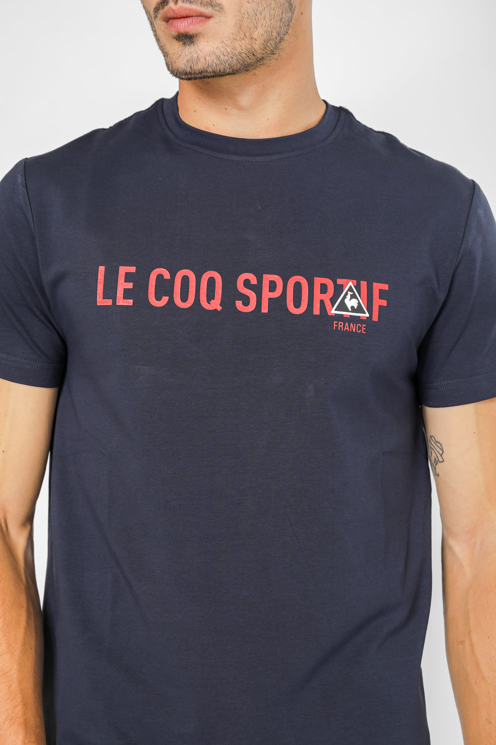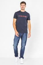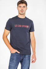 חולצת טישירט מבית המותג LA COQ SPORTIF העשויה בד לייקרה נמתח ונעים בצבע כחול נייבי עם הדפסת שם המותג על החזית.