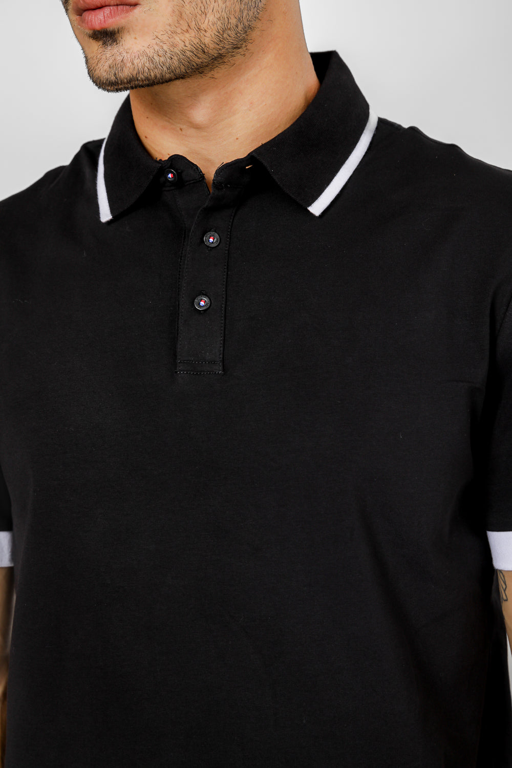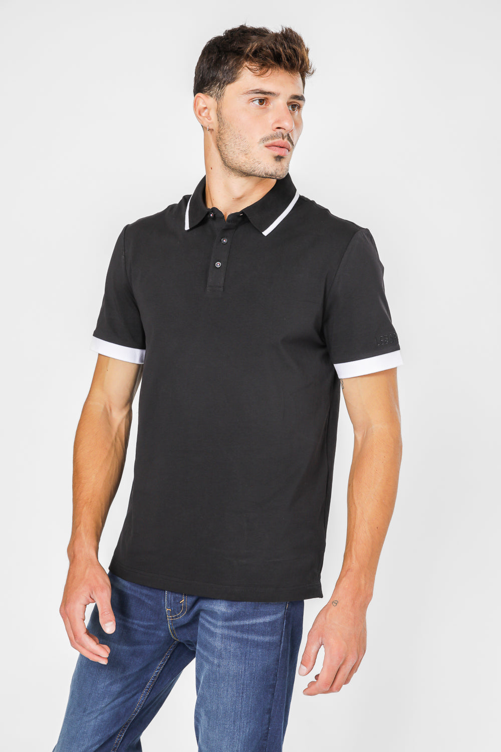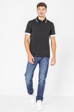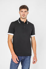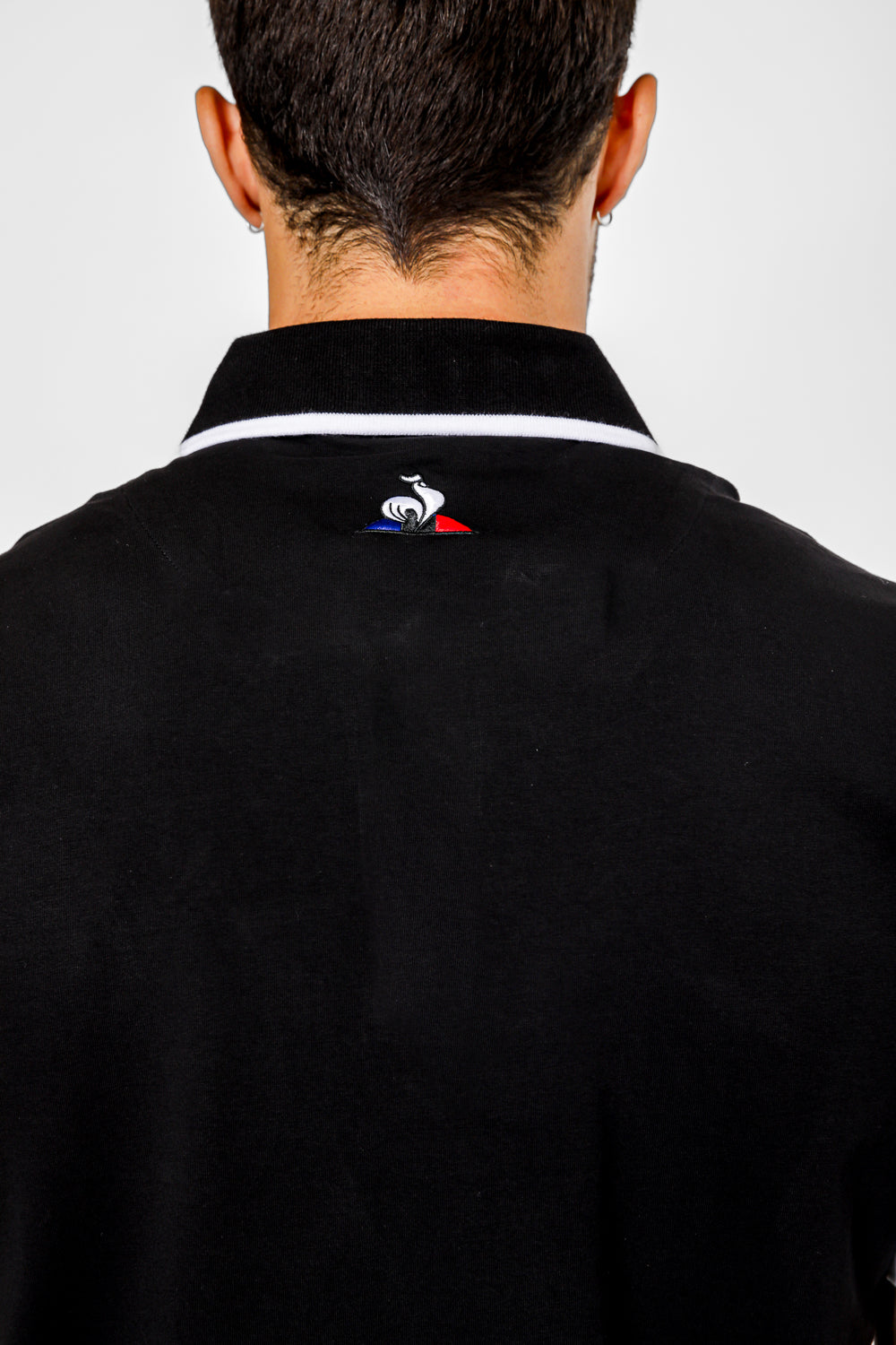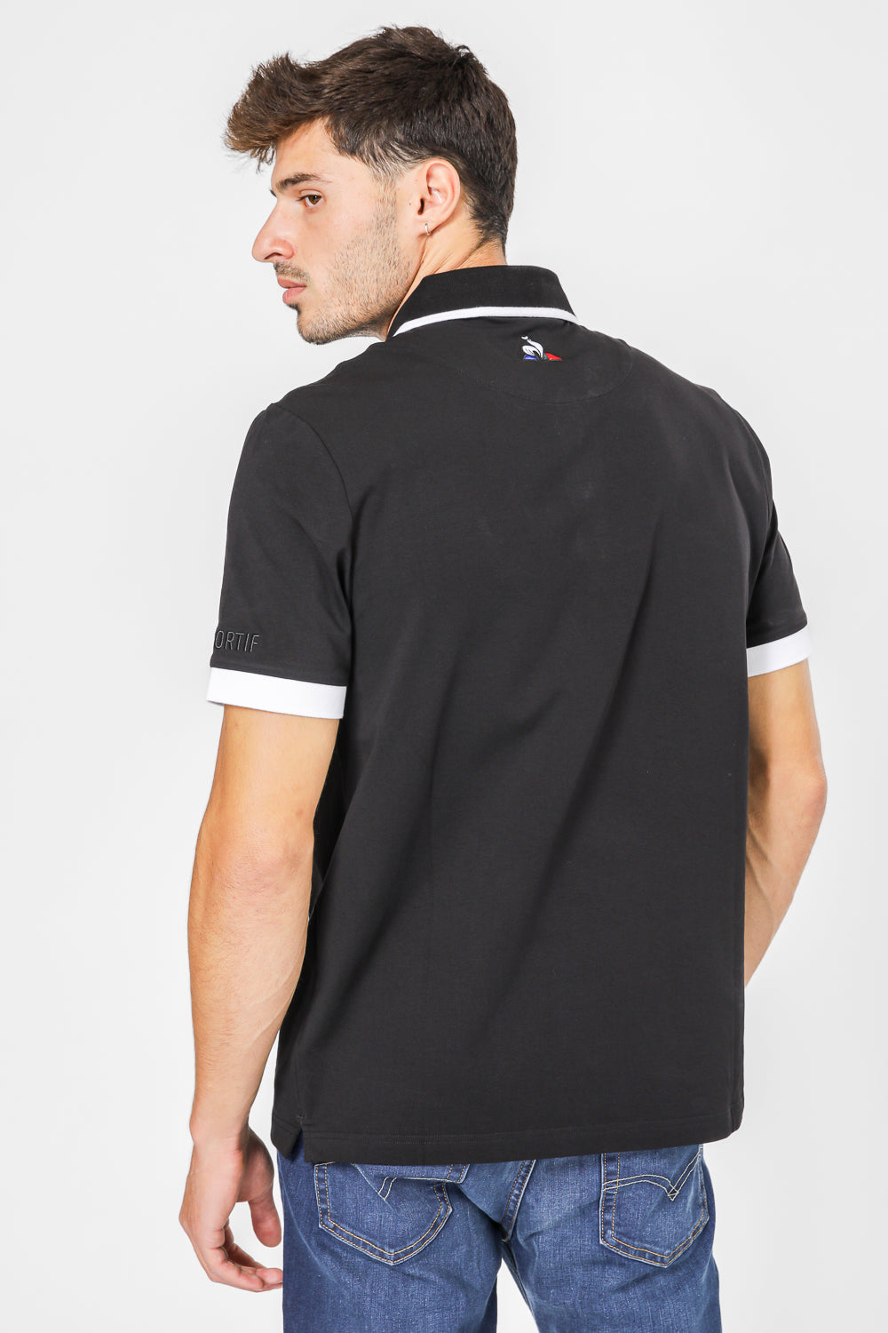 חולצת פולו לגבר מבית המותג LE COQ SPORTIF העשויה בד לייקרה נמתח ונעים בצבע שחור, צאוורון דש ופסים לבנים בשרוולים ובצאוורון.
