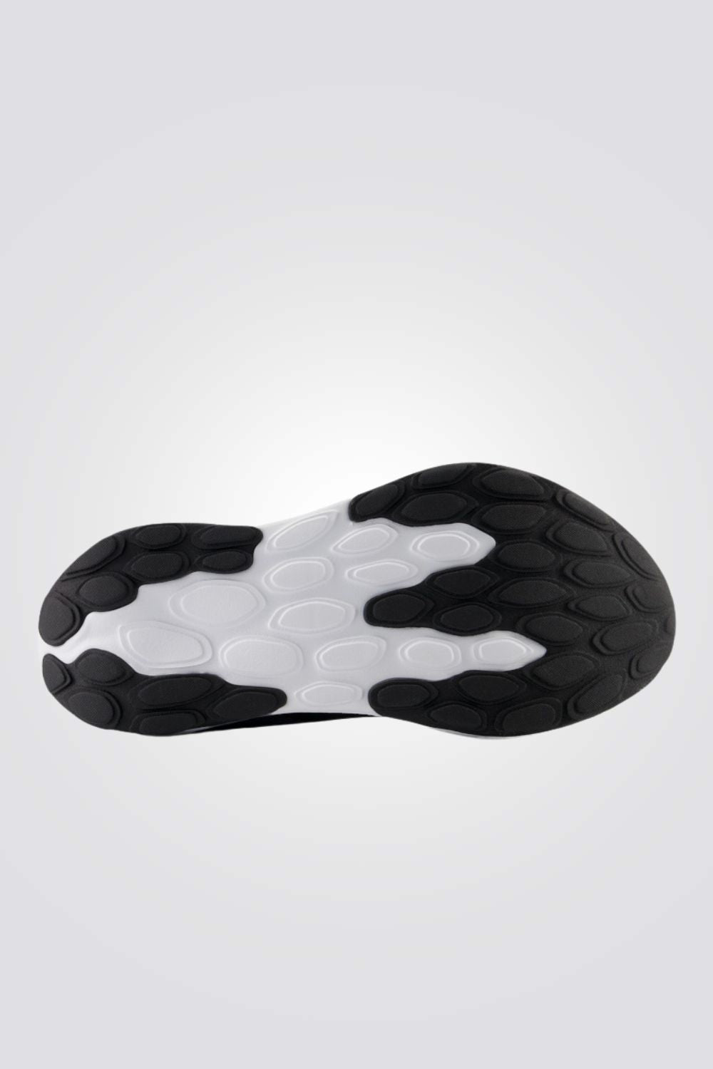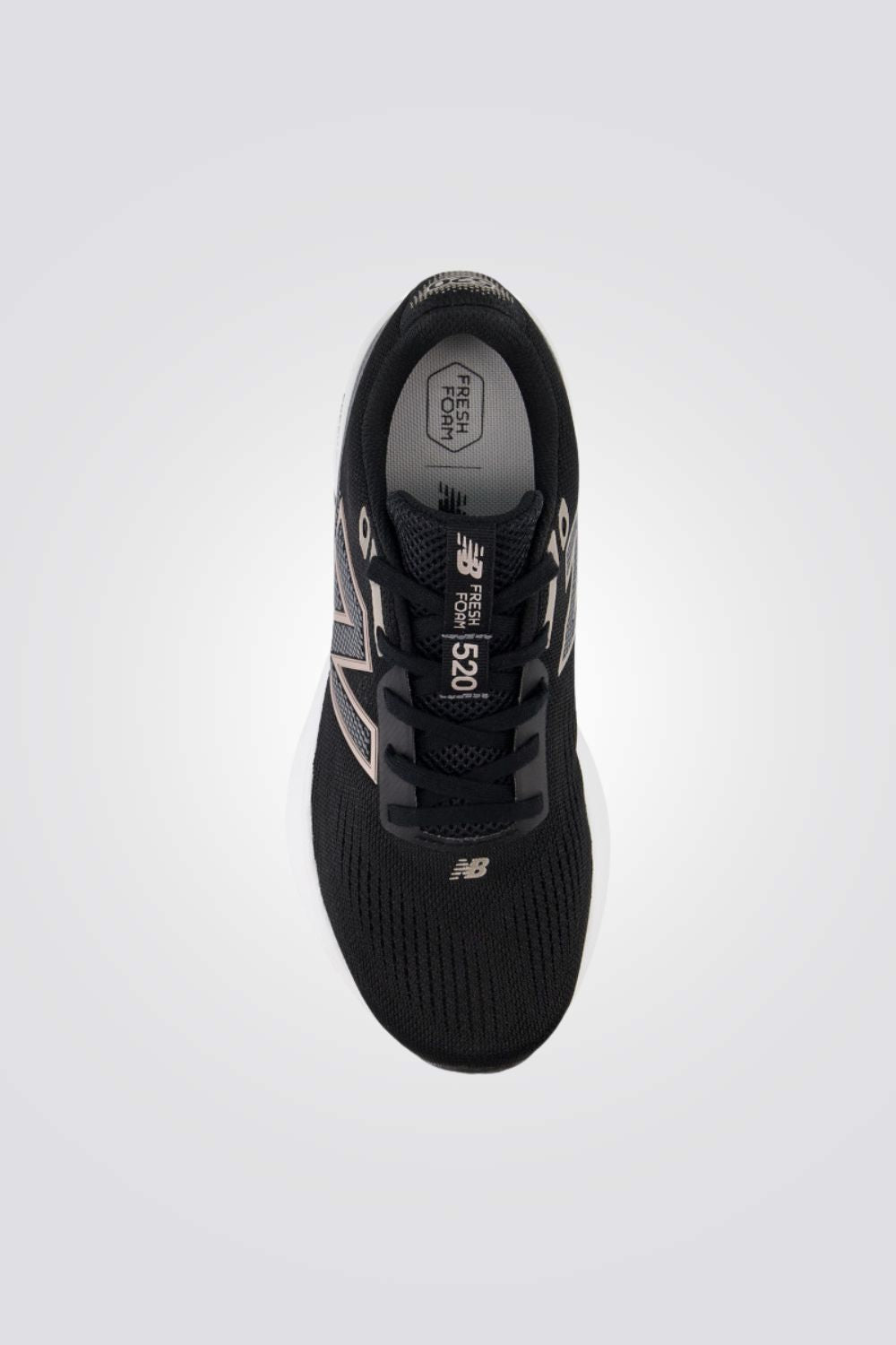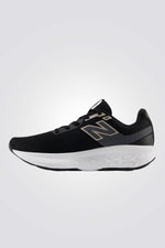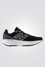 נעלי ריצה מבית המותג NEW BALANCE לנשים בצבע שחור, בעלות סוליית ביניים לבנה Fresh Foam המעניקה ריצה נוחה, גפה רשת לאוורור, שרוכים לקשירה וסמל המותג בצידי הנעל ברוז גולד.