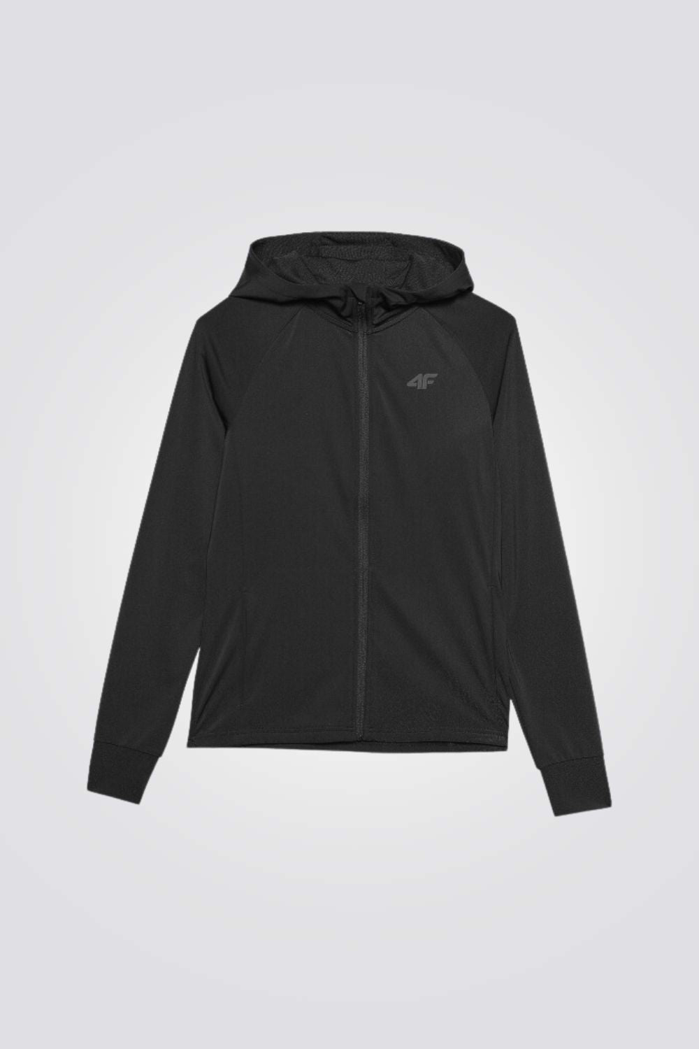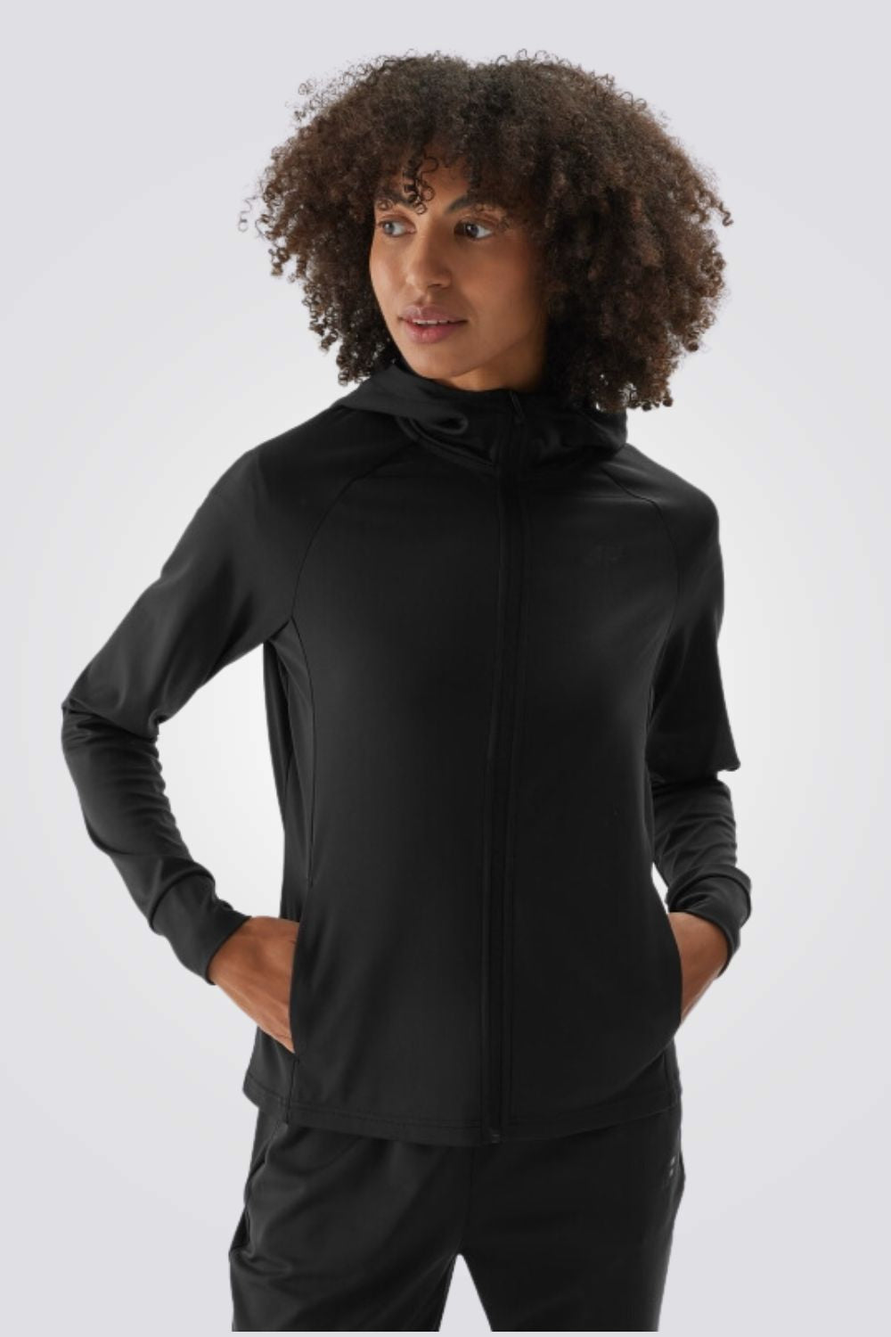 סווטשירט ספורט לנשים מבית המותג F4,בצבע שחור, קליל ונוח, מתאים לאימונים בזכות הבד מנדף הזיעה , עם סגירת רוכסן ושני כיסים צדדיים.